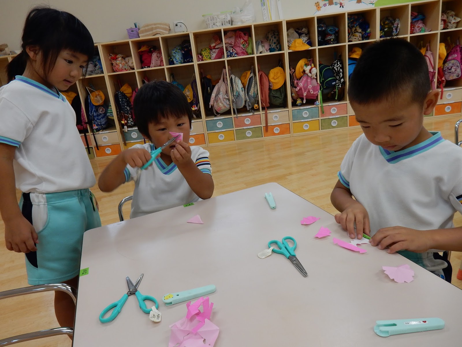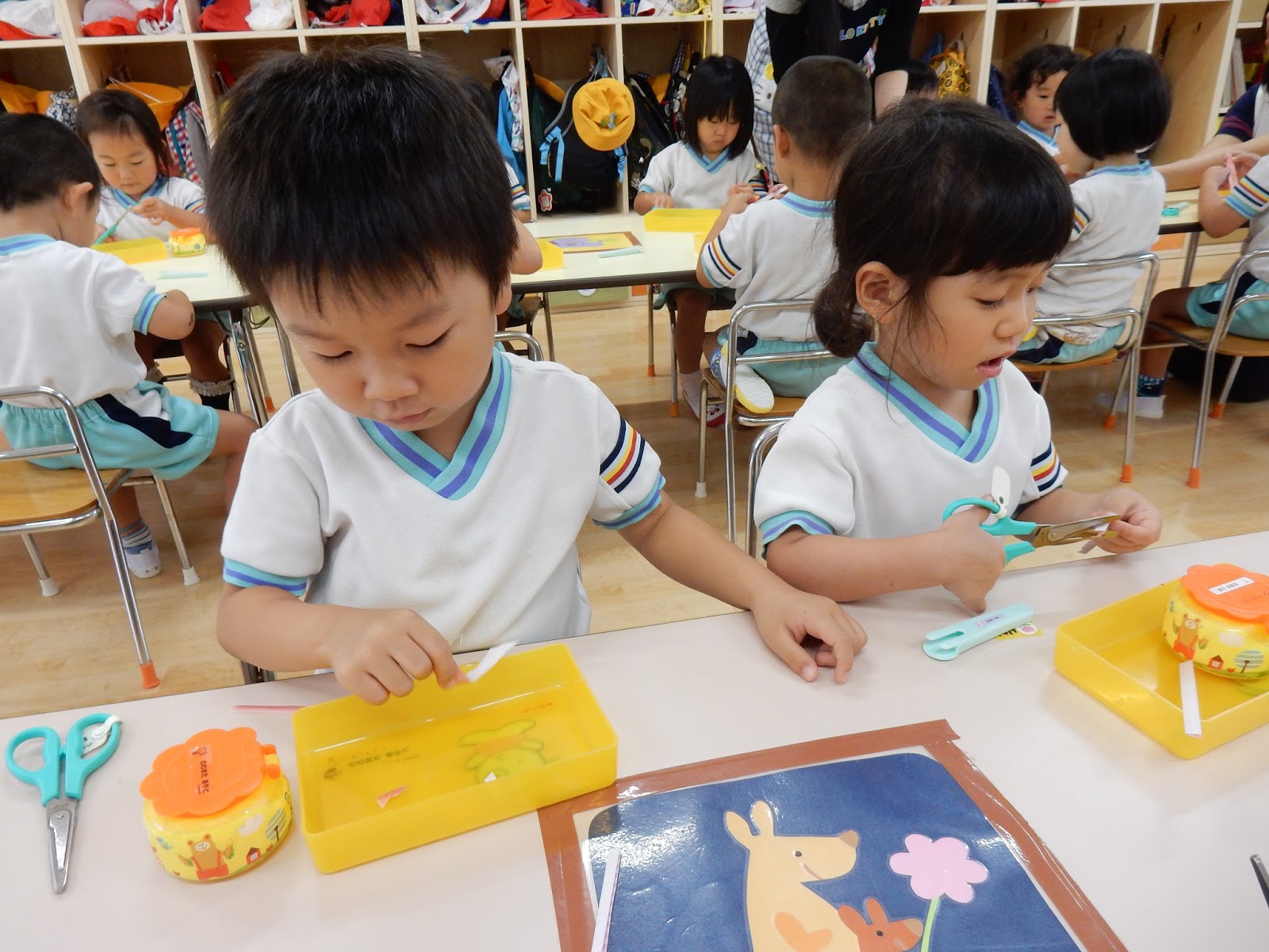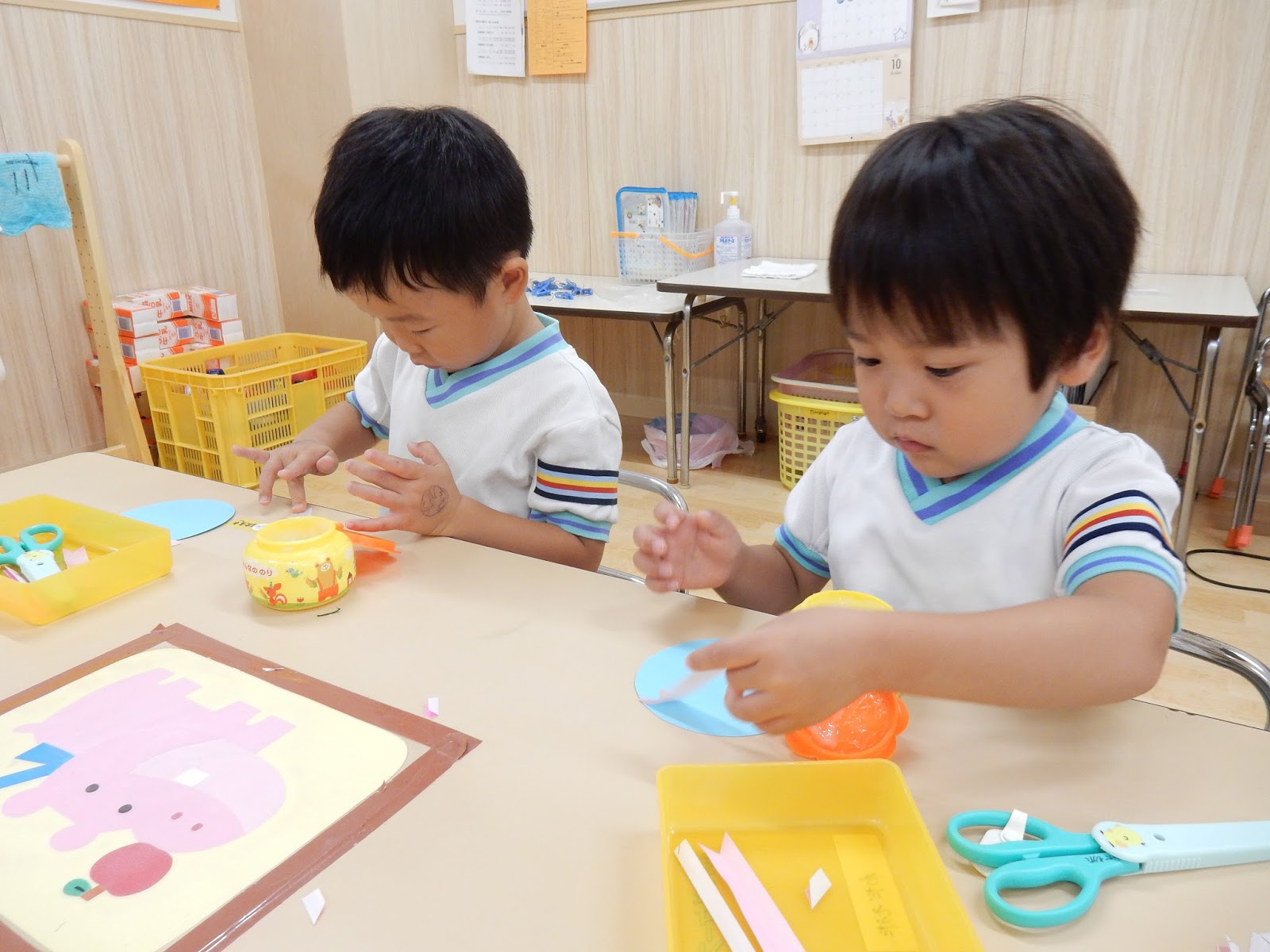 たんぽぽさんは、はさみで切って、ノリを貼って…よーく見ながら黒い線の上を切ったり、ノリで貼るのも、横向き、縦向きと方向が決まっていたんです!なかなか高度!!でも、向きを説明する時に子ども達が、「シートベルトみたい!」というとっても的確な発言をしてくれたので、とっても上手に貼れる事が出来ました!子どもの発送って、素敵ですね!