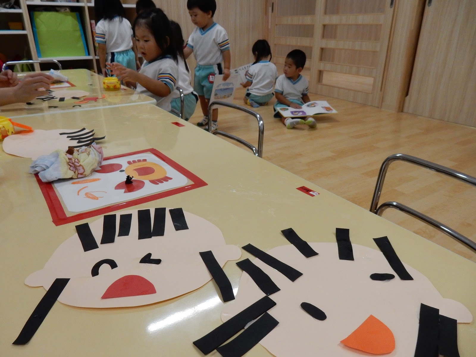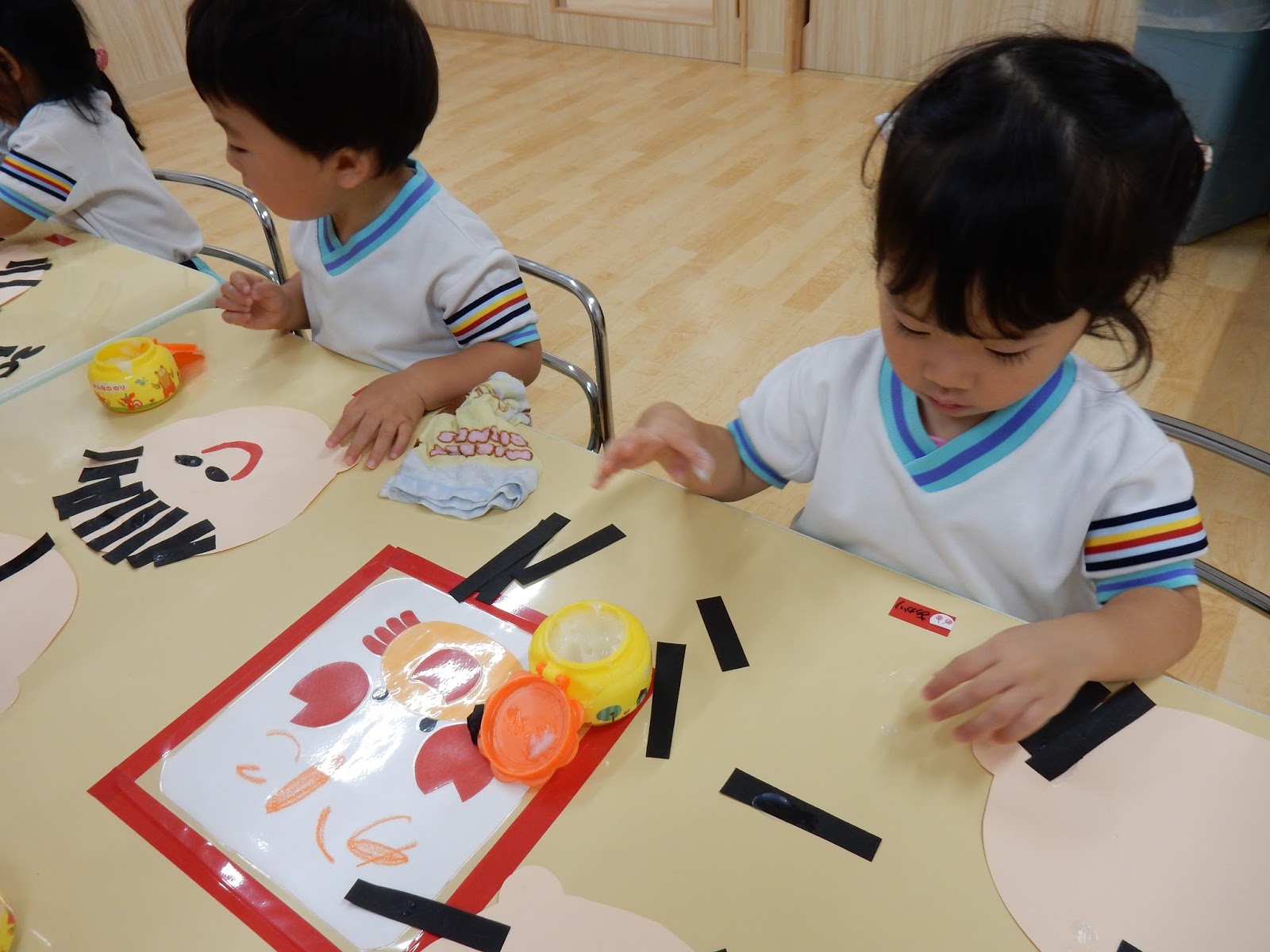すみれさんは、顔の形の画用紙に、細長い画用紙を貼っていきます。これ、髪の毛なんです。髪の毛が出来たら、目や口のパーツを貼って、かわいらしい顔が完成しました!何となく、作った本人の表情に似てくるから一層可愛らしく見えます♡