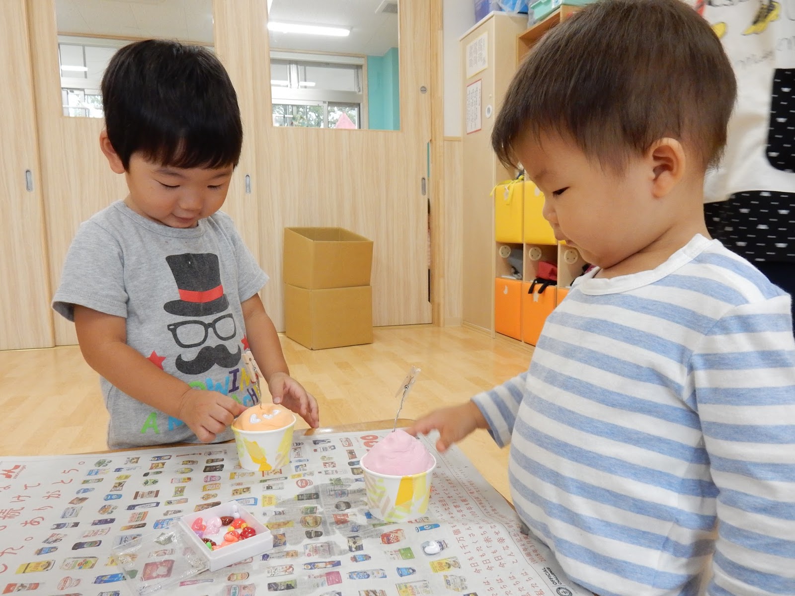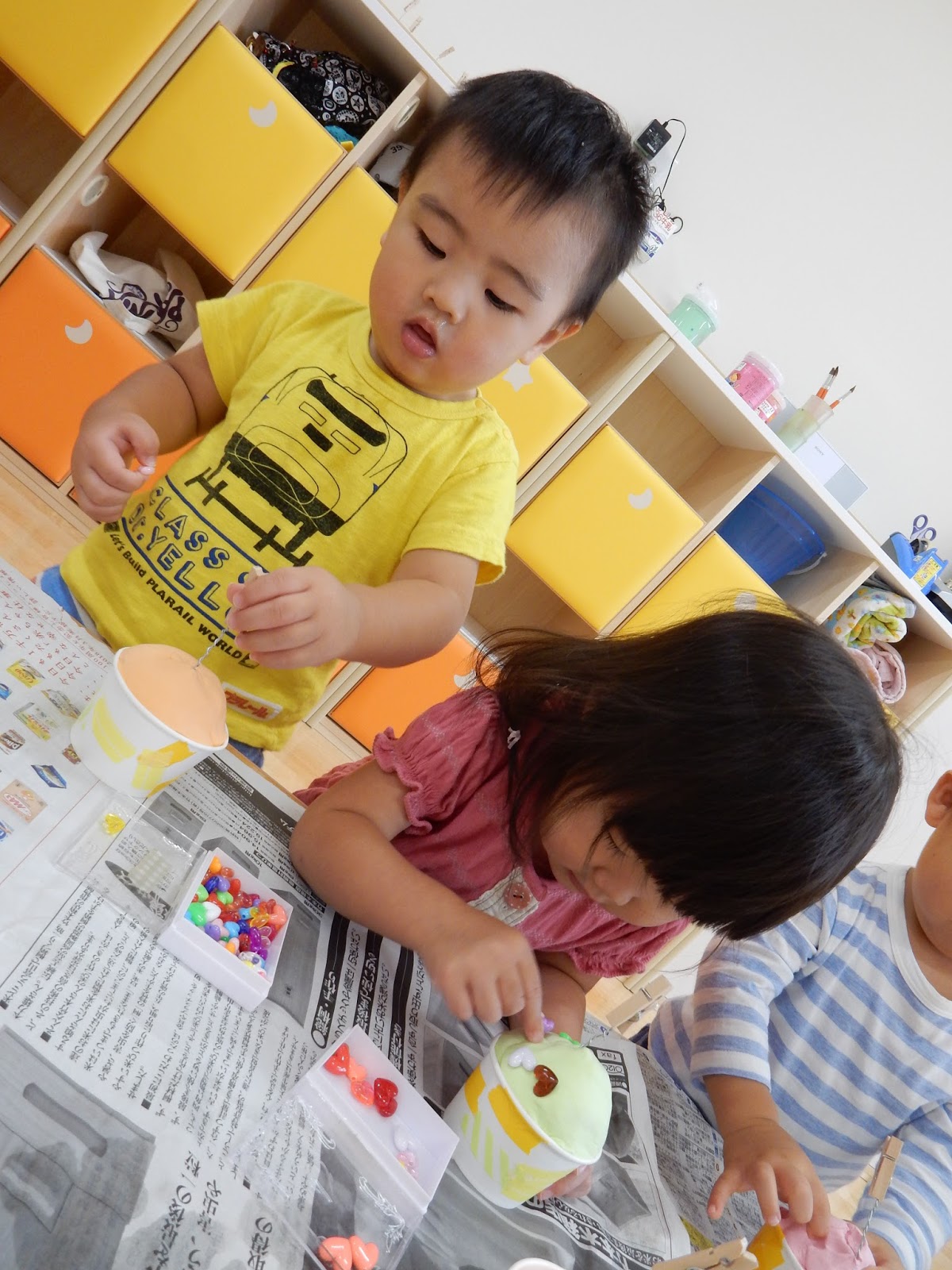 ひよこさんは、丸い粘土のかたまりをコネコネ…カラフルな色がついていて、これだけでも可愛らしいんですが、カップに入れた粘土に、今度はハートのビーズを付けていきます。好きな色を選んで、ぎゅーっと押し込みます。じっくり考えながらやったり、ササーッとたくさんつけたり、並べてつけたり、バラバラだったり。こんなに小さいですが、個性が光っています!