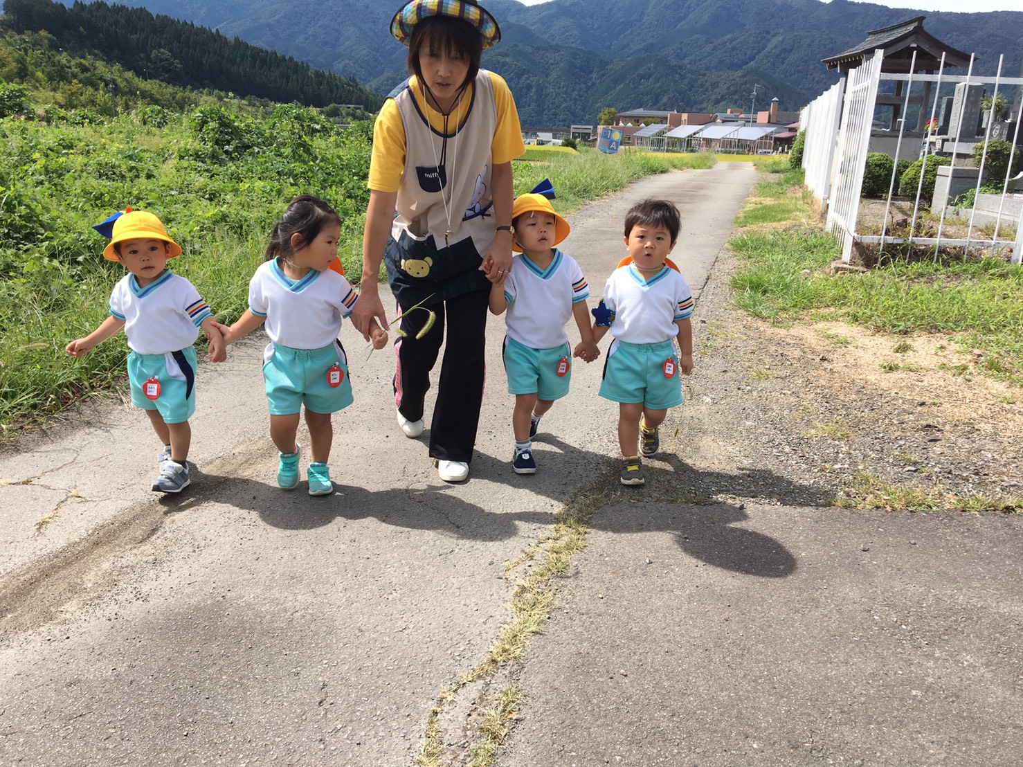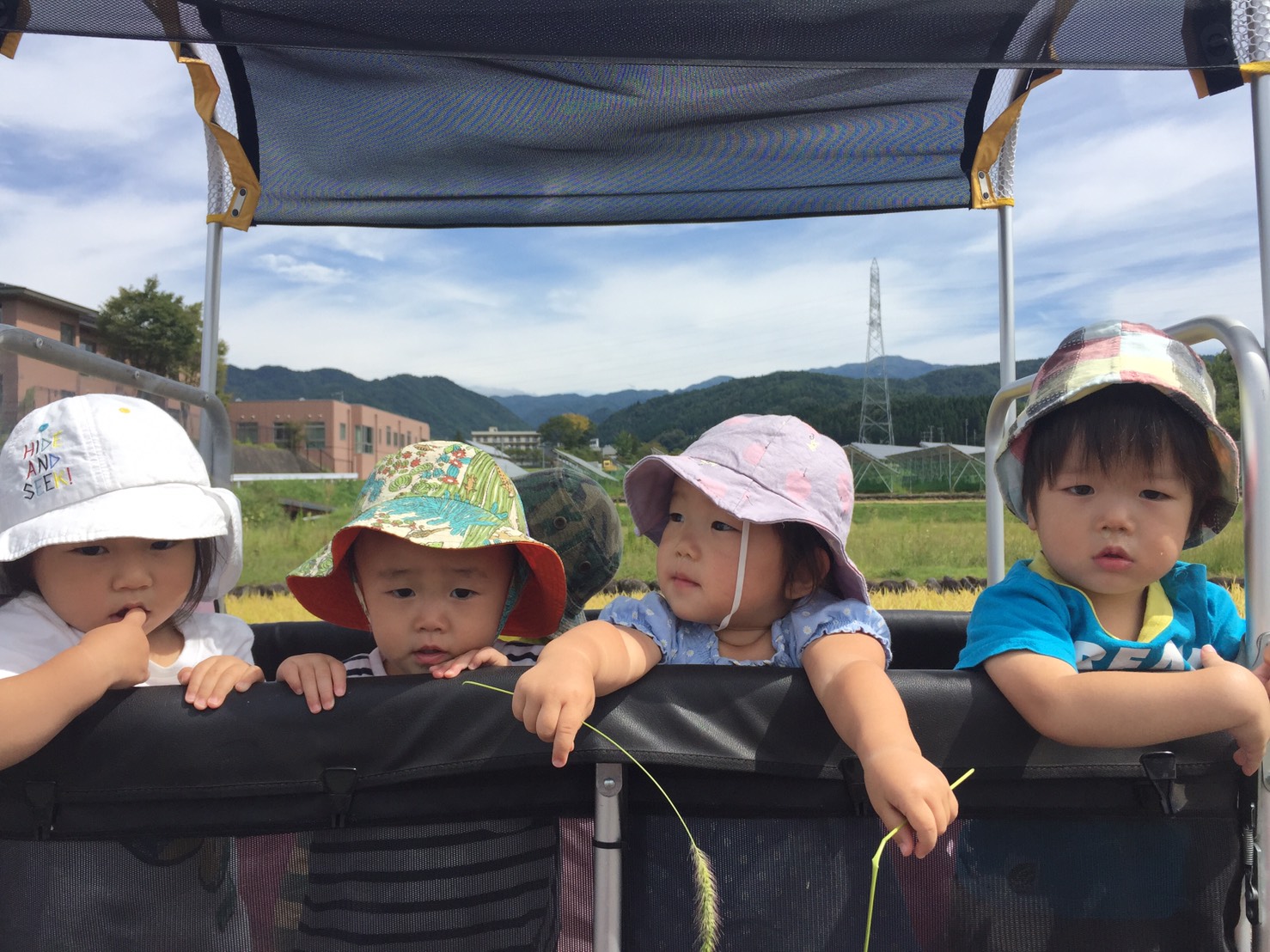 すみれさん、ひよこさんは、農道をぐるりとお散歩してきました。お友達や、先生と手をつないで歩く姿はかわいらしいですよね♡ひよこさんは、ベビーカーも使って、疲れたら休憩♡順番に安全に歩きます。