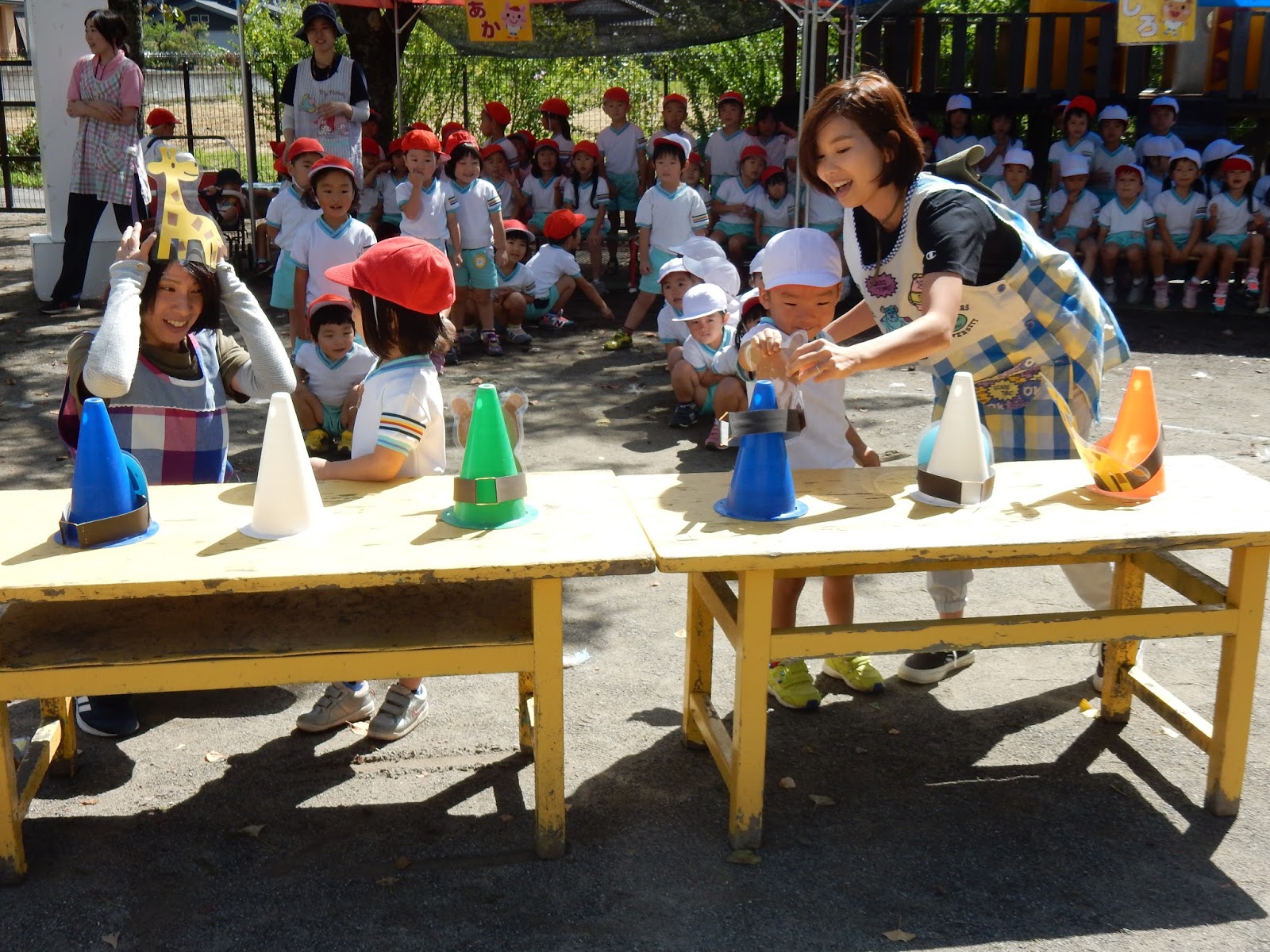 必死で走る先生たちの姿に、みんなの応援にも熱が入ります!大きな声で声援を送ってくれました!28人分の保護者役をこなすのは、なかなか大変で、終わった後はぐったりの先生達でした!