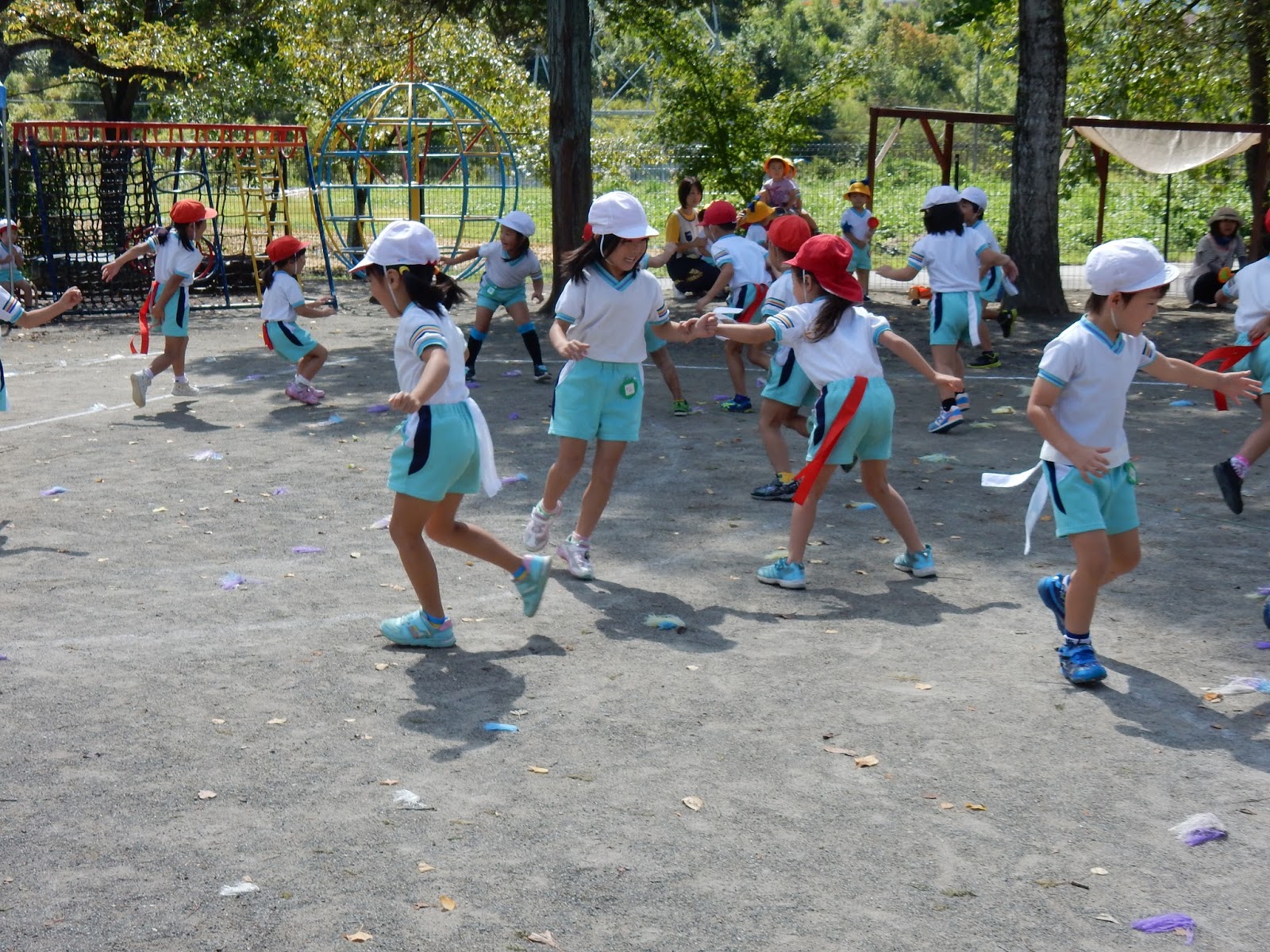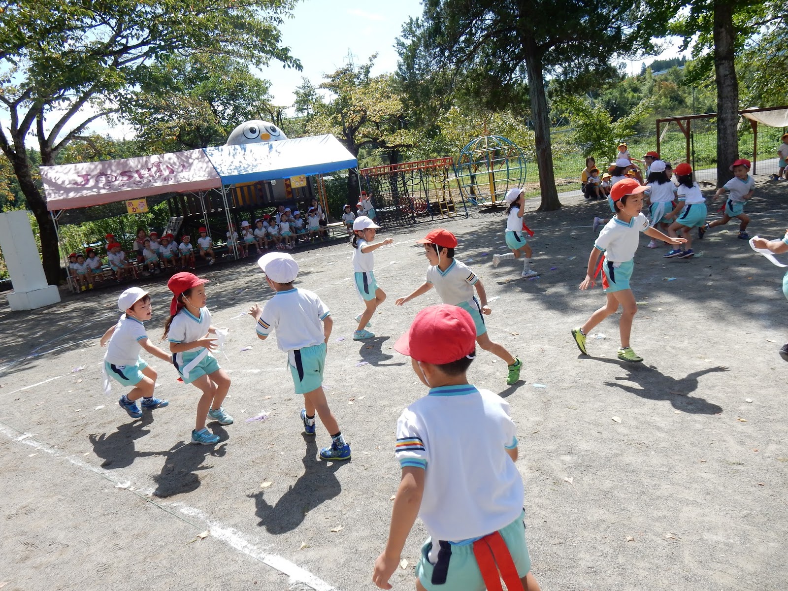 実は、たんぽぽさんの親子競技の練習だったんです!お母さん、お父さんの代わりに、先生たちがお手伝いしてくれたんですが、もちろん、競走ですから、真剣勝負!!(笑)たんぽぽ組の保護者の皆さん!こんな感じの全力疾走に期待してますよっ!!