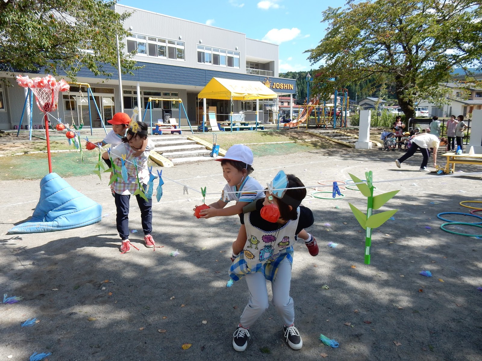 玉入れからスタート!!何度か練習をするうちに、お兄ちゃん、お姉ちゃんと一緒にやっていると、たんぽぽさんのお友達がなかなか玉を拾えていないかも…という事に気が付きました。そこで!!