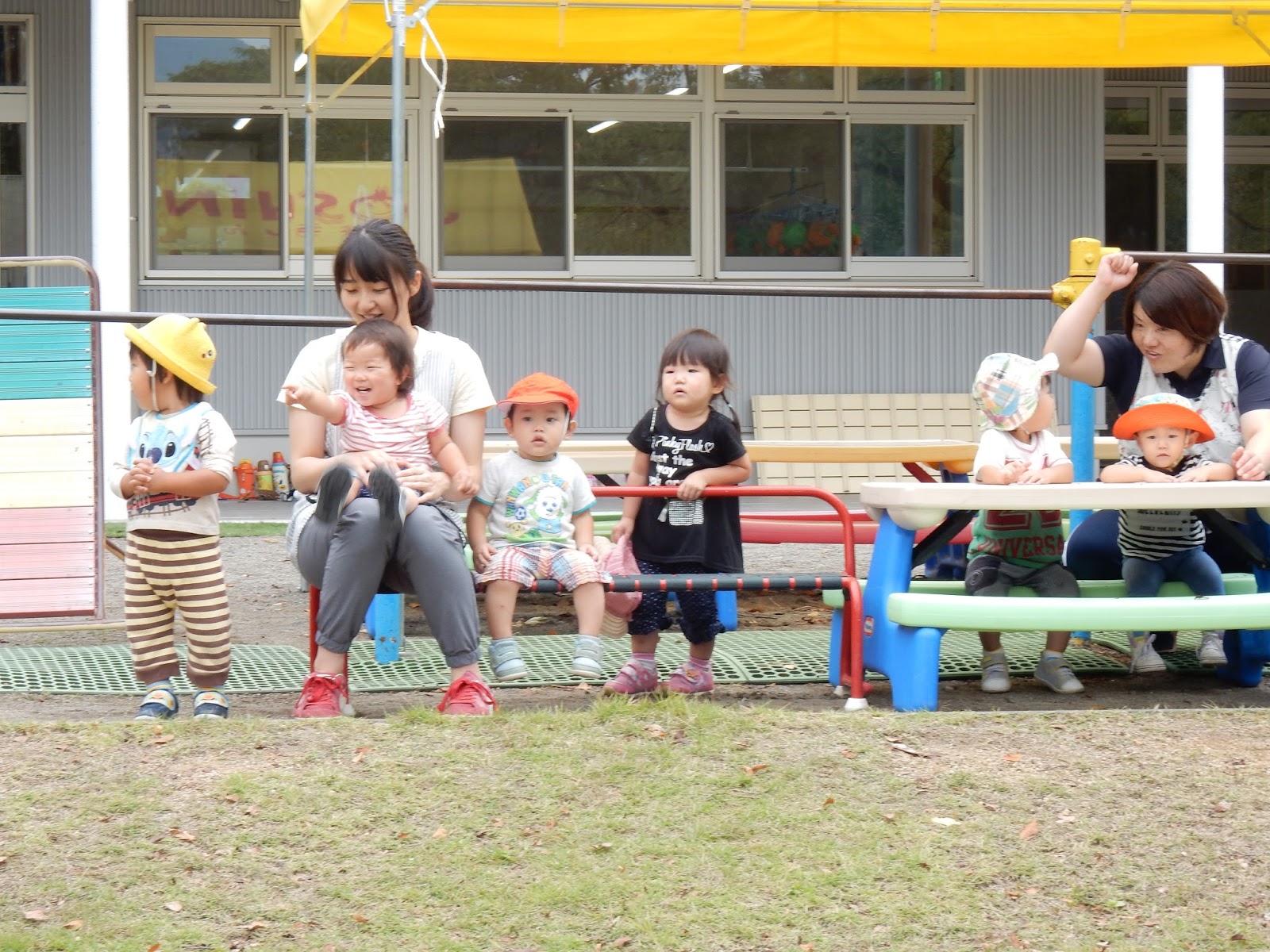 ひまわりさんと、たんぽぽさんは園外へお散歩に出掛けましたよ!集会所の公園へお出かけ。園にはない遊具に、テンションが上がります!