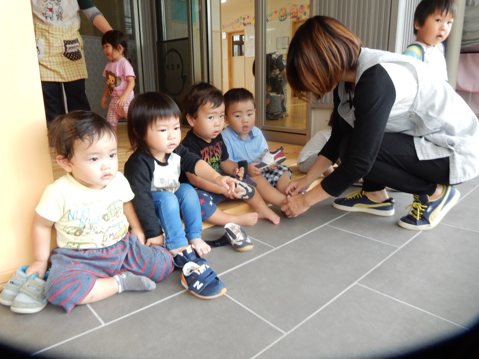 ちょこんと座って靴を履かせてもらったり、自分で一生懸命足を入れようとしたり。楽しみが待っていると、頑張れますね!
