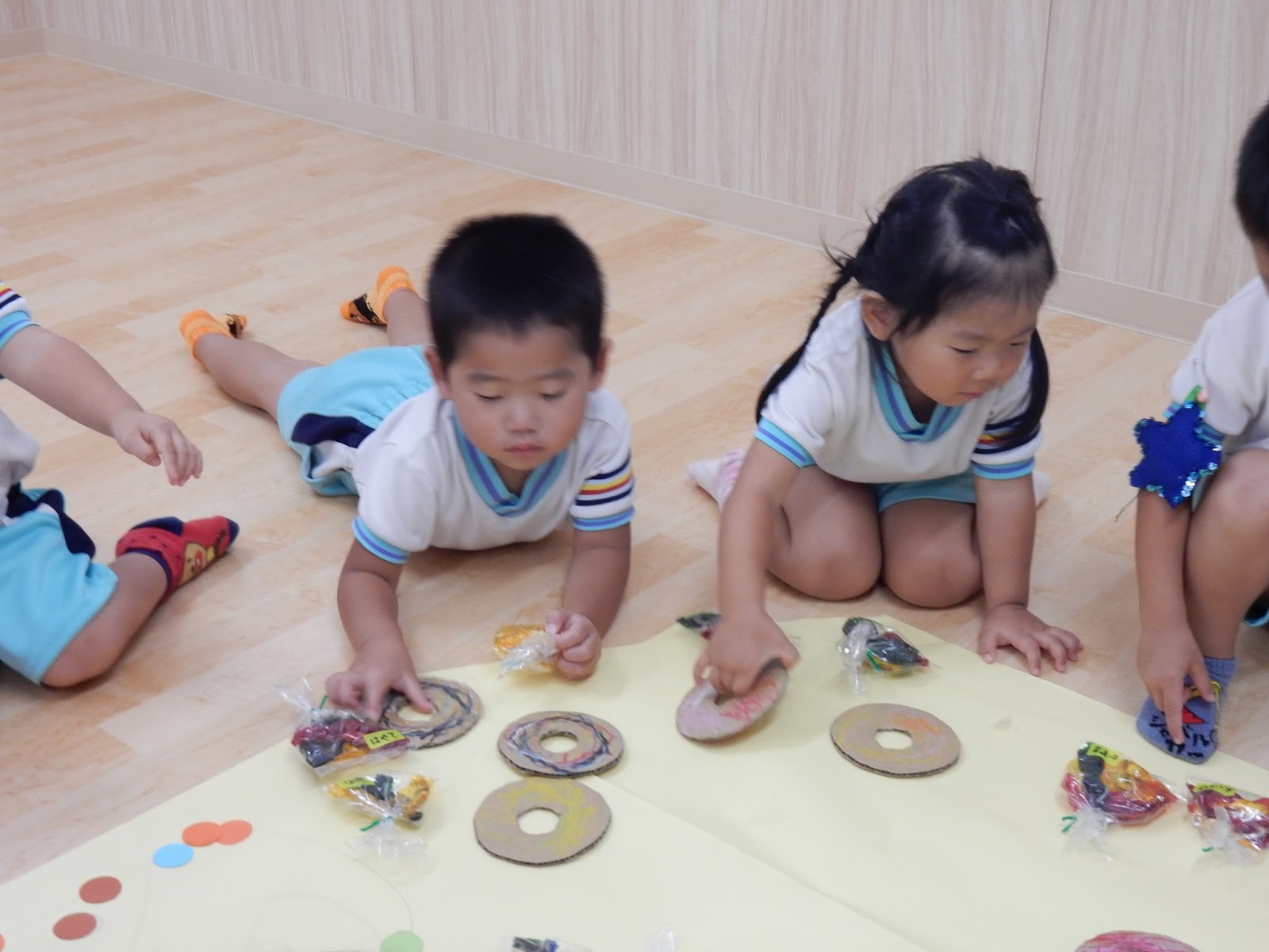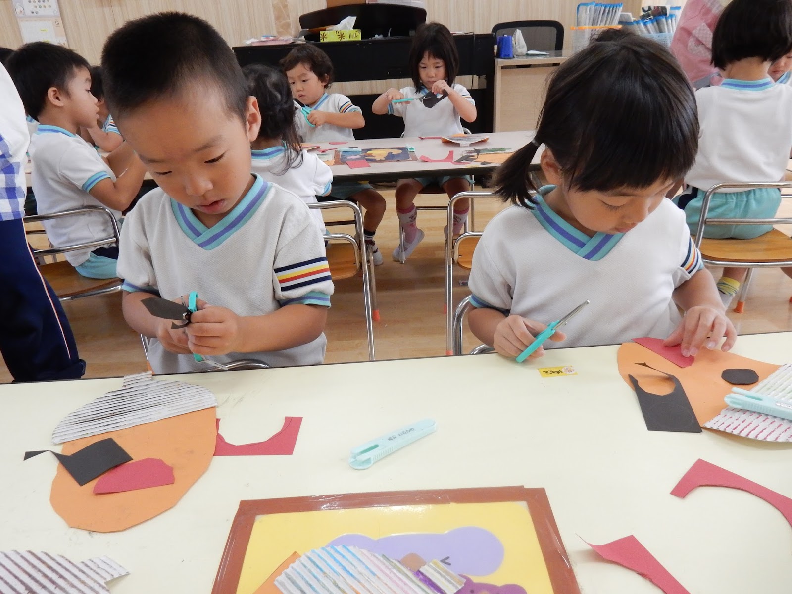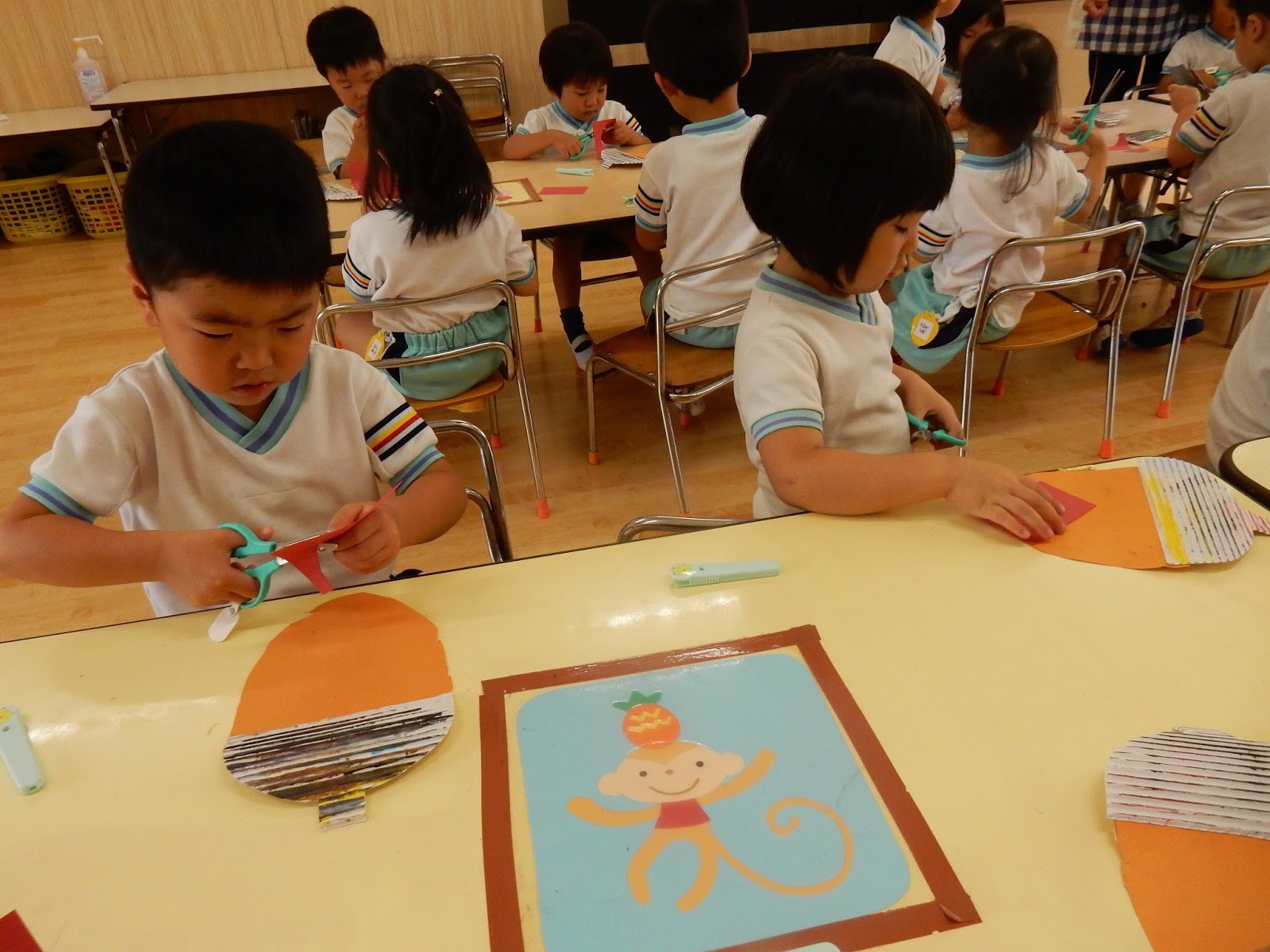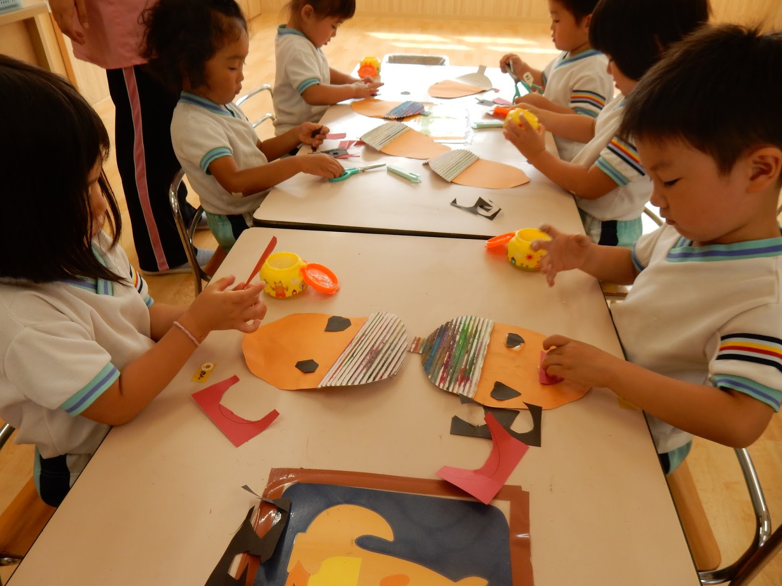 たんぽぽさんは、はさみをチョキチョキ…のりをペタペタ…何を作っているのかと思って見ていたら、あっ!ドングリですね!『これをね、反対に向けると、お茶碗になるの!!』と、子ども達らしい発見を教えてくれましたよ!目や、口も、線の上を上手に切れるようになりました!同じ素材を使っても、作る子どもが違えば、色も表情もみんな違います!このドングリたちが、壁面に並ぶのが楽しみですね!