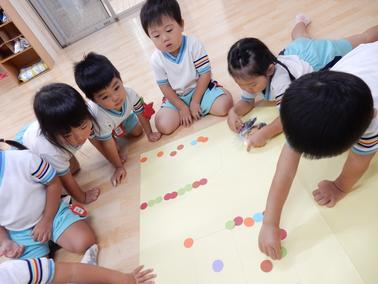 マーブルチョコレート、ドーナッツ、ポッキー、あめ…おいしそうなお菓子がたくさん並んでいます!みんなが作っていたのは、なんとお菓子のお家でした!線の上にまっすぐチョコレートを並べたり、思い、思いの場所にどんどんお菓子を貼りつけていきます。