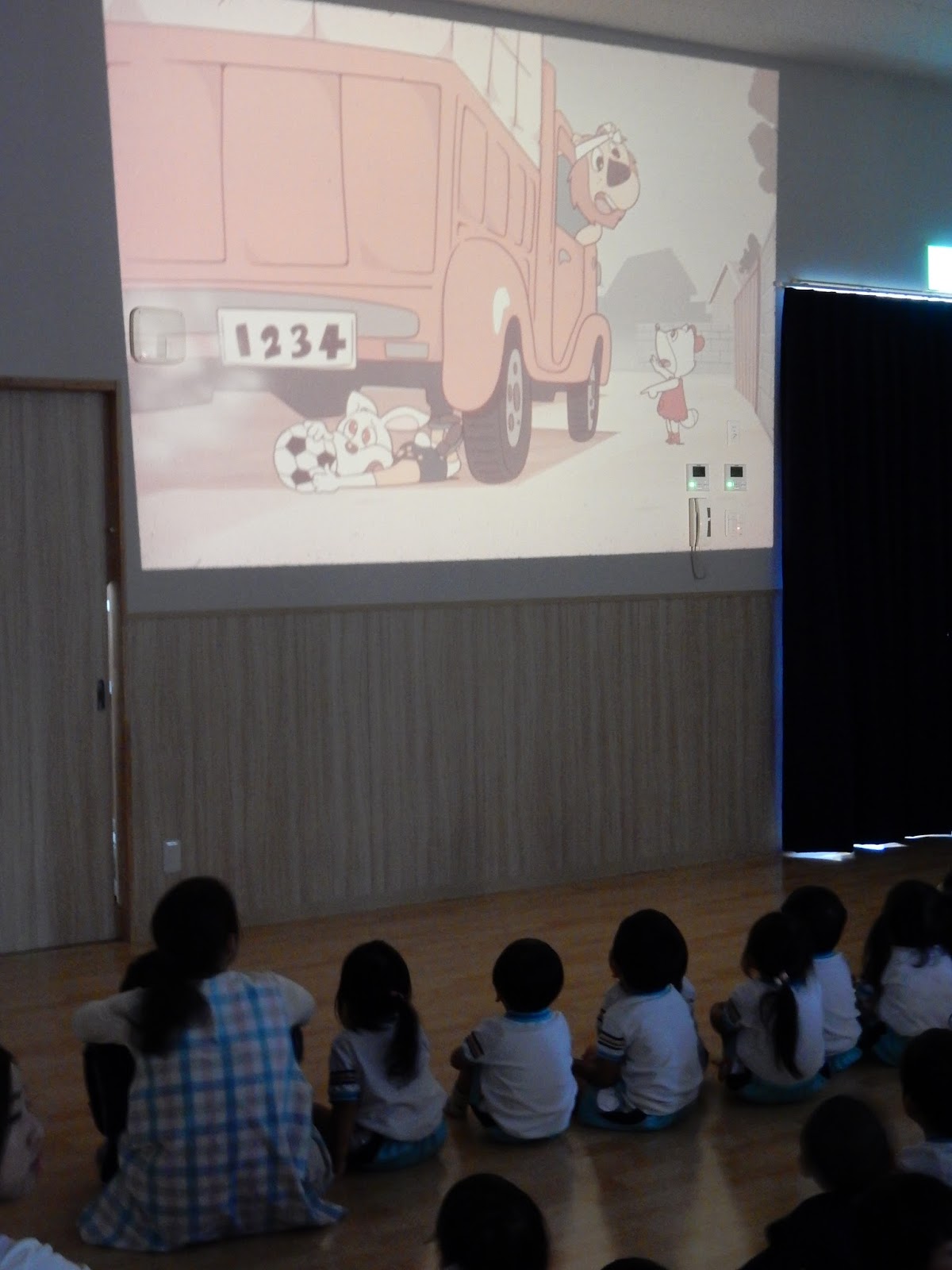 今日は交通安全指導もありました。壁に映ったスライドを見ながらお勉強。止まっている車の近くで遊ぶ事の危険や、飛び出し注意!といった内容でしたが、何度もお勉強している子ども達なので、お話を見ながら、『うさぎさん、ダメやんなぁ!』と教えてくれました。毎月の交通安全指導が、もしも!の時に役立ってくれるといいですね!