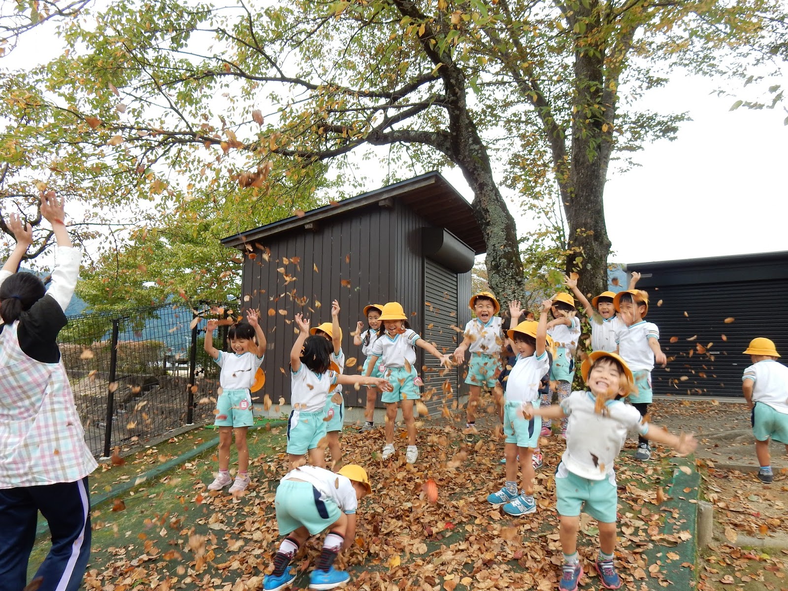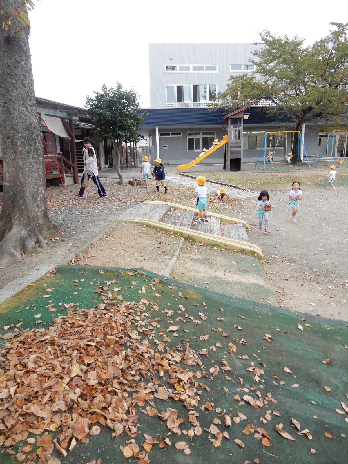 とってもきれいだったね♪毎日落ち葉が一杯の園庭ですが、子ども達の遊び道具になっています!この時期ならではの光景です。来月には、わいわいデーで“秋であそぼう”というテーマを計画しています。落ち葉や、ドングリなんかの自然物を使ってたくさん遊びます!遊んだ後の落ち葉を利用して焼き芋も…♡毎年とっても楽しい1日です。今年も待ち遠しいですね!