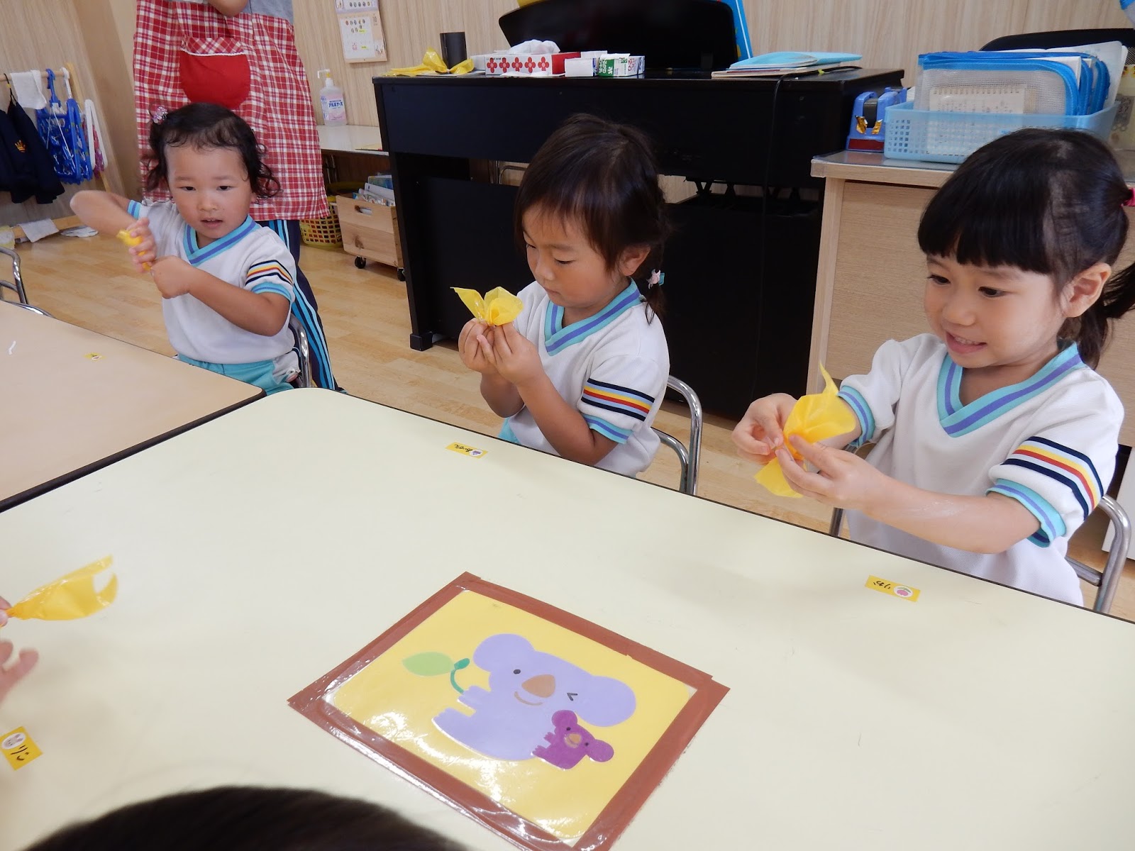 たんぽぽさんは、男の子と女の子に分かれて作っていました。シルクハットにつける模様が、女の子はリボン。男の子はコウモリなんですって!細かい作業も、真剣な表情で進める女の子。出来上がったコウモリでお友達と遊び始める男の子。どちらも完成が楽しみですね!