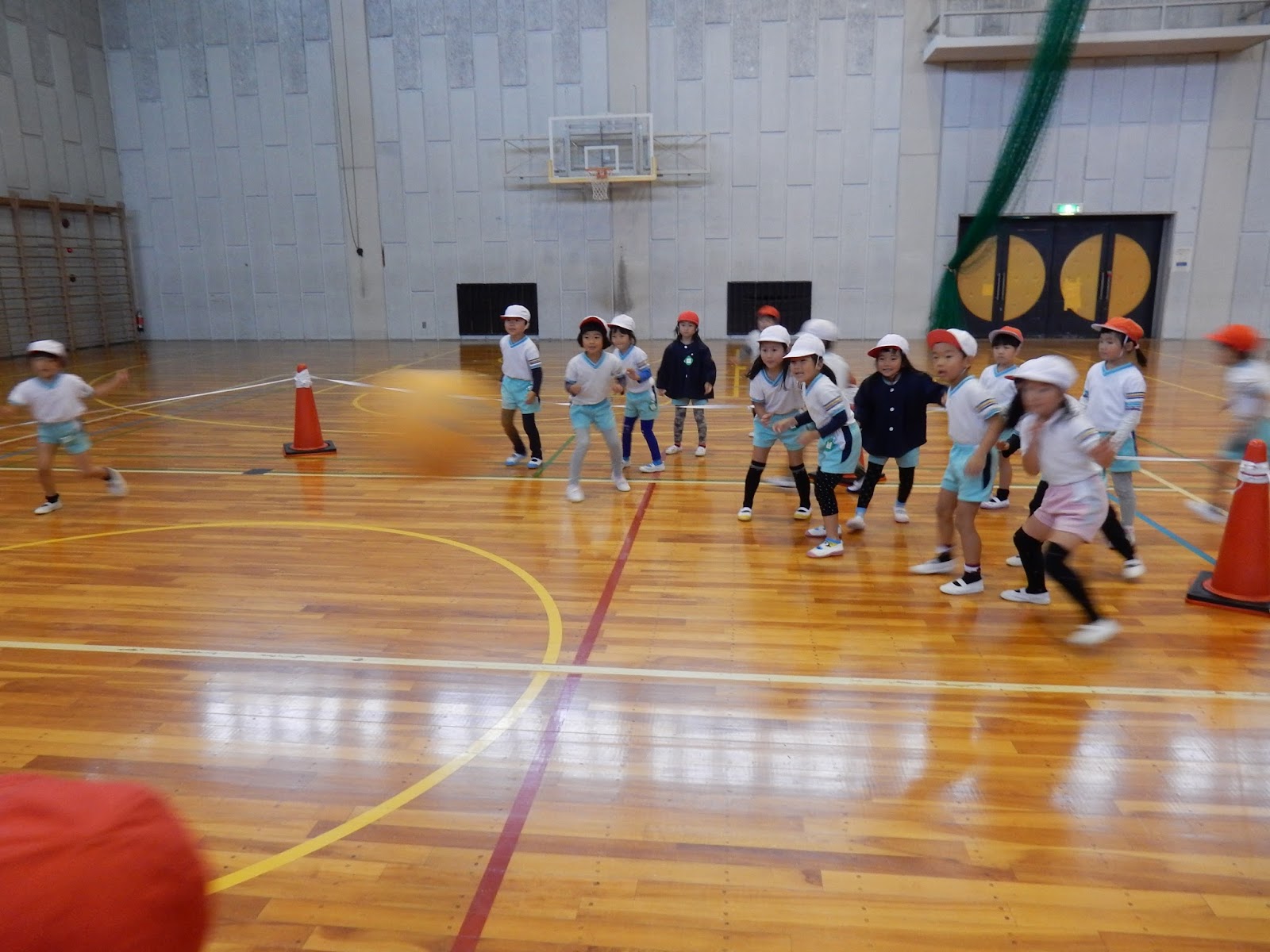 ひまわりさんは、これからドッジボールが盛んになります。ボールの投げかた、受け方。逃げ方。ポイントはたくさんありますよ!今日はまず爆弾ゲームをしながらルールの確認もしました。キャーキャーと大騒ぎで逃げたり、力いっぱい投げたり。まだまだ得意、不得意の差も大きく、なかなかボールに触ることのできないお友達もいますが、これからたくさん遊んで行くうちに、どんどん上手になっていくんです!小学生顔負けのゲームができるようになるんですよ!今後が楽しみですね!