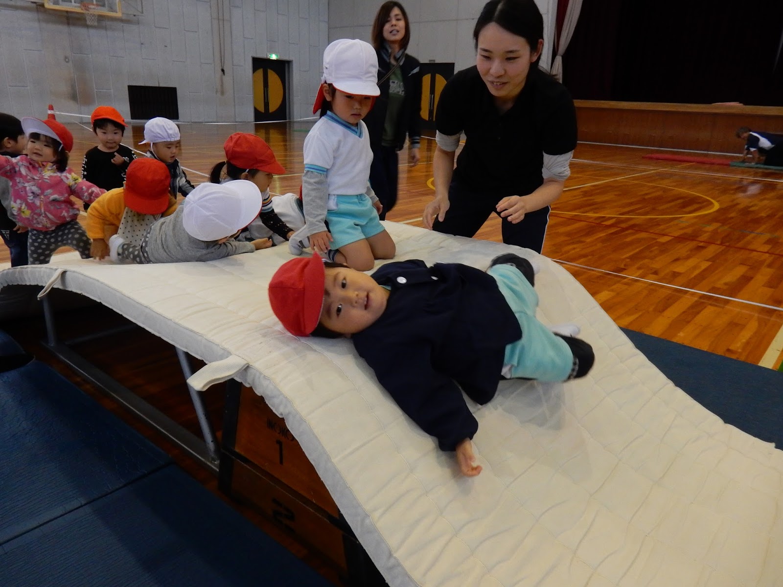 大きなお山をよいしょ。よいしょ!登ったら、ゴロゴロ~転がりおります。ハイハイって、とっても大事な全身運動なんですよ!手足を代わる代わる前へ出し進んでいきます。歩けるようになる前はもちろんですが、遊びの中でハイハイ…してみるのも目線が変わって楽しいですよ~。