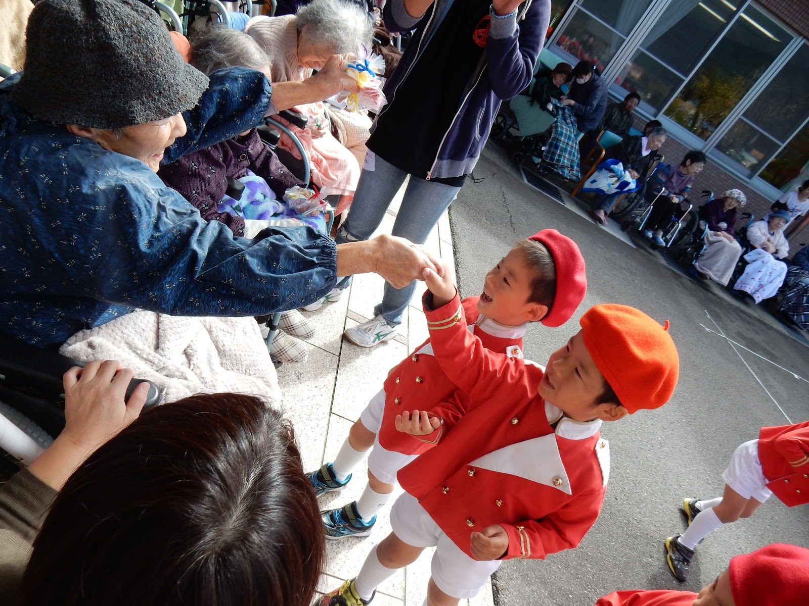 アットホームの中庭にて。今日もたくさんのおじいさん、おばあさんから大きな歓声が上がっていました!子ども達の訪問をとても楽しみにしていてくださったようです。