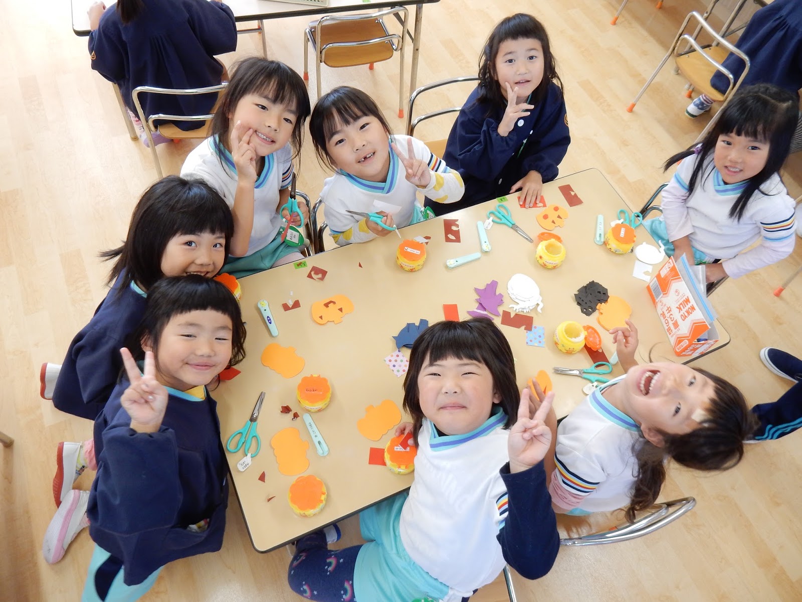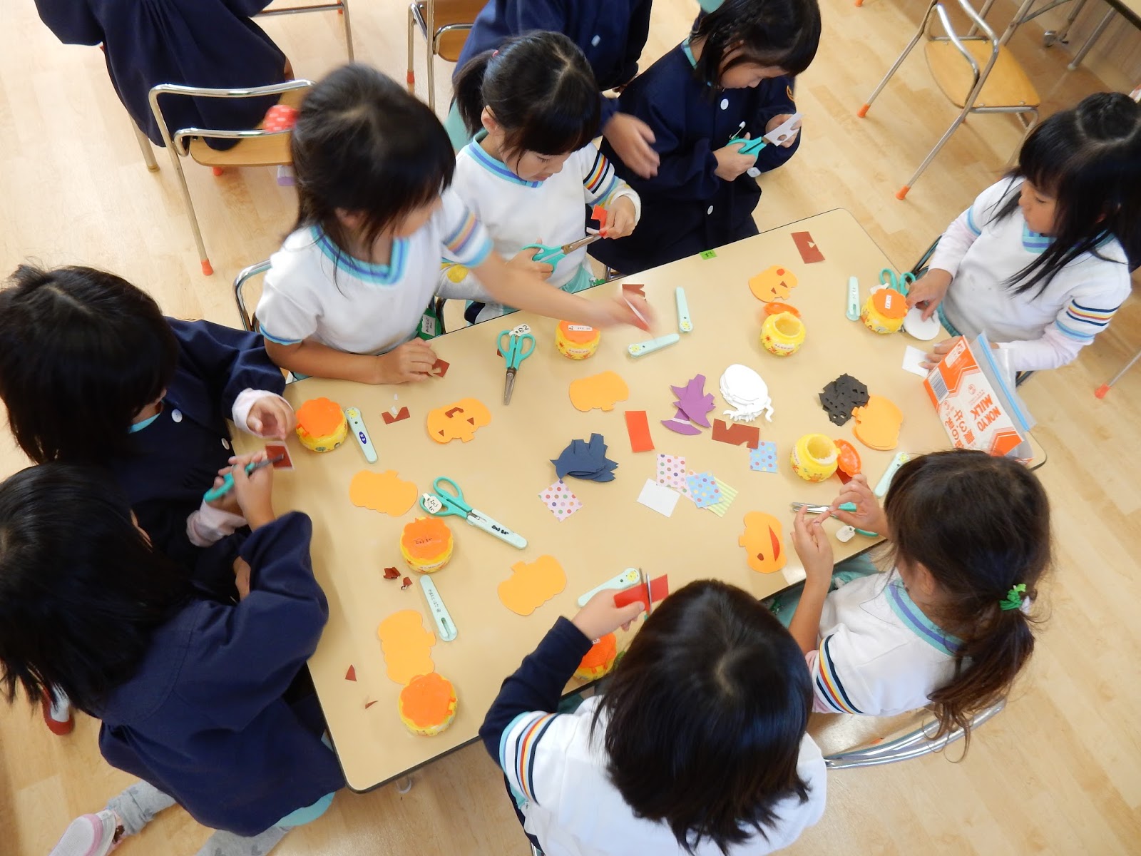 先生が用意してくれていたカボチャやオバケに、折り紙を使って表情を付けていきます。このあと、輪がどんどん広がって、女の子だけでなく男の子たちも集まってきてみんなでカボチャを作りました!