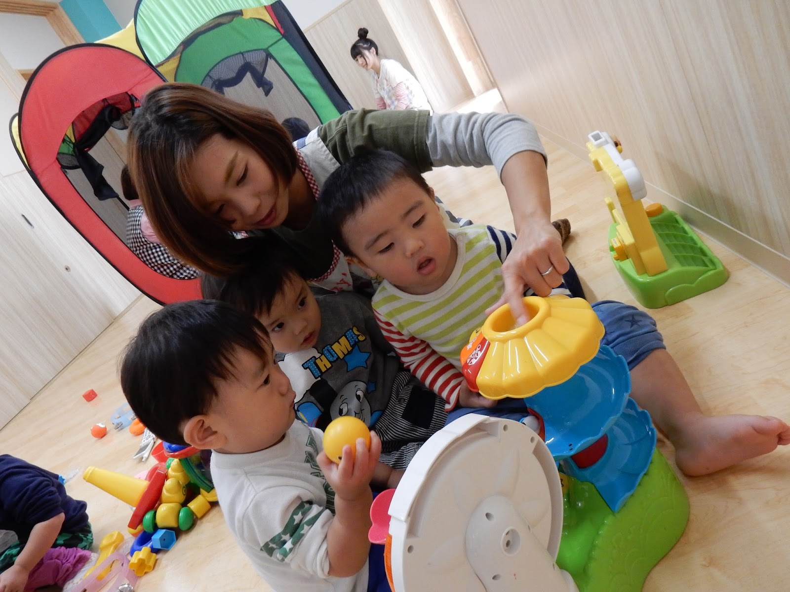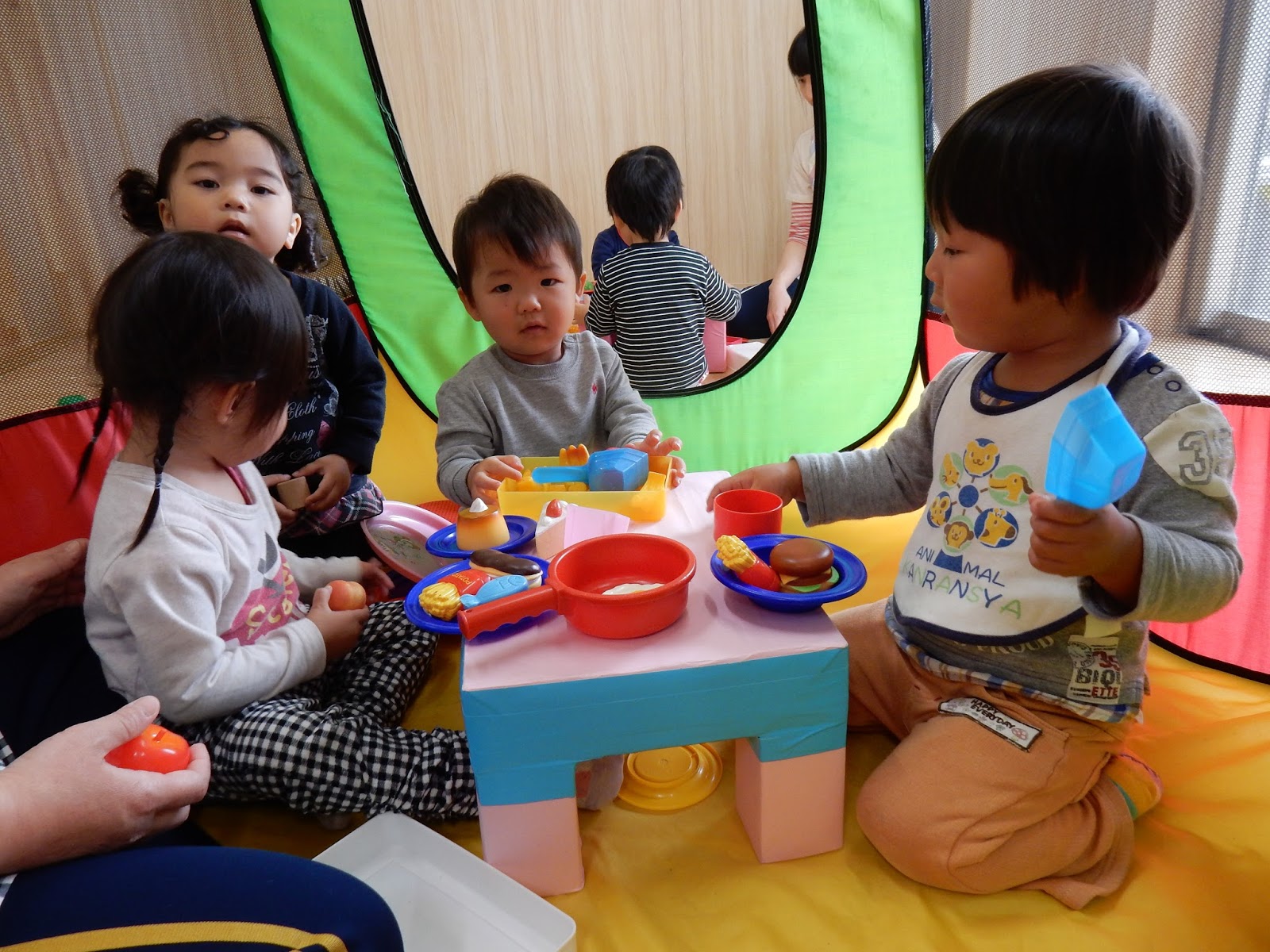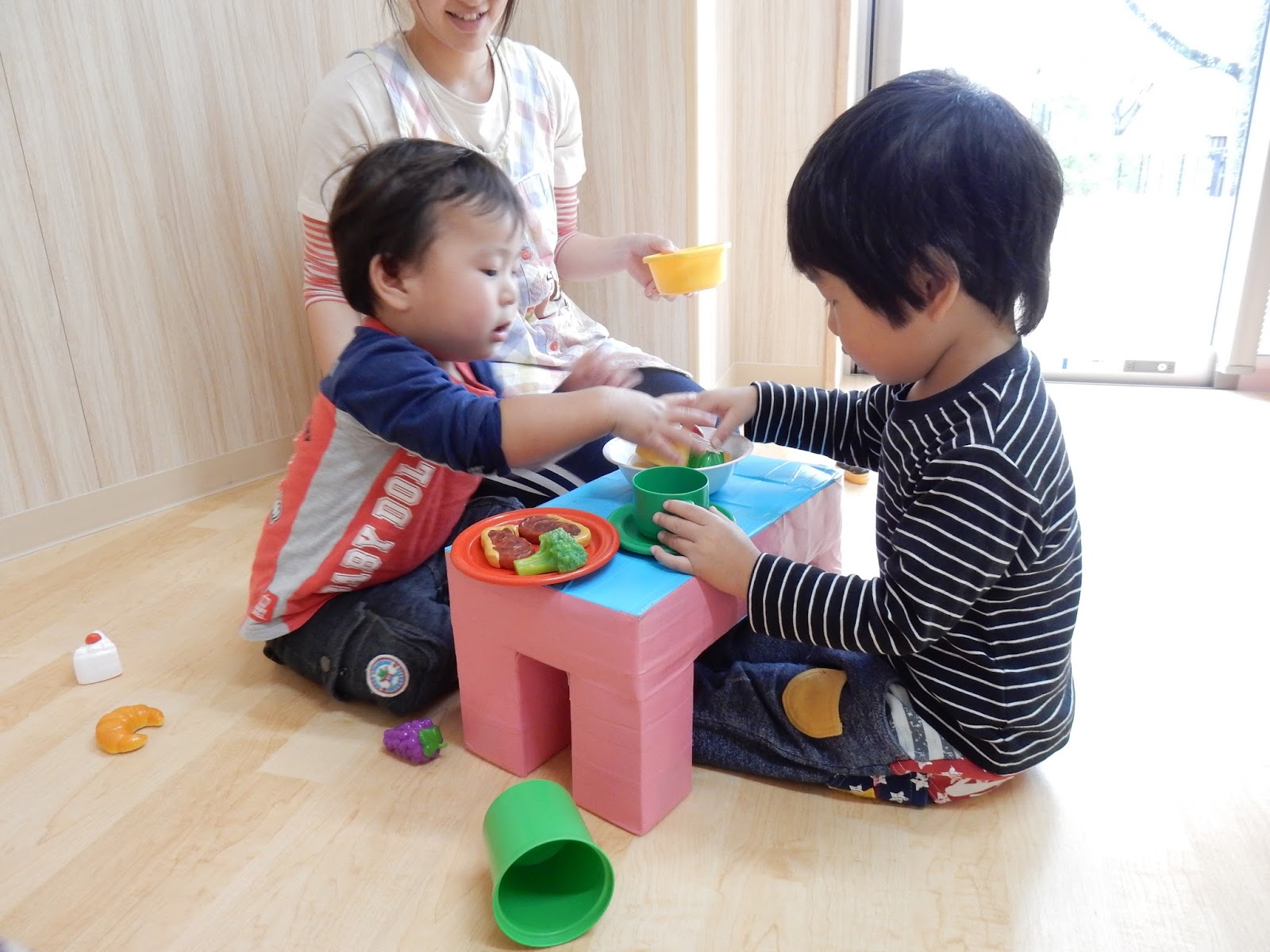 さて、お母さんたちがお勉強をしている間の子どもたちは...雨降りの為お部屋の中で楽しく遊びました。ひよこさんのお部屋に置いてあったボールプール。今日はボールを入れずにその中でおままごと。おいしそうなお料理がたくさん並んでいました!