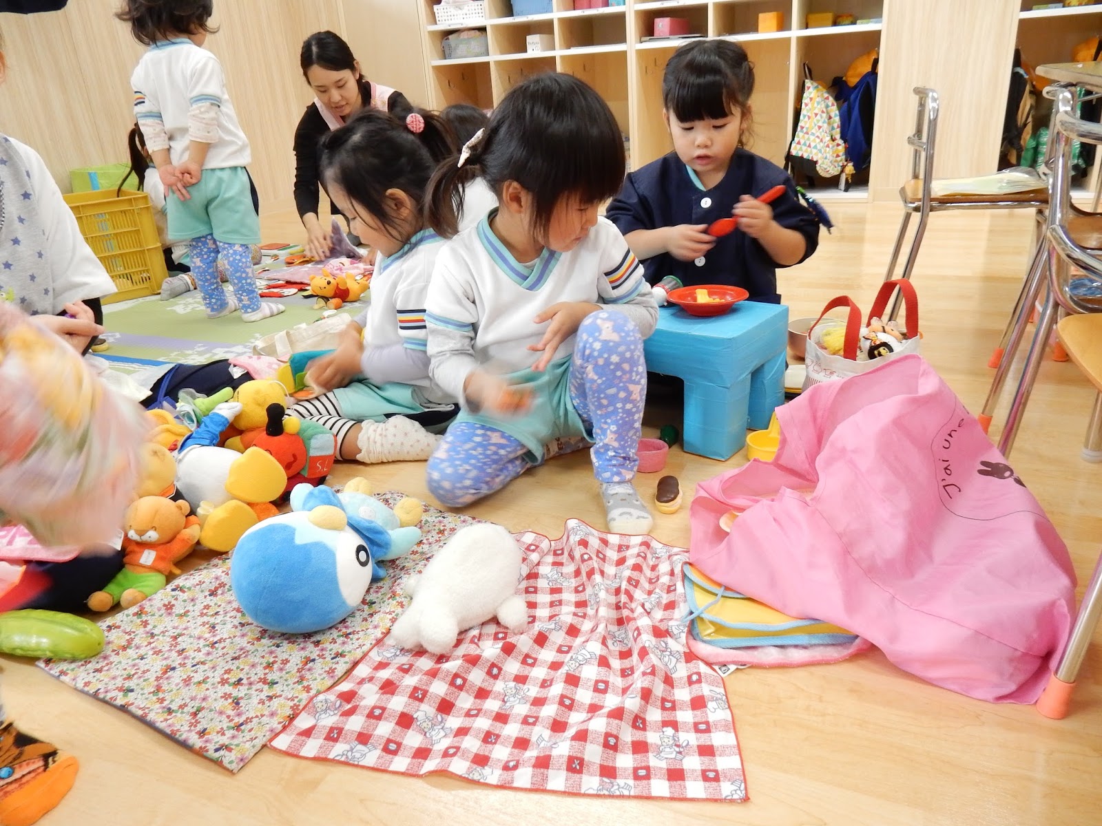 すみれさんにも働き者のお母さんがいましたよ!ぬいぐるみをたくさん並べて、お風呂に入れたり、寝かしつけたり。もちろんお料理をしたりと、大忙し!きっと、お家でいつもお母さんがやってくれているように真似っこしているんでしょうね!