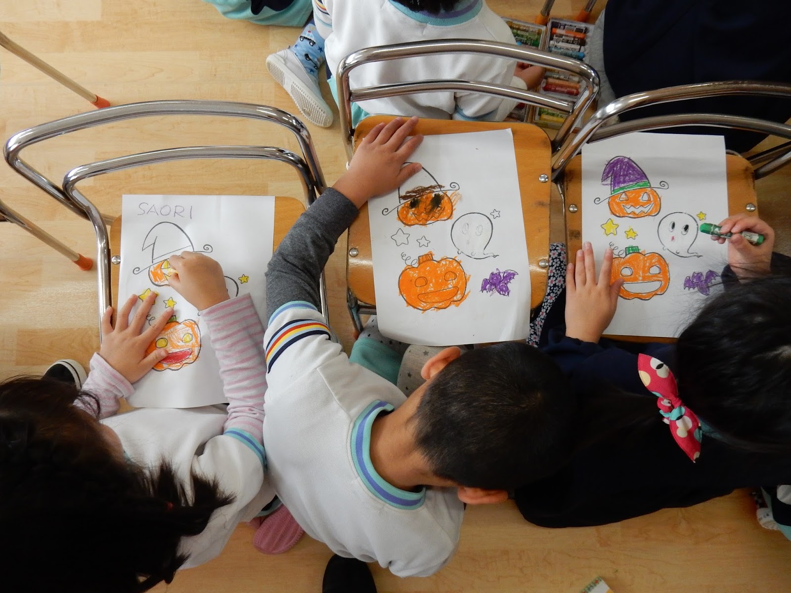 ゆりさんは、英会話。真剣な表情のみんなは、ハロウィンの絵がかいてある間違い探しをじーっと見比べていました!キャンディー先生の用意してくださる教材はいつもかわいいですお♪お友達と間違いを確認したり、カボチャのぬり絵をしてハロウィン気分を味わいました。