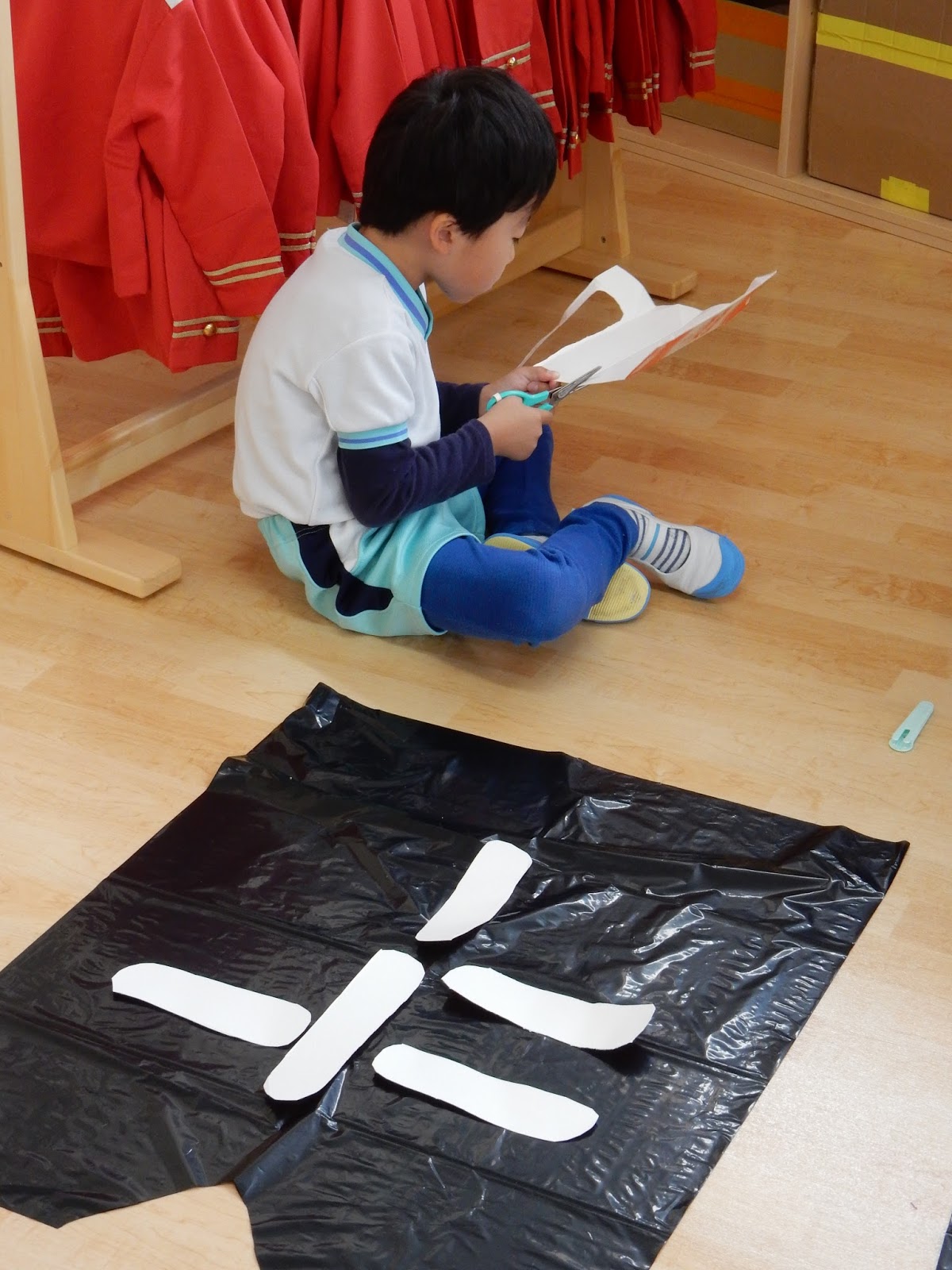 ひまわりさんは、お部屋にカラーポリを広げてハロウィンのコスチューム作り。お化け、ガイコツ、魔女、ドラキュラ…変身したいものはみんなそれぞれ。使える材料をいろいろ用意して、好きなように制作します。図鑑を見ながら骨を並べたり、型紙を使って形を切ったり、テープを貼り合わせてクモの巣模様を作ったり…先生にちょっと手伝ってもらいながら、みんな自分のアイデアをどんどん形にしていきます。どんな仕上がりになったんでしょうか。来週のハロウィンパーティーが楽しみです♪