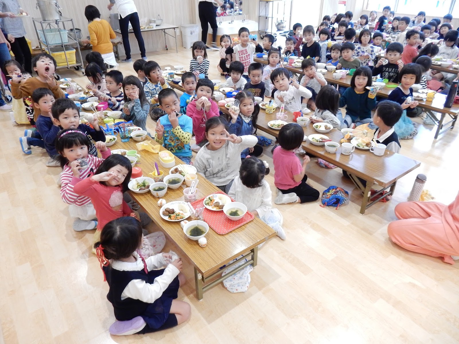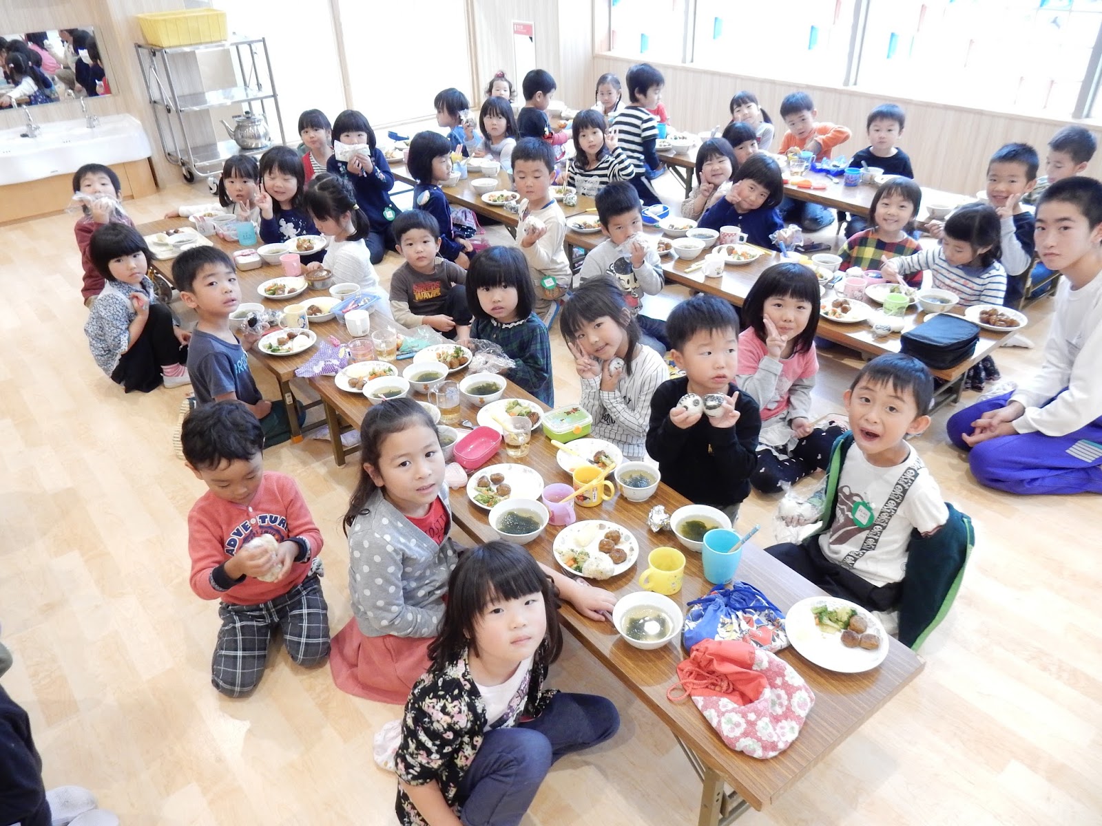 今日は、たんぽぽ、ゆり、ひまわりの3クラスはホールにみんなで集まって給食を食べました♪とっても広いホールなのでスペースも十分!ちょっと緊張しちゃう子もいたかもしれませんが、おにぎりの味やパッケージを見せ合いっこしたりしながら楽しく食べることができました♪今後も、こんな風にみんなで一緒にお給食を食べる機会があっても、にぎやかでいいですね!