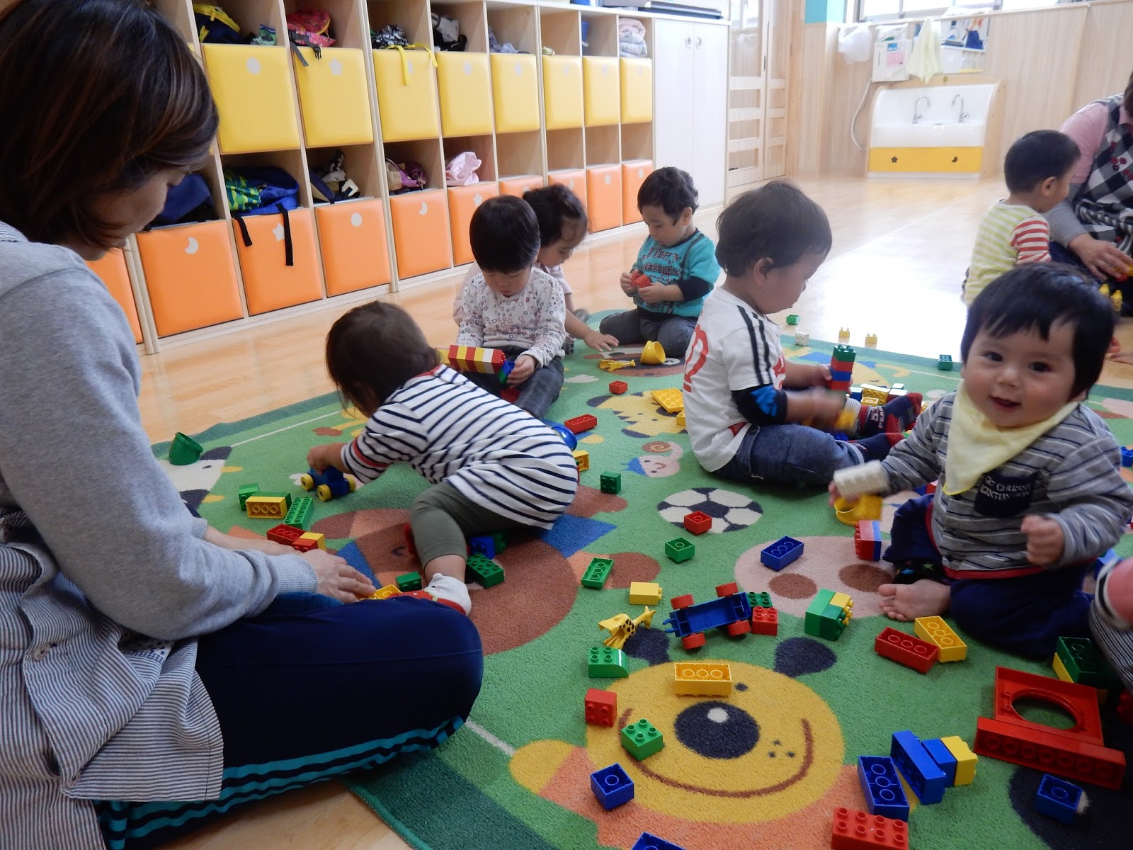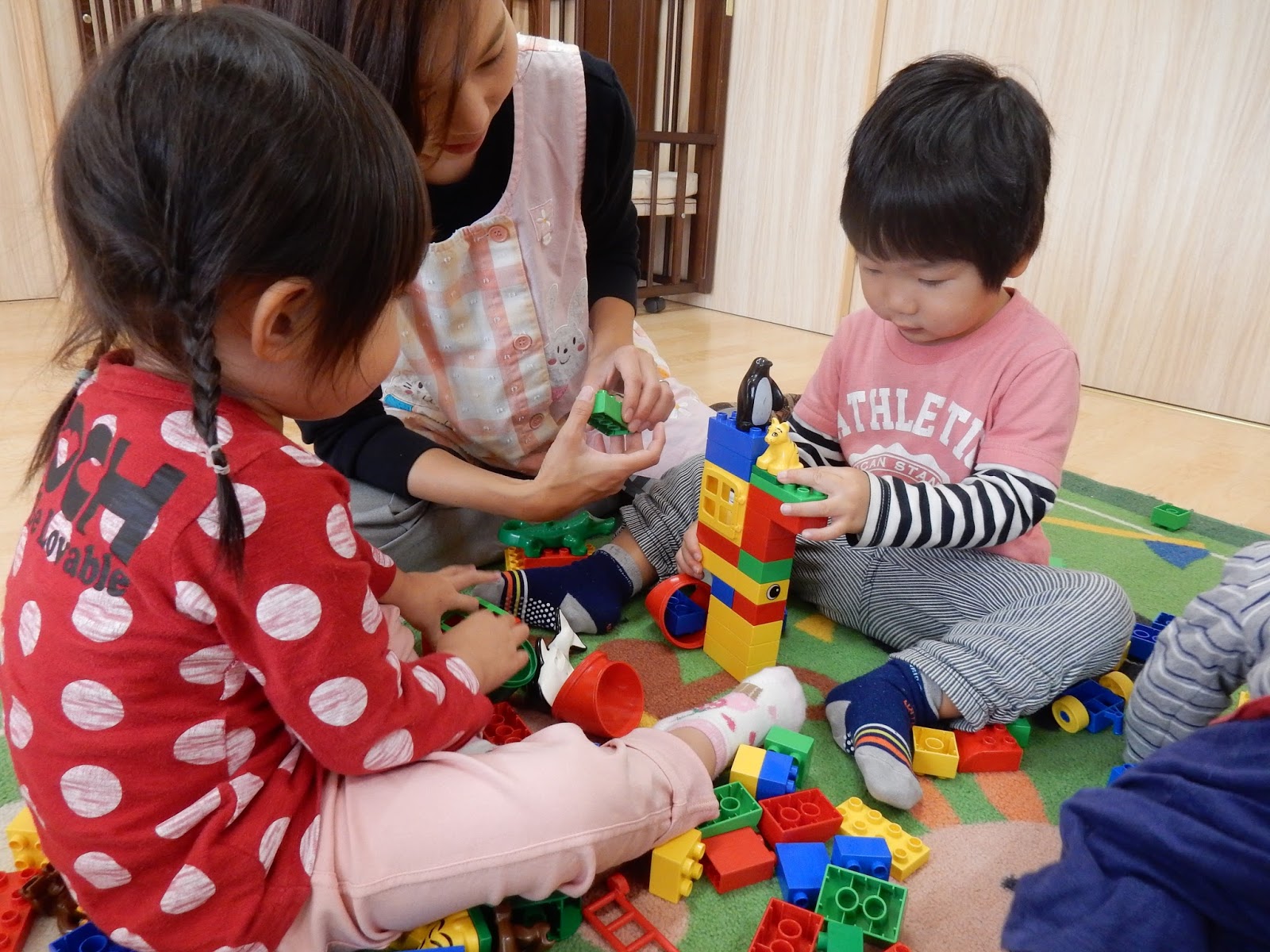 今日はみんな仲良くブロックで遊びます。使っているおもちゃは同じで、同じ空間で遊んでいますが、まだまだひとり遊びが中心のひよこさん。でも、こうやってじっくり一人で遊んだり、先生と安心して遊ぶ事ができると、そこからだんだんお友達に関心が向くようになり、ひとり遊びから、2人、3人と人数が増えていくんです♪
