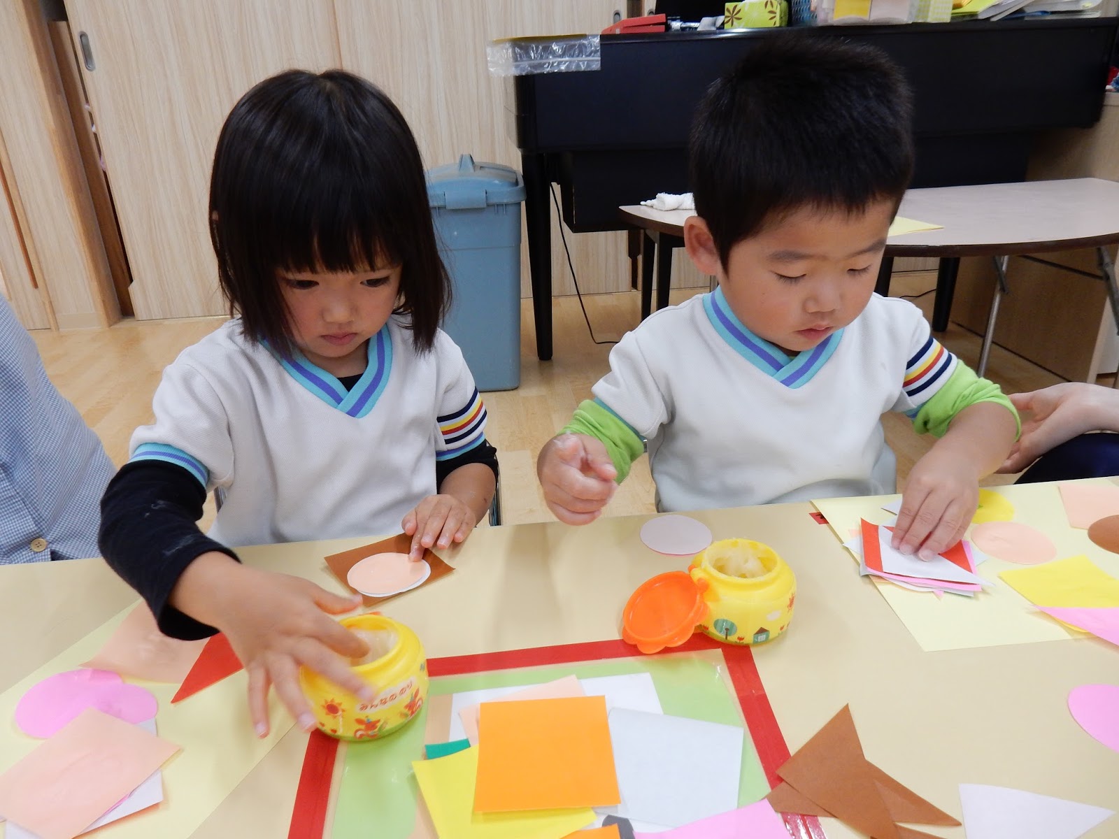 すみれさんは、丸、三角、四角の製作をしていましたよ!先週たんぽぽさんもやっていましたね!学年が一つ変わると、製作の雰囲気が全く違います!すみれさんは、イメージをしてつくる…というよりは、たくさん並べたり、重ねたりして貼っていきます。ただ単に貼っているように見えて、実は子どもたちには思いがあったりもするので、出来上がった作品を見ながら、『これは何?』って問いかけてみると、楽しいお返事が返ってきたりしますよ!