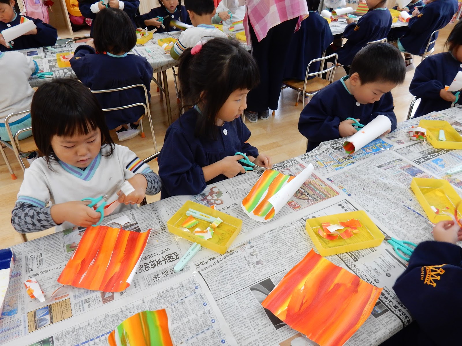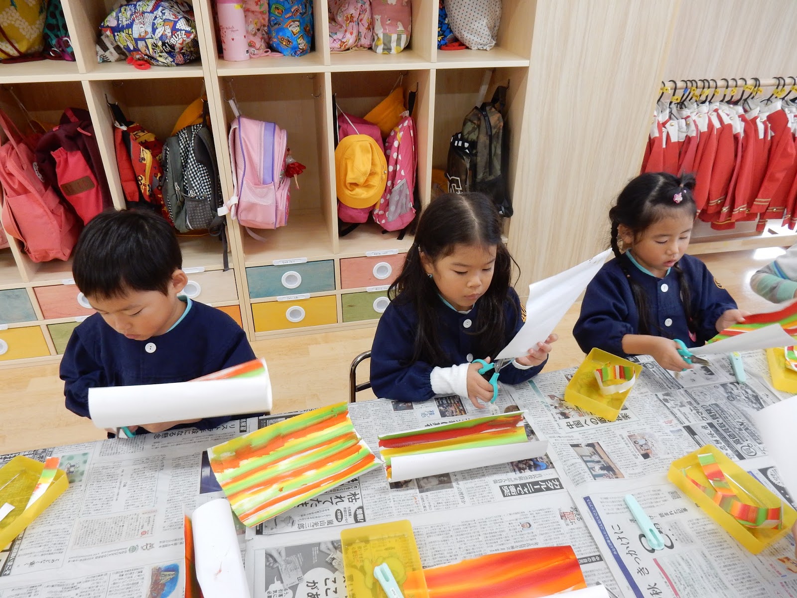 ゆりさんは、先週スポンジで書いた模様の画用紙を細かく切って壁面作り。とってもきれいな模様にビックリ!絵の具を塗った画用紙は、クルリと反り返ってはさみで切るのがちょっと大変そう。こうしてみたら??と、逆に丸めて画用紙を真っ直ぐにしてあげると、『うわ!切りやすい!なんで!?』ととってもいい反応(笑)1度コツがわかると、もう自分たちでできます。時々クルクルと丸めて真っ直ぐに伸ばしながら、たくさん細く切ることができました。それをまた別の画用紙に。実はゆりさんもミノムシを作っています。題材は同じでも、作り方は色々。どんなミノムシが出来あがるでしょうね!