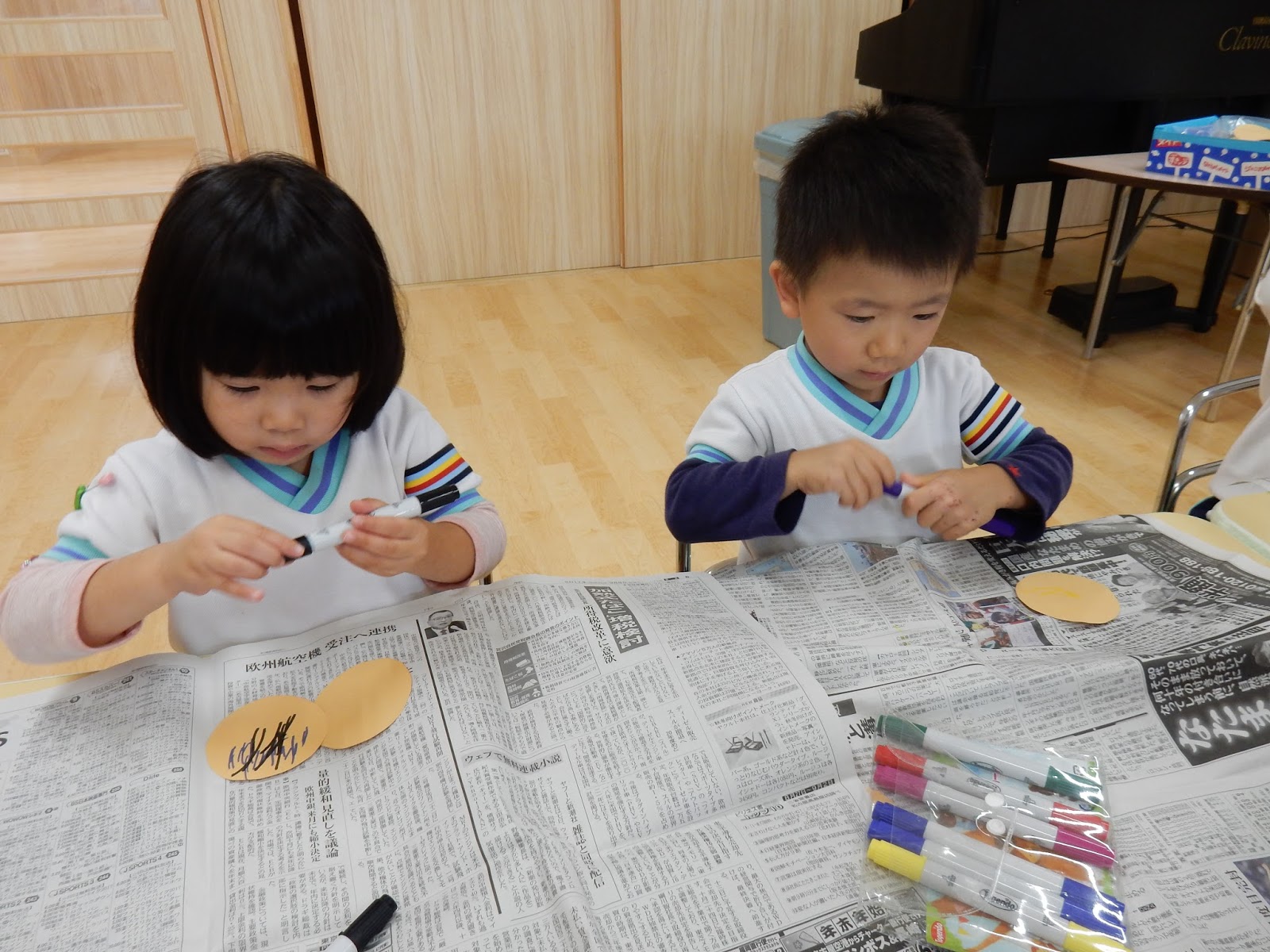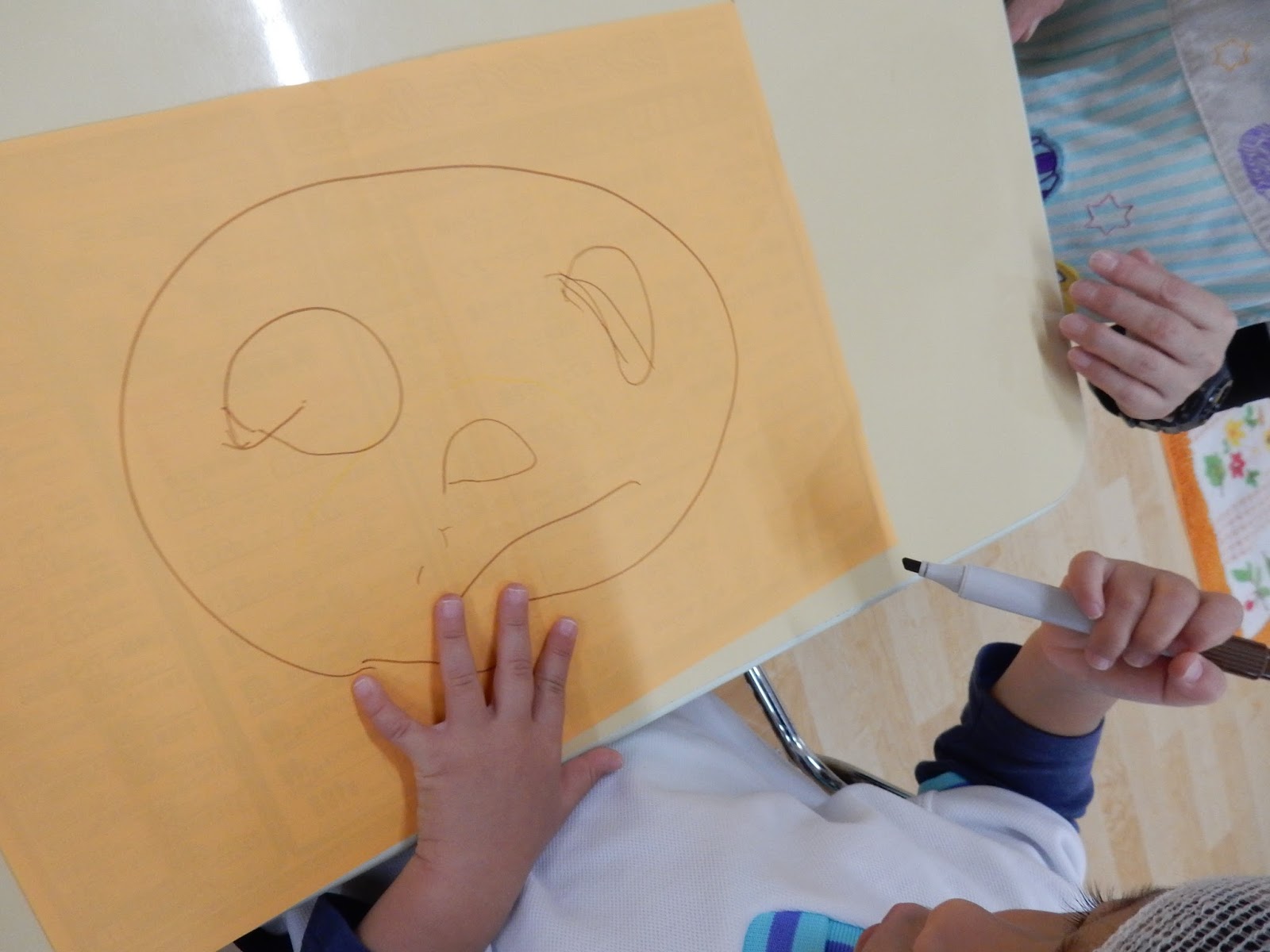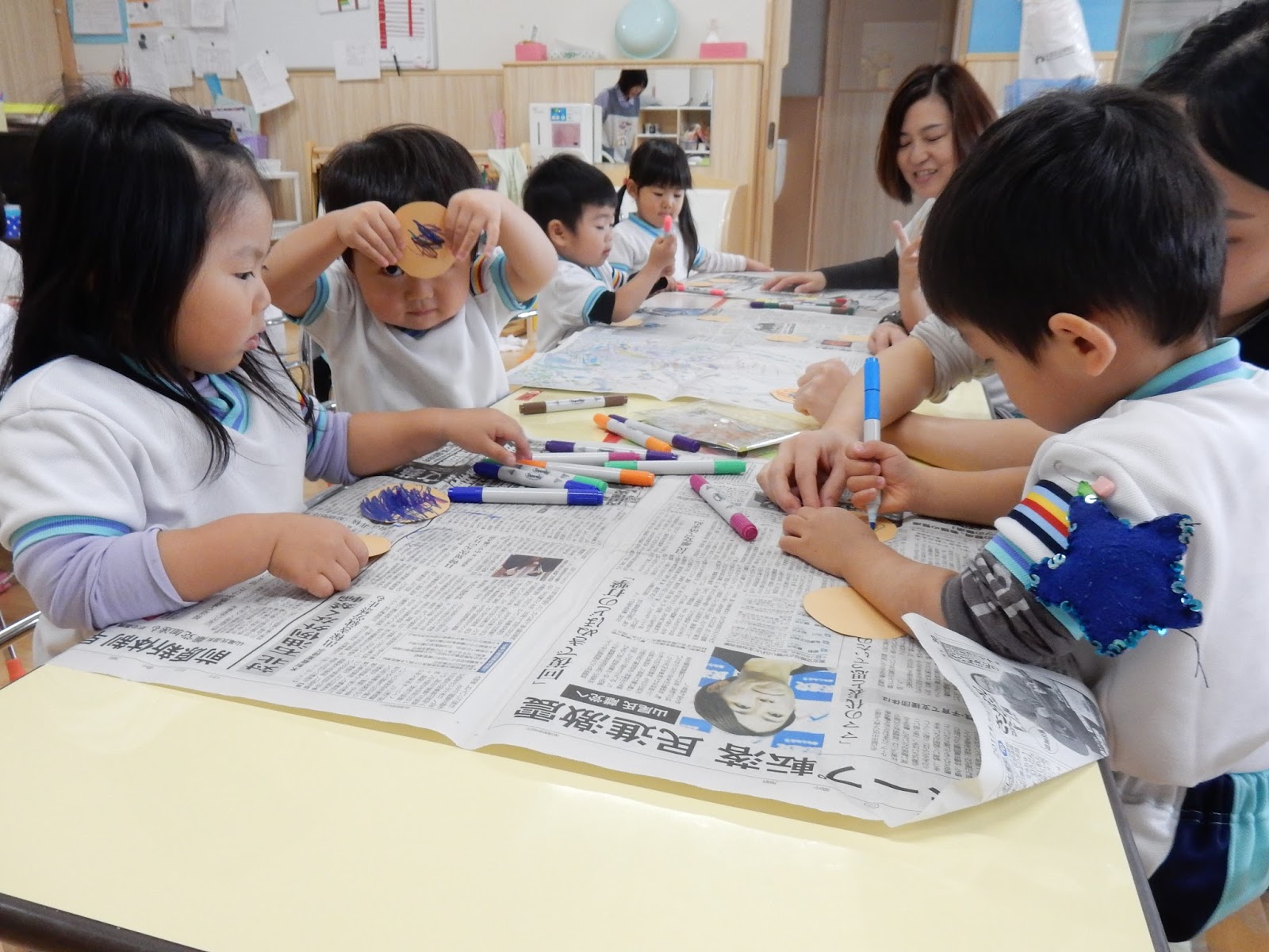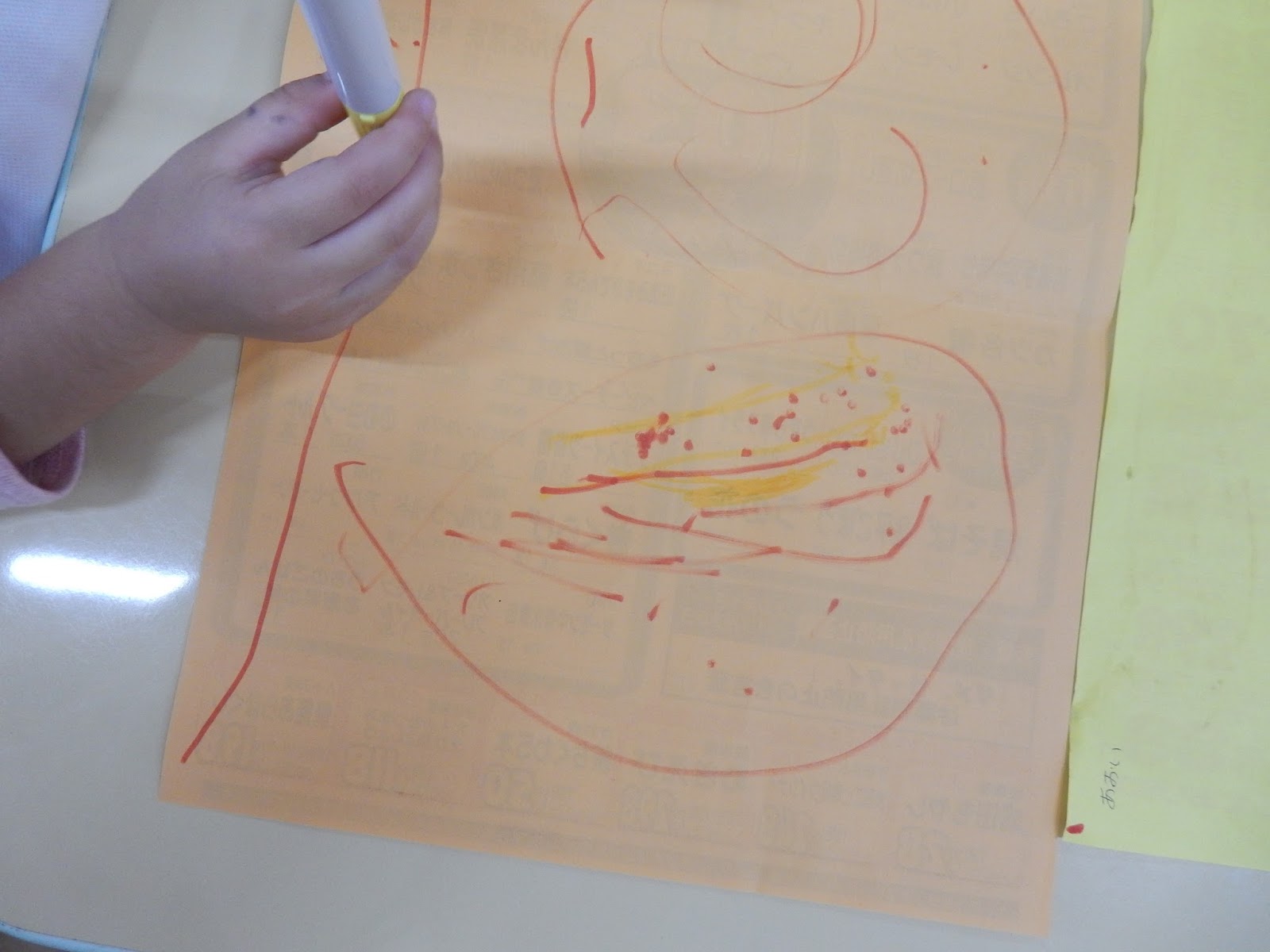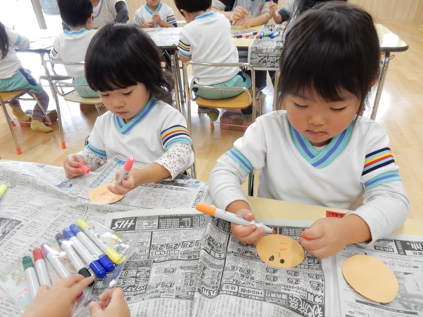 すみれさんは、お絵描き中。丸い画用紙に目や口を描いてあげて、葉っぱの洋服を着たミノムシさんの出来上がり!壁面に飾るんですって!まだしっかり顔のパーツを描けない子もいますが、しっかりペンを握って、力強く描くことができています。この後、みんな広告を1枚ずつもらって、たくさんお絵描きを楽しんでいましたよ!