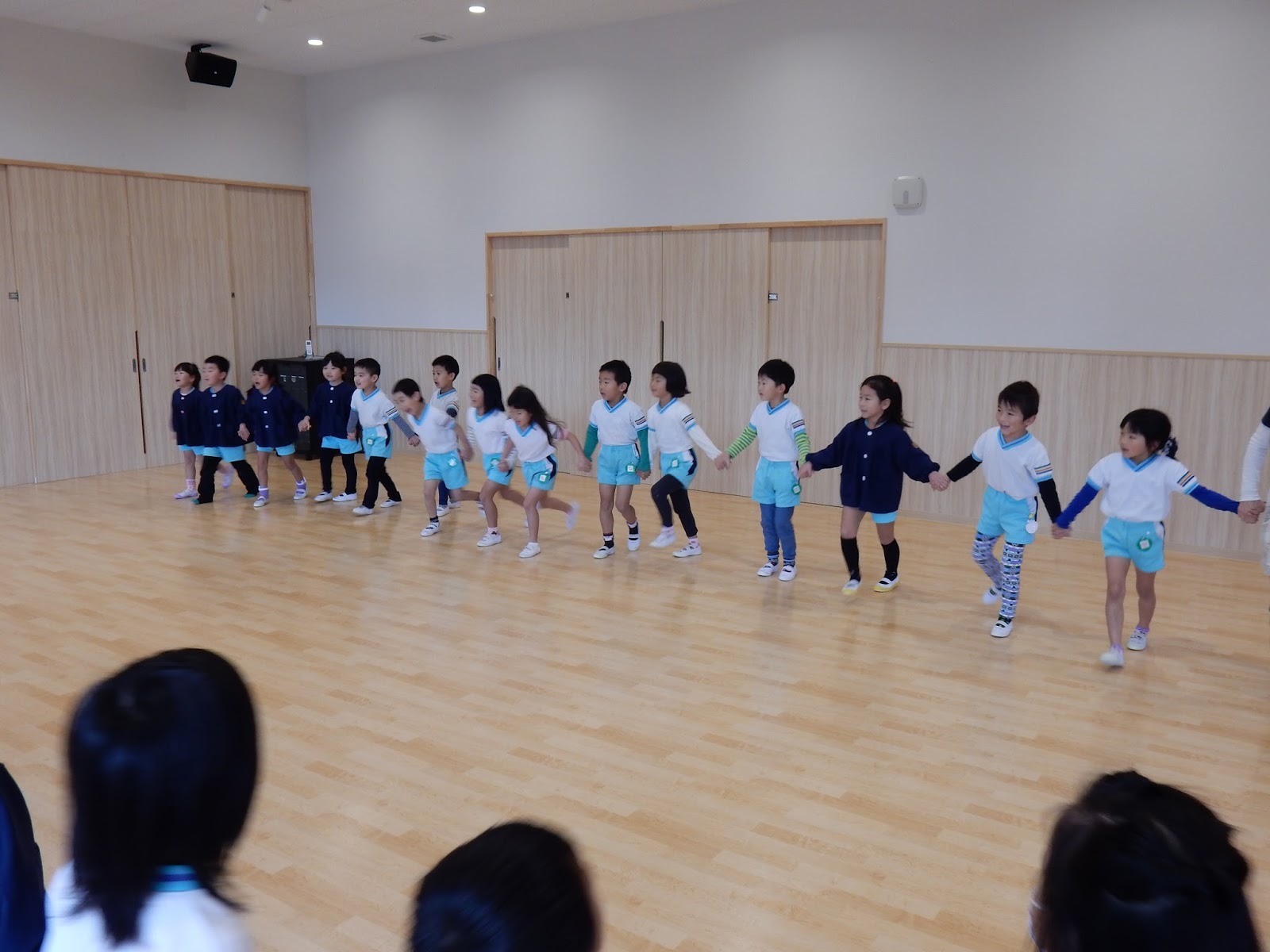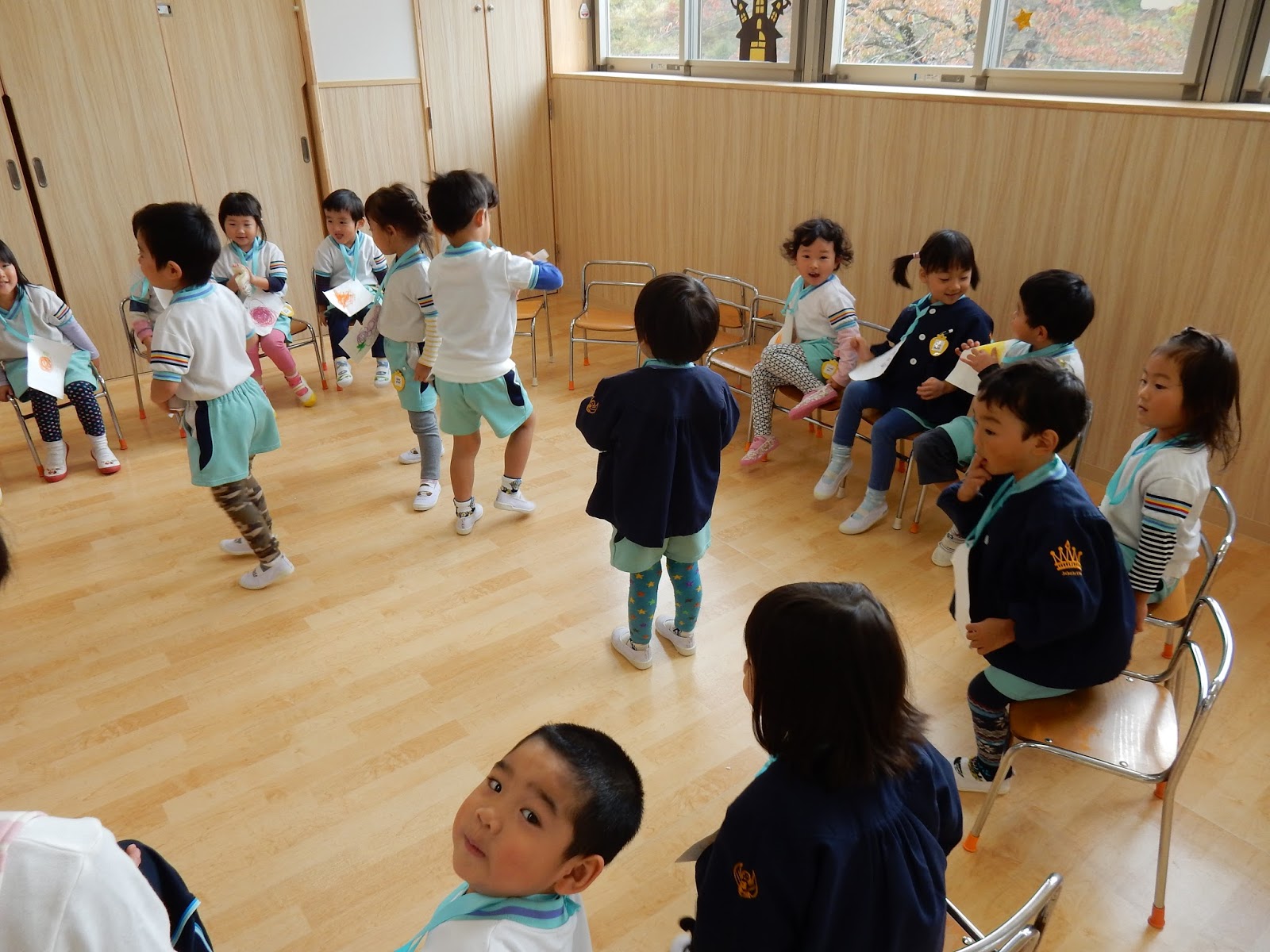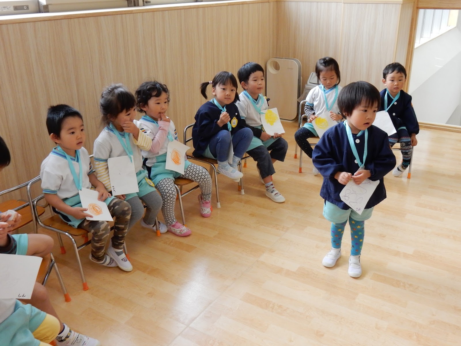 たんぽぽさんは、フルーツバスケット。自分たちで書いた4つのフルーツ。りんご、みかん、ぶどう、れもん。お友達や、先生が言うフルーツをよく聞いて立ち上がり、席替えします。中には、鬼になりたくて、座るのをためらう子も(笑)真ん中に立つって、特別な気分になれるのかな!?