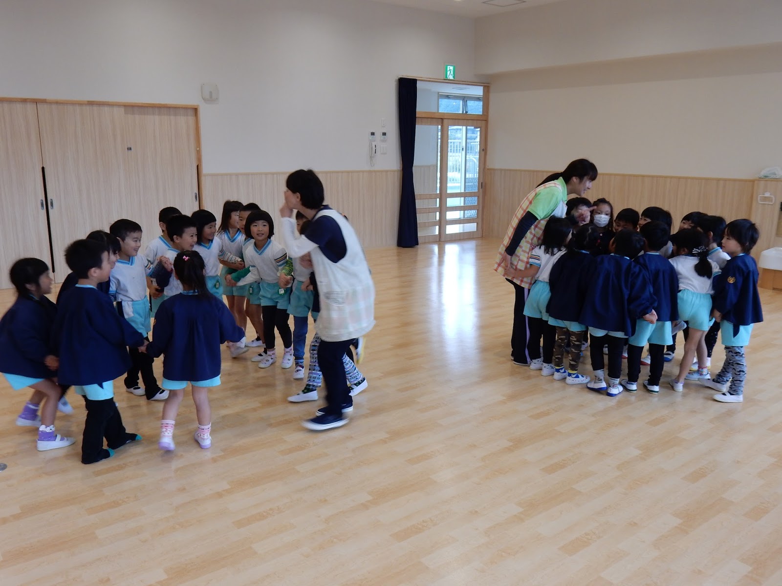 午前中はまだ雨ものこっていたので、室内で過ごしました。ひよこさんは、運動会で踊ったトテチテポを元気に踊ります!運動会当日はみんなで座り込み…でしたね!(笑)今日はみんな張り切って踊っていましたよ!最後の『ただいま~』では、まい先生にぎゅ~♡♡ちょっと場所がなくってお友達にぎゅ~!!こちらも可愛らしい♪