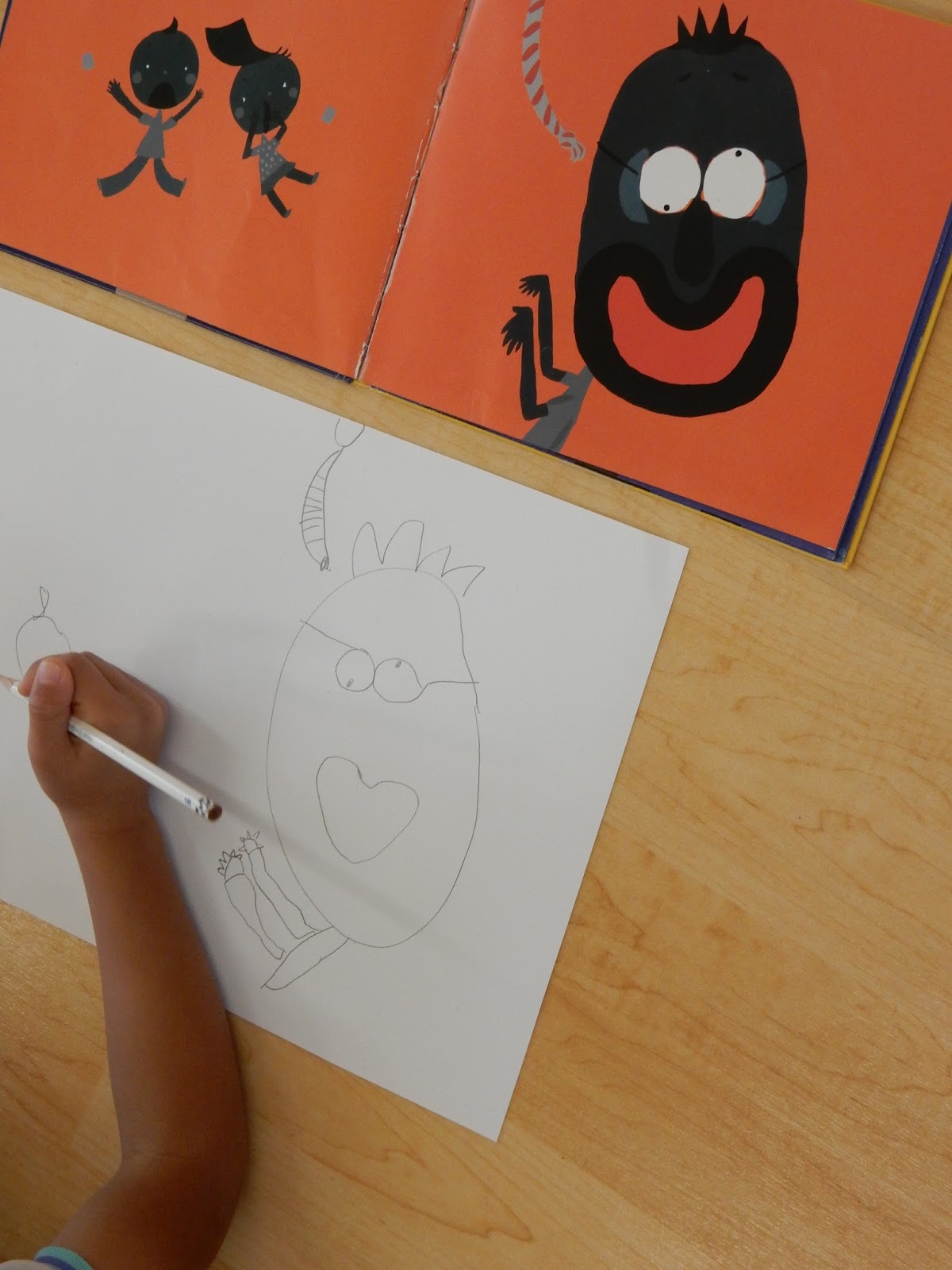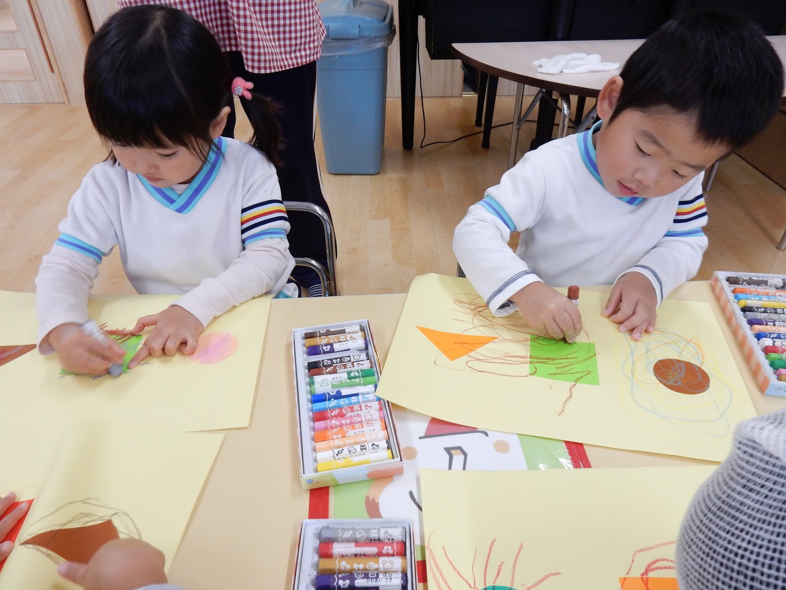 すみれさんは、今日もお絵描きを楽しんでいましたよ!画用紙に貼られた〇、▲、■を使って絵を描いてみました!上手く形を利用してかける子もいましたが、ほとんどのお友達はまだ、なぐり書きを楽しんでいます。いろんなお話をしながら描いているすみれさん。頭の中にはイメージが一杯!広がっているんでしょうね!