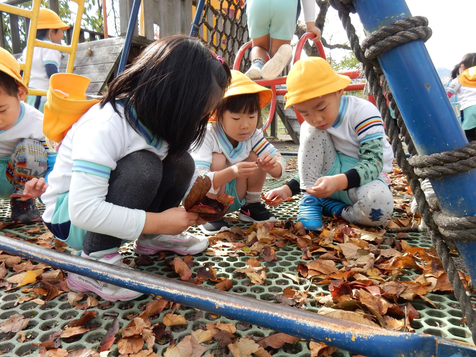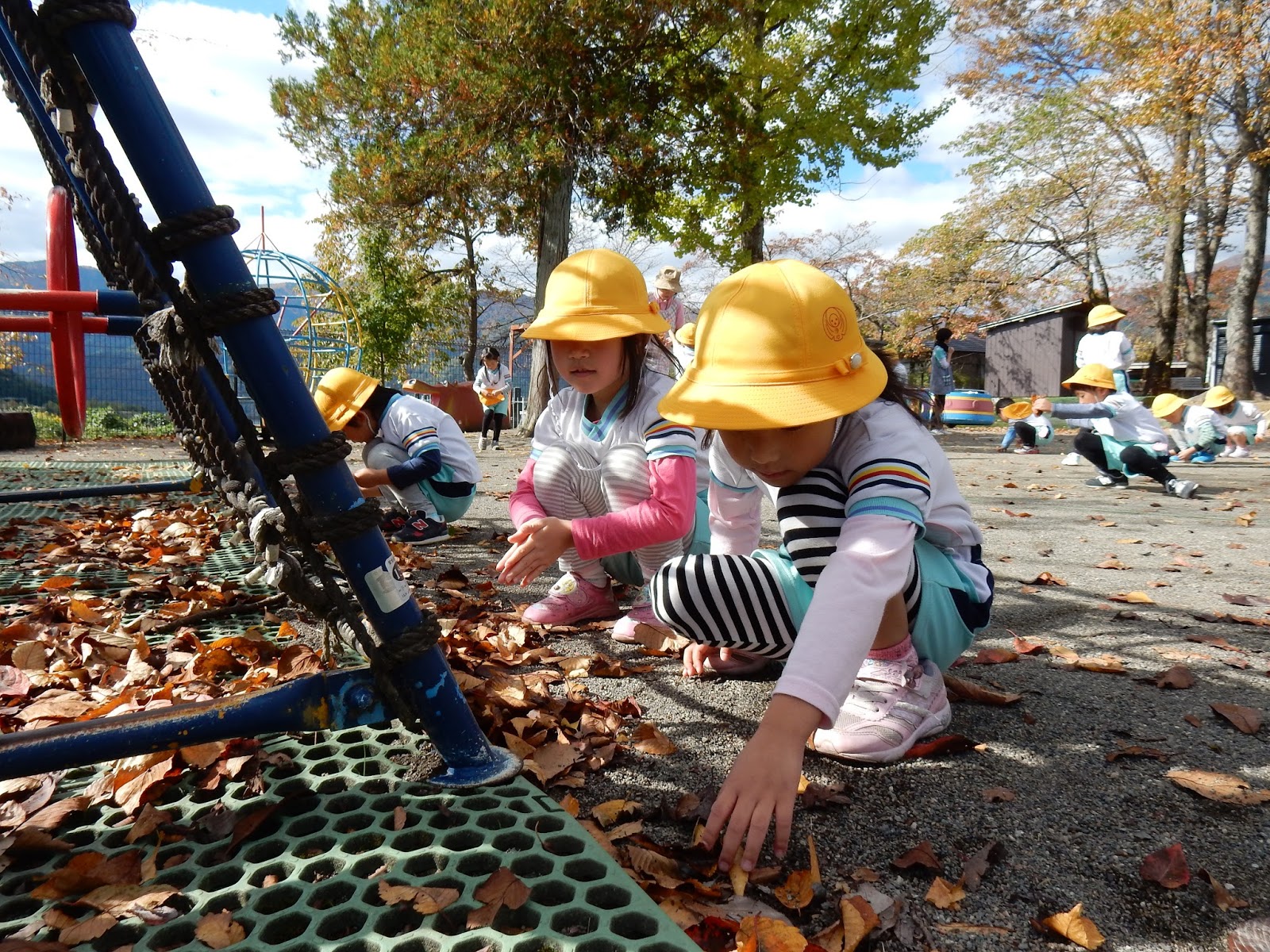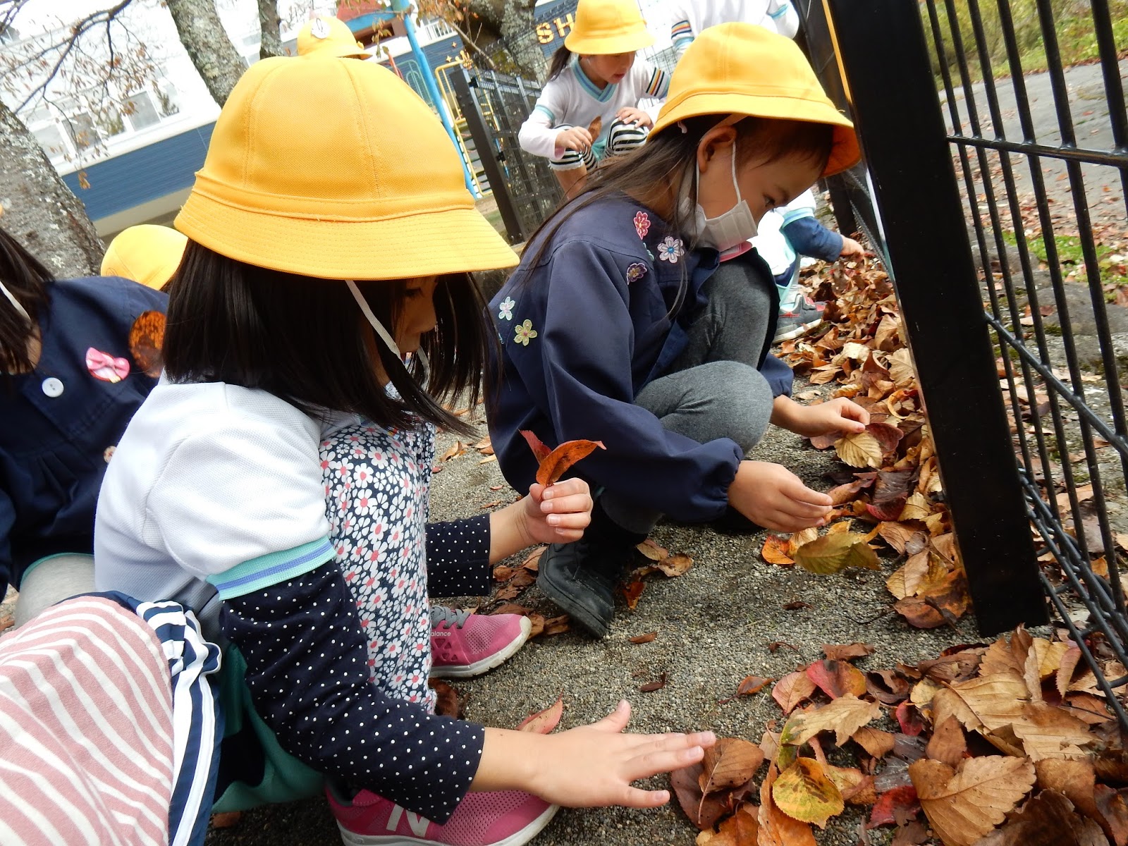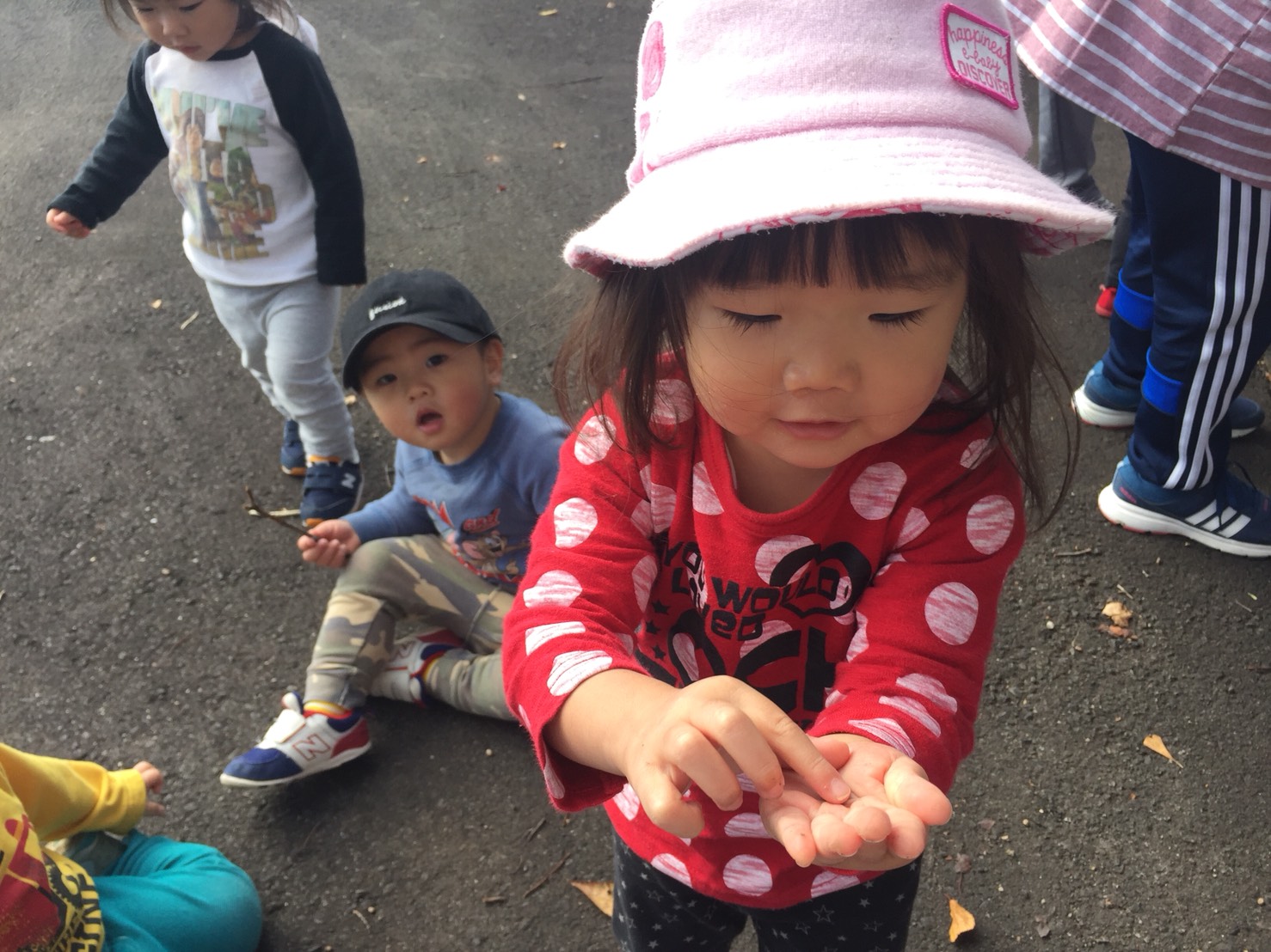マラソン後の園庭です。一生懸命下を向いて探し物をしているのはゆりさん。今日は、葉っぱを使ってスタンプ遊びです。スタンプに使う葉っぱを10枚集めて来てね!と愛先生。小さすぎないように。カサカサの葉っぱはダメだよ~!いろいろ条件を確認して集めます。