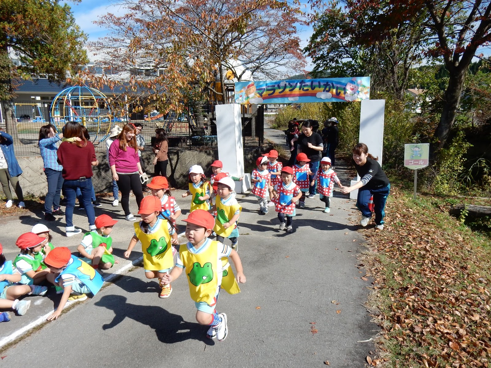 走り終わった後の子ども達。ピカピカの金メダルをかけてもらい、とっても満足そうでしたね!順位に関係なく、1人1人が練習から一生懸命マラソンに取り組んできました。速く走れるようになった事も成長ですが、このマラソンを通してとっても丈夫な身体作りができたのでは!?これから寒くなる時期ですが、今後もマラソンや、外で元気に遊ぶ事で、風邪をひかない元気なみんなでいようね!