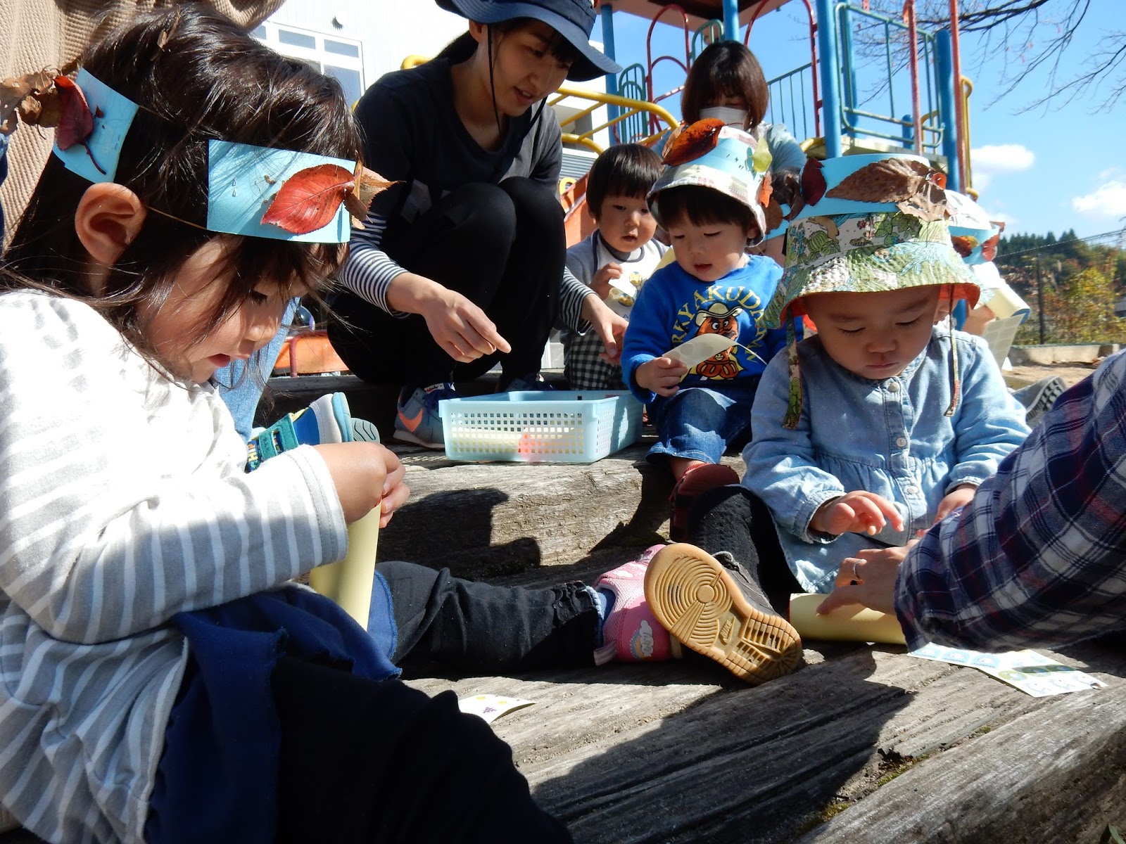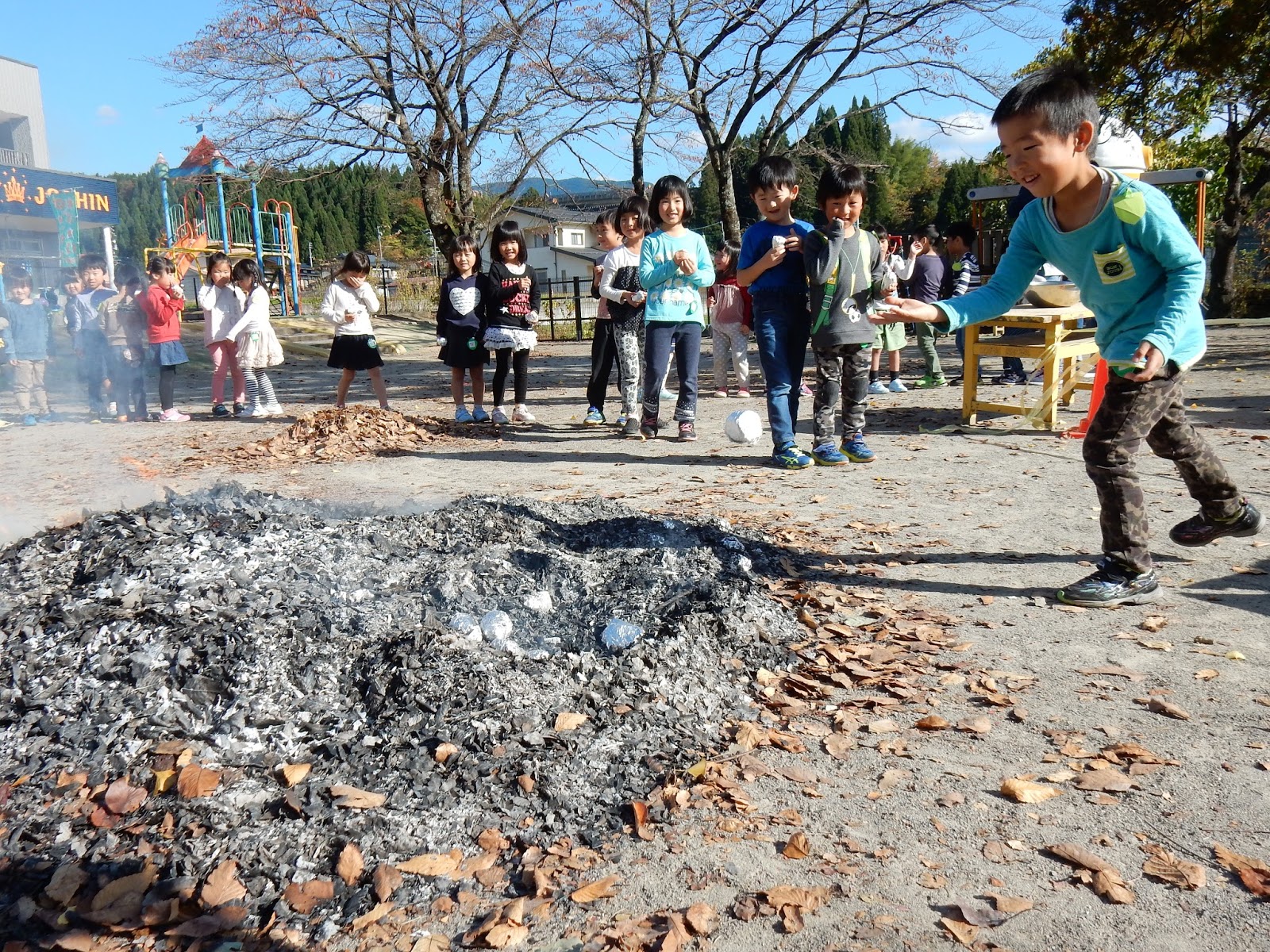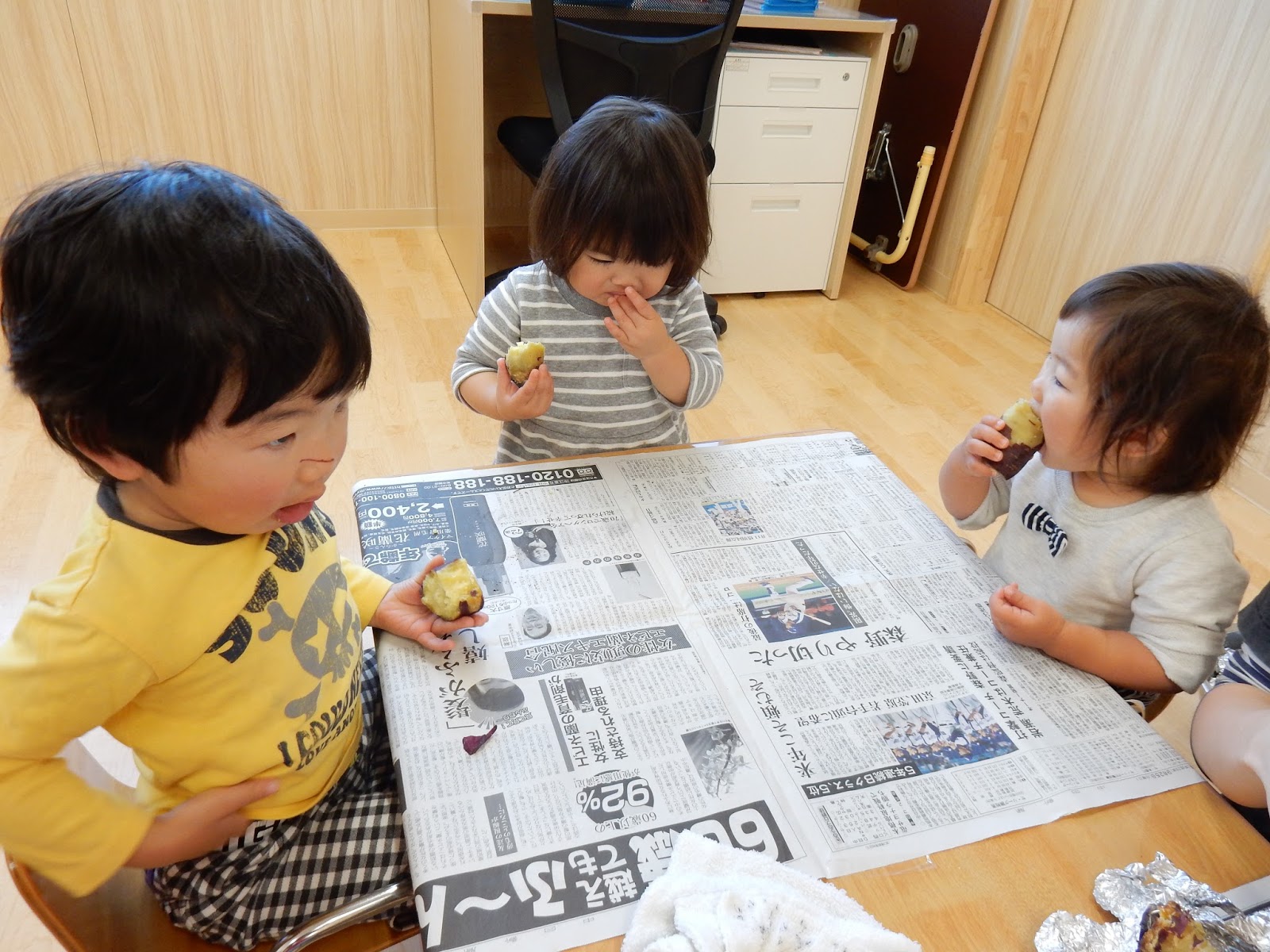 とっても気持ちの良い秋晴れになった今日。わいわいデーということで、園庭には朝からいろんなコーナーあそびの準備が。登園してきた子ども達も、その様子にワクワクしている様子でしたね!午前中は、秋で遊ぼうと題して自然をたくさん使って遊び、午後からは焼き芋パーティーと、1日しっかり秋を満喫しましたよ!