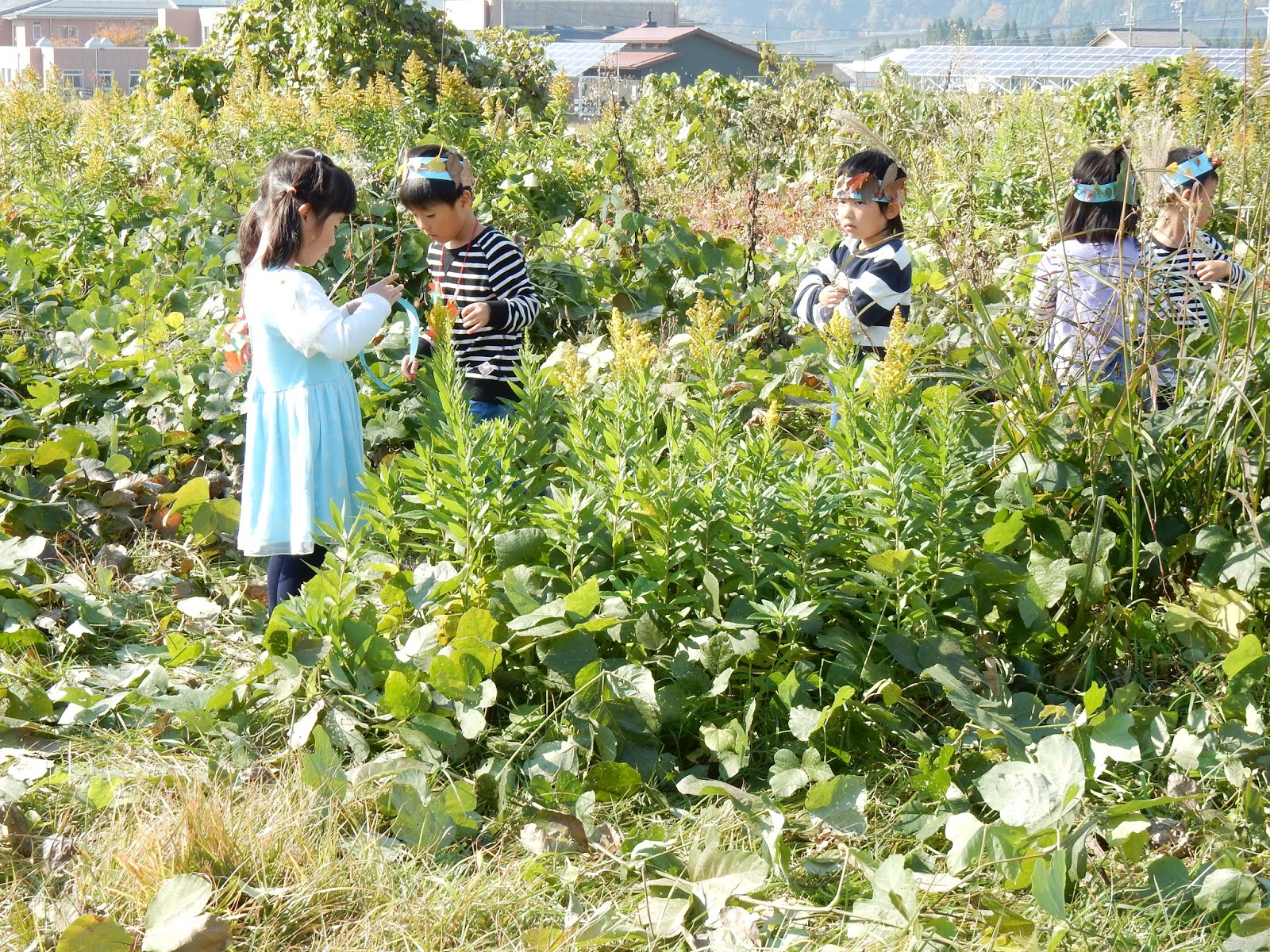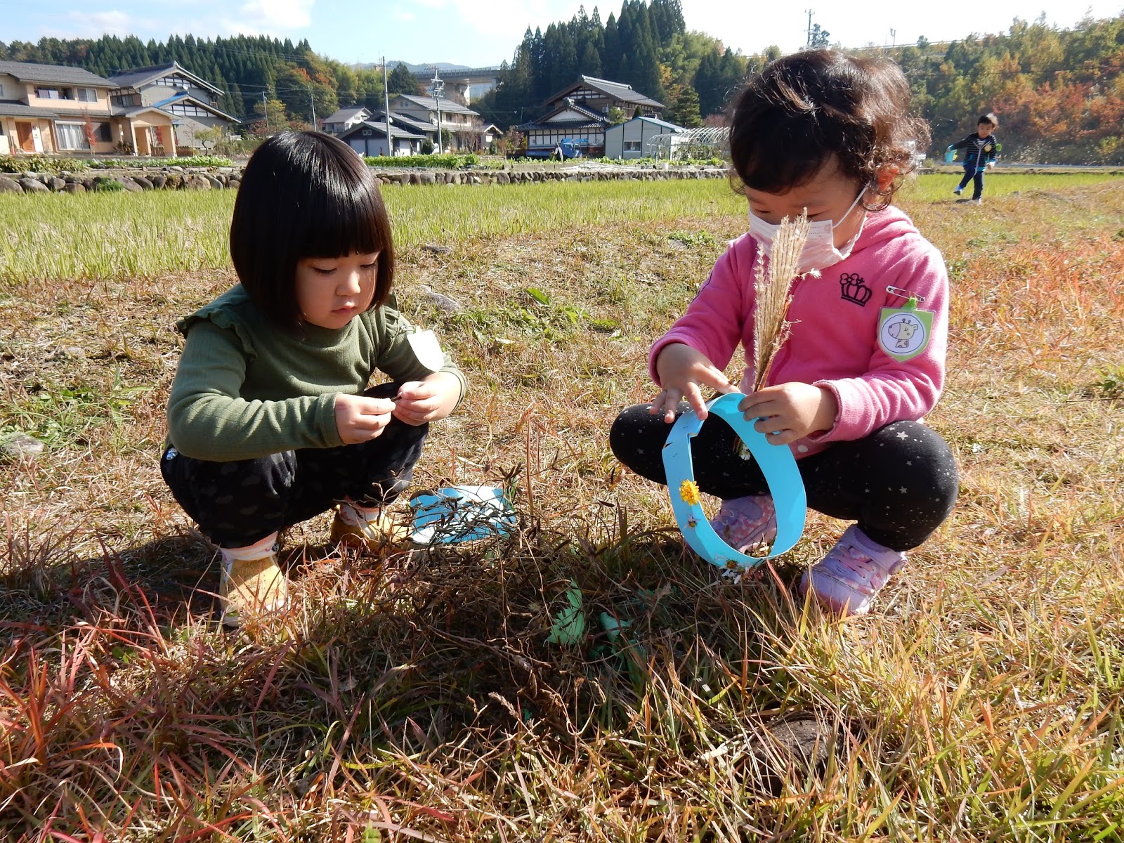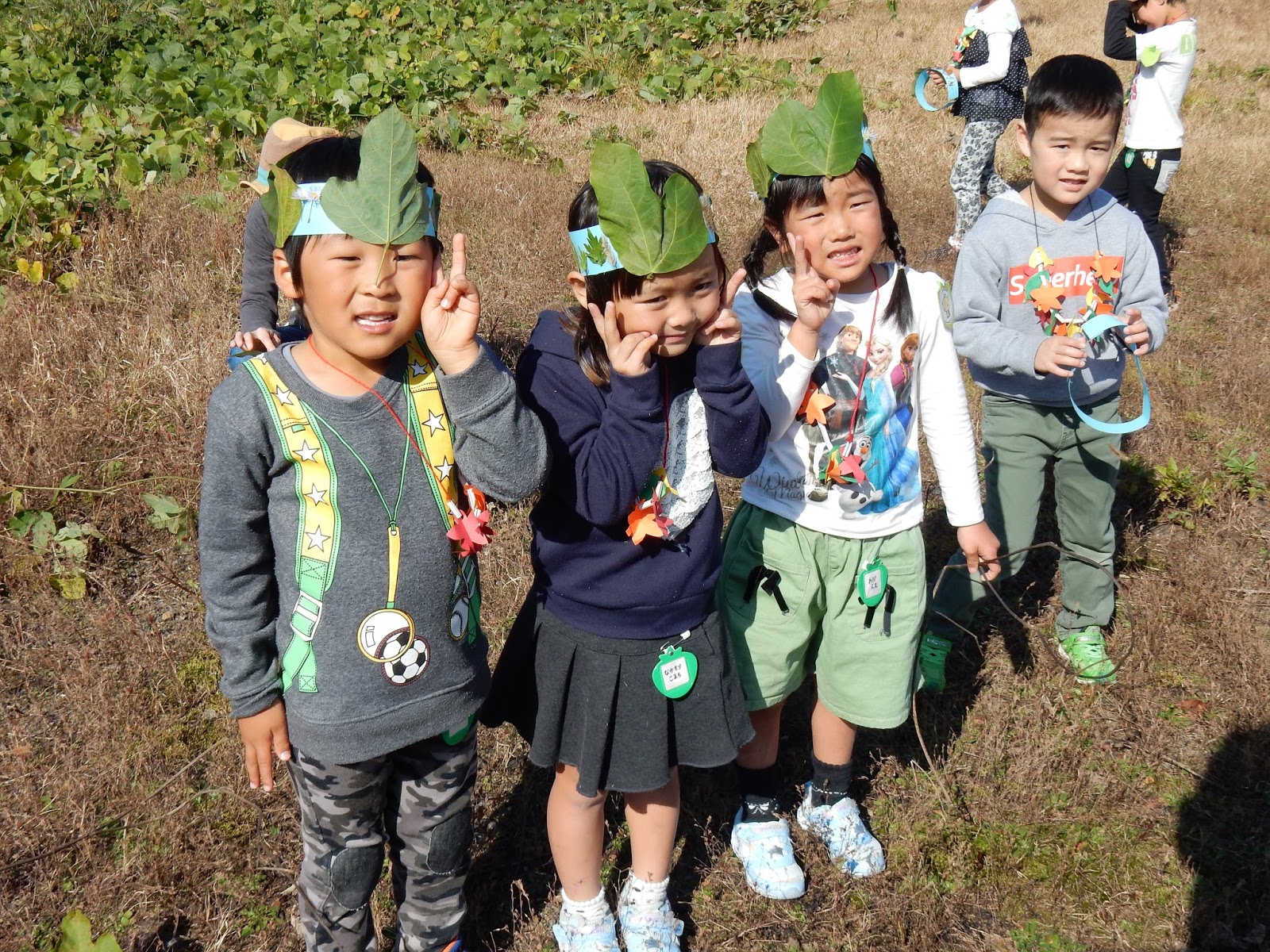 みんなの背丈ほどある草むらに入っていき、お好みの草花をどんどんつけていきます。これも個性が光っています!選ぶ素材が違えば、飾り方も様々。たんぽぽさんは、一生懸命マメを探していました!❝おかあさんといっしょ❞で歌っているビビンマメ!!だそうですよ!(笑)秋らしく、紅葉した葉っぱの他にも、いろんな素材を見つけてくることができました!
