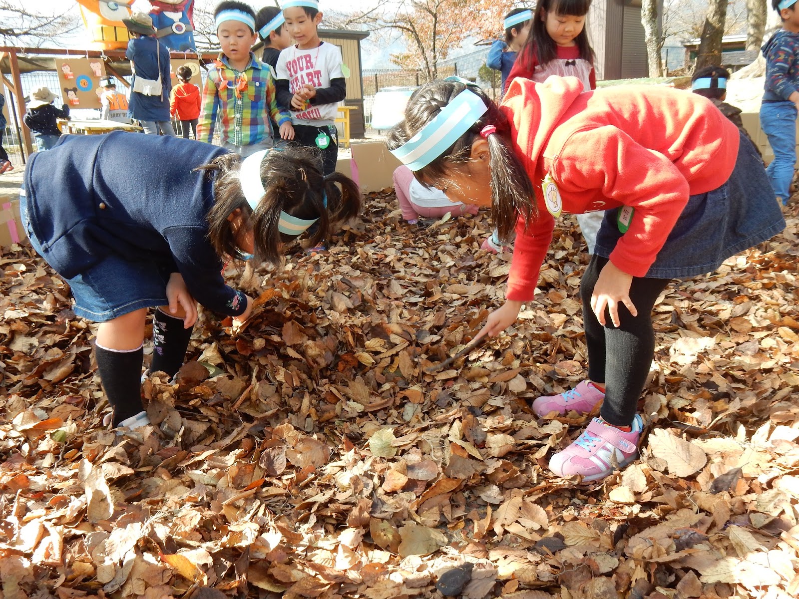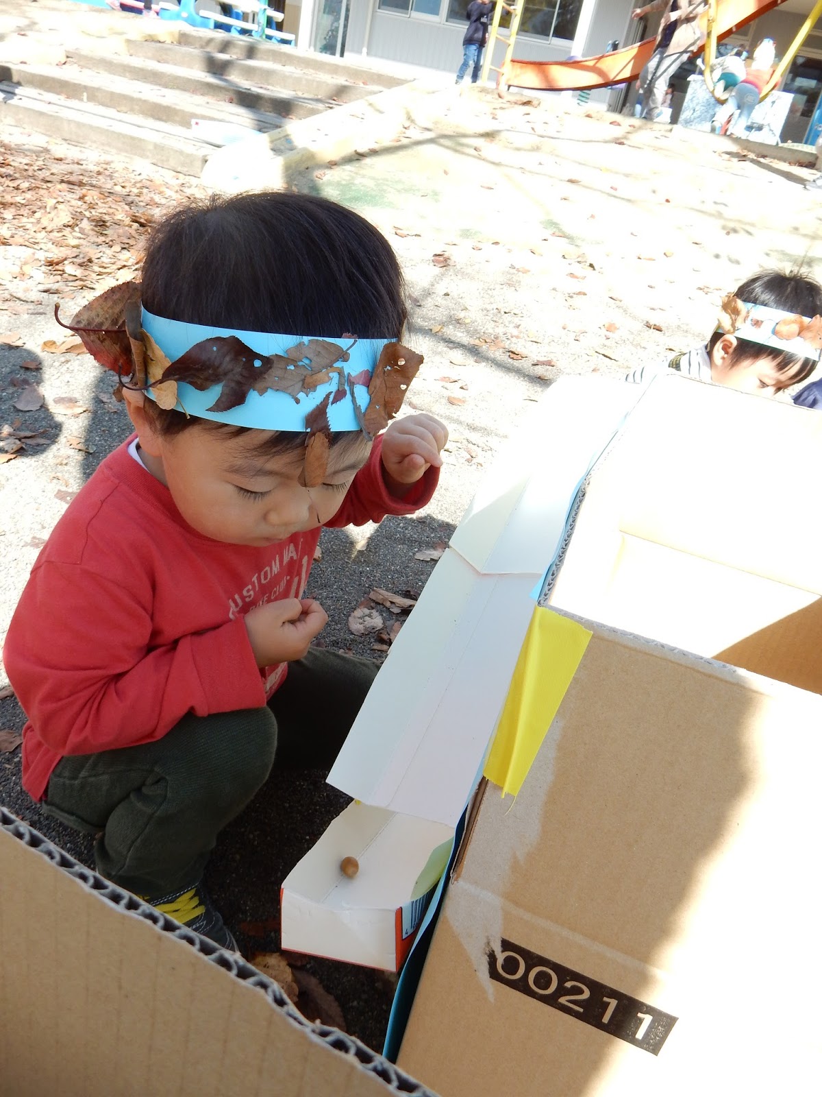 まずはこちら!ダンボールで囲んだ中には集めた落ち葉!さぁ、宝探しのスタートです!今日探すものは、どんぐり!!葉っぱの中から鈍栗を探すのはとっても!!難しかったです!