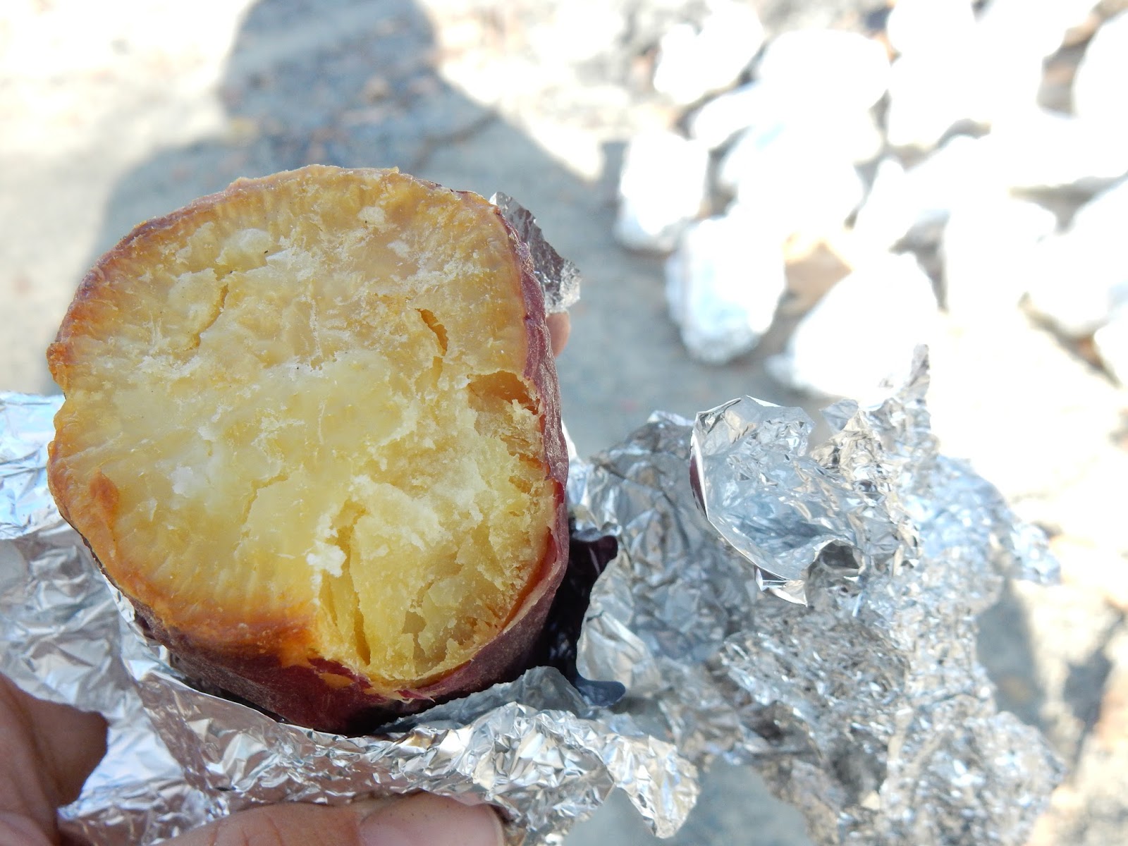 完成した焼き芋がこちら!とっても美味しそうでしょ!!はい、美味しかったです!♡大きいクラスのお友達は、アルミに包んだままのさつまいもを、『あつい、あつい!!』と言いながら持ち、包みを開けてパクリ♡焚き火を見ながらお外で食べると、また一段と美味しいですよね!
