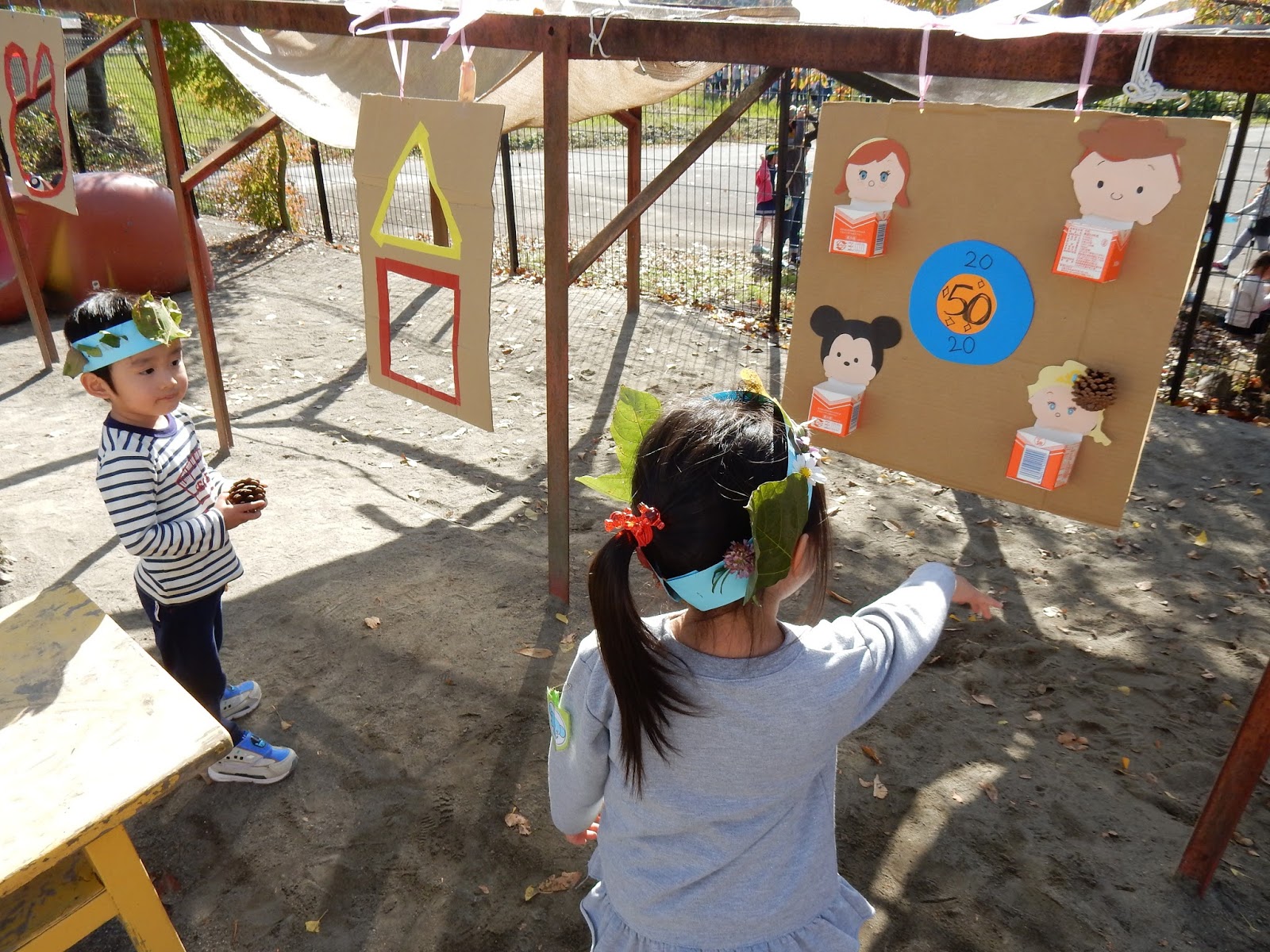 園庭では他にも、製作遊びやお絵かき。的当てを用意しましたよ!葉っぱの形に切った画用紙と、ストローを毛糸に通して秋色ネックレスと作ると、みんな真剣!とっても集中して通しました。松ぼっくりを使っての的当ては、近くから狙ってみたり、少し遠くから挑戦したり。何度も、何度も投げて、拾っての繰り返し。最初はできなくても、だんだんコツをつかんでくるのか、何回も入れれたよ!!と教えてくれる子も。