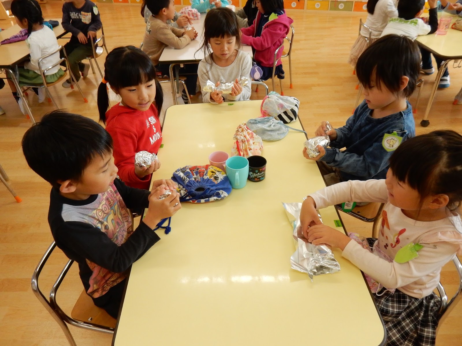 たっぷり遊んだら、もう1つのお楽しみ。午後からの焼き芋のためにさつまいもをアルミホイルで包みます。くるくる巻いて、両端を折って。葉っぱの中に入れるので、穴があかないようにみんな上手に包んでくれましたよ!
