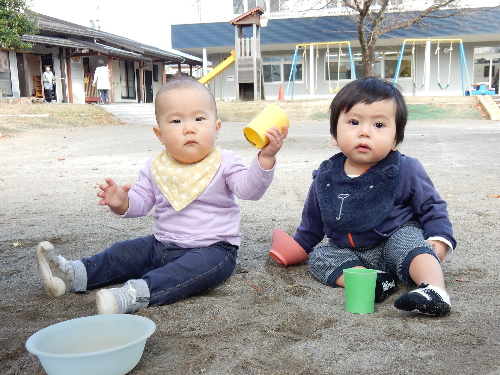 その後ひよこさんは砂場遊び。おもちゃを使って型抜きをしたり、ダンプを動かします。ひよこさんにとっては、坂道も大冒険!お尻をついて滑ってみたり、走り降りて足がもつれてしまったり…まだまだ目は離せませんが、何事も挑戦!やってみて、失敗して、練習して、上手くなっていくんですよね!そんなみんなの頑張りを見守りたいですね♪