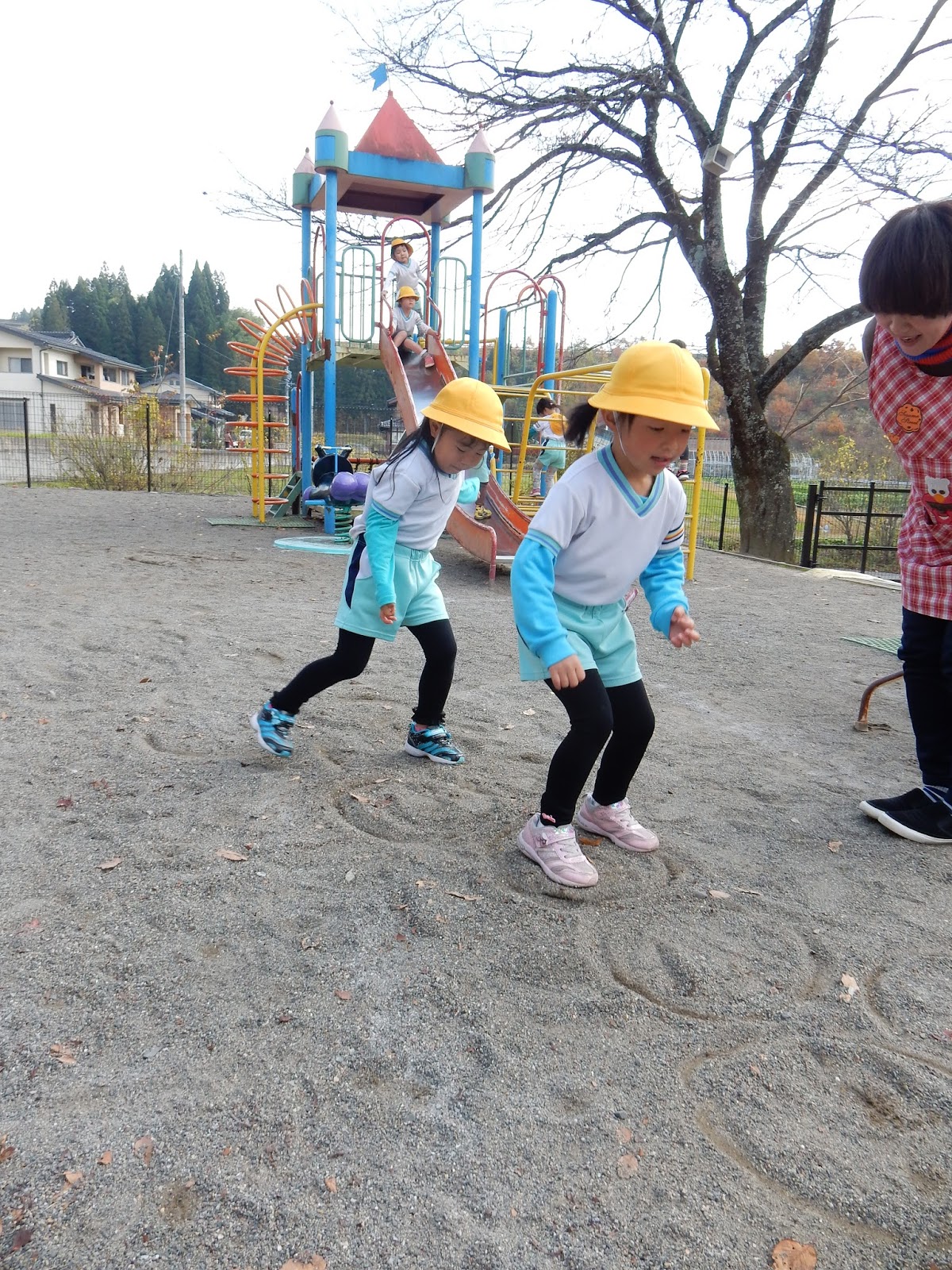 ひまわりさんは、少しレベルアップして“かかし”という遊び、ご存知ですか!?かかしを何コマ化に分けて描き、そこに小石を投げ入れたり、マスを飛ばして進んだり。複雑ですが、覚えてしまえば頭も使い、ハマる子続出。最初はここ、ここ!と教えてもらいながら進んでいましたが、慣れてくると自分でスムーズに進んでいきます。