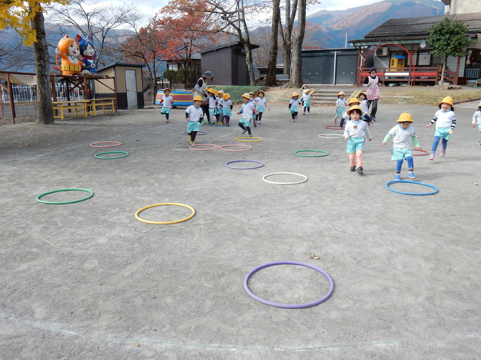 鬼さんに捕まらないようにみんな一目散に走って行きます!フラフープの色をしっかり確認して。。。 ムラサキはどこ!?