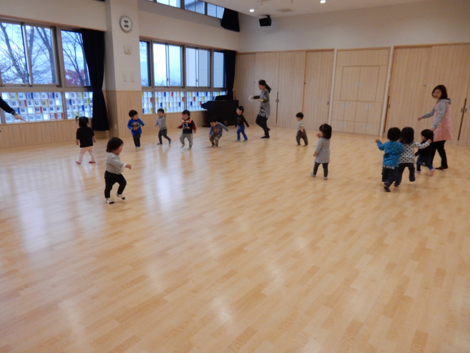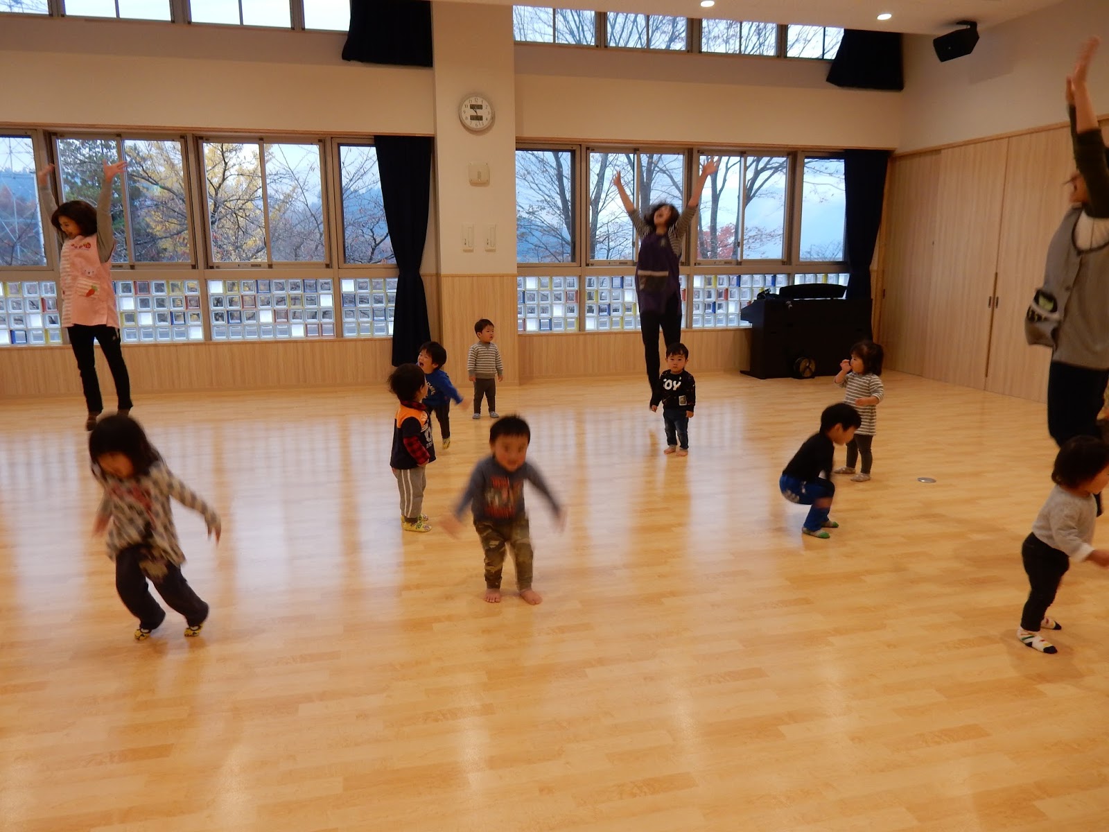 ホールに着いたら、走る、走る!!!これだけ広いと、まずは走りたくなります!転ばないように、ぐるぐる何周も走ります。そしてその後は体操。子ども達も元気いっぱいですが、先生達だって汗をかくほど真剣!!