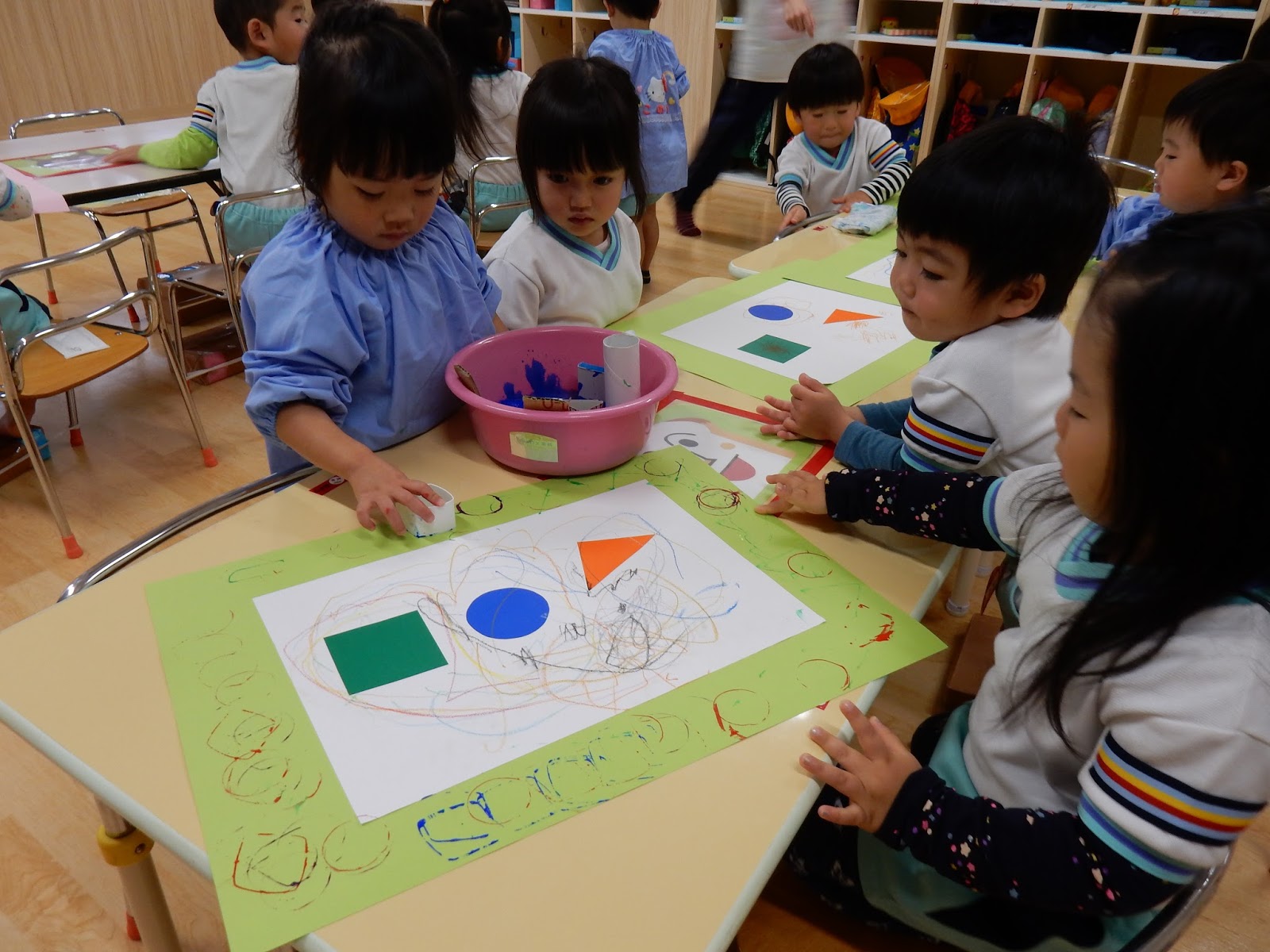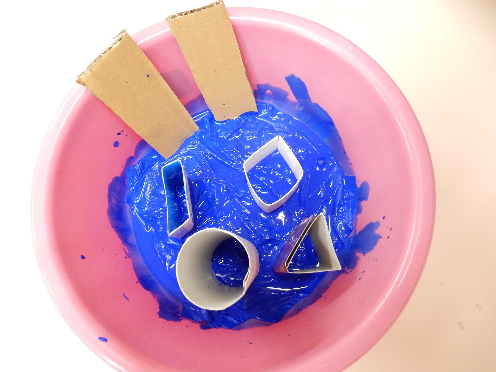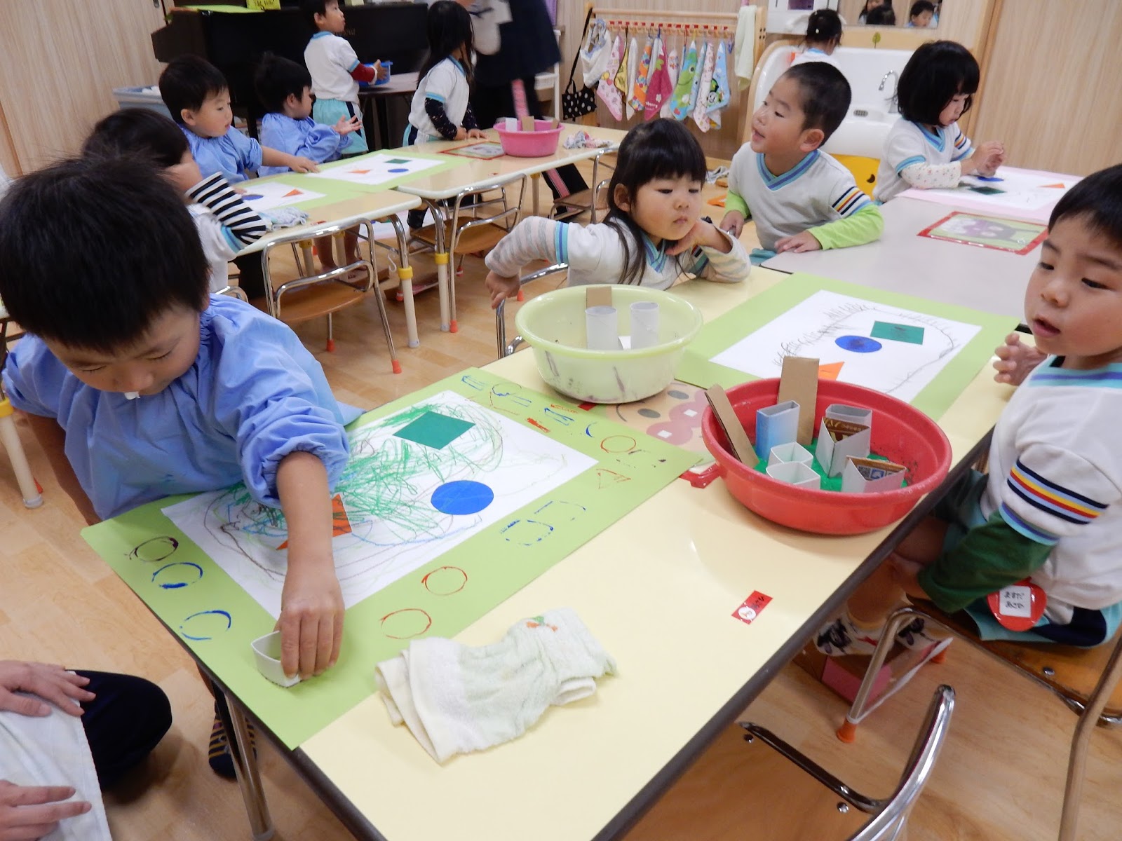 すみれさんは、今日はスタンプ遊び。いろんな型がありますね。よく見ると、この型は、ダンボールや、箱などを使って作ってあります。なので、ご家庭でも絵の具があれば挑戦できますよ♪画用紙の上にぽんぽん…とスタンプしながら、形の違いを楽しみました。