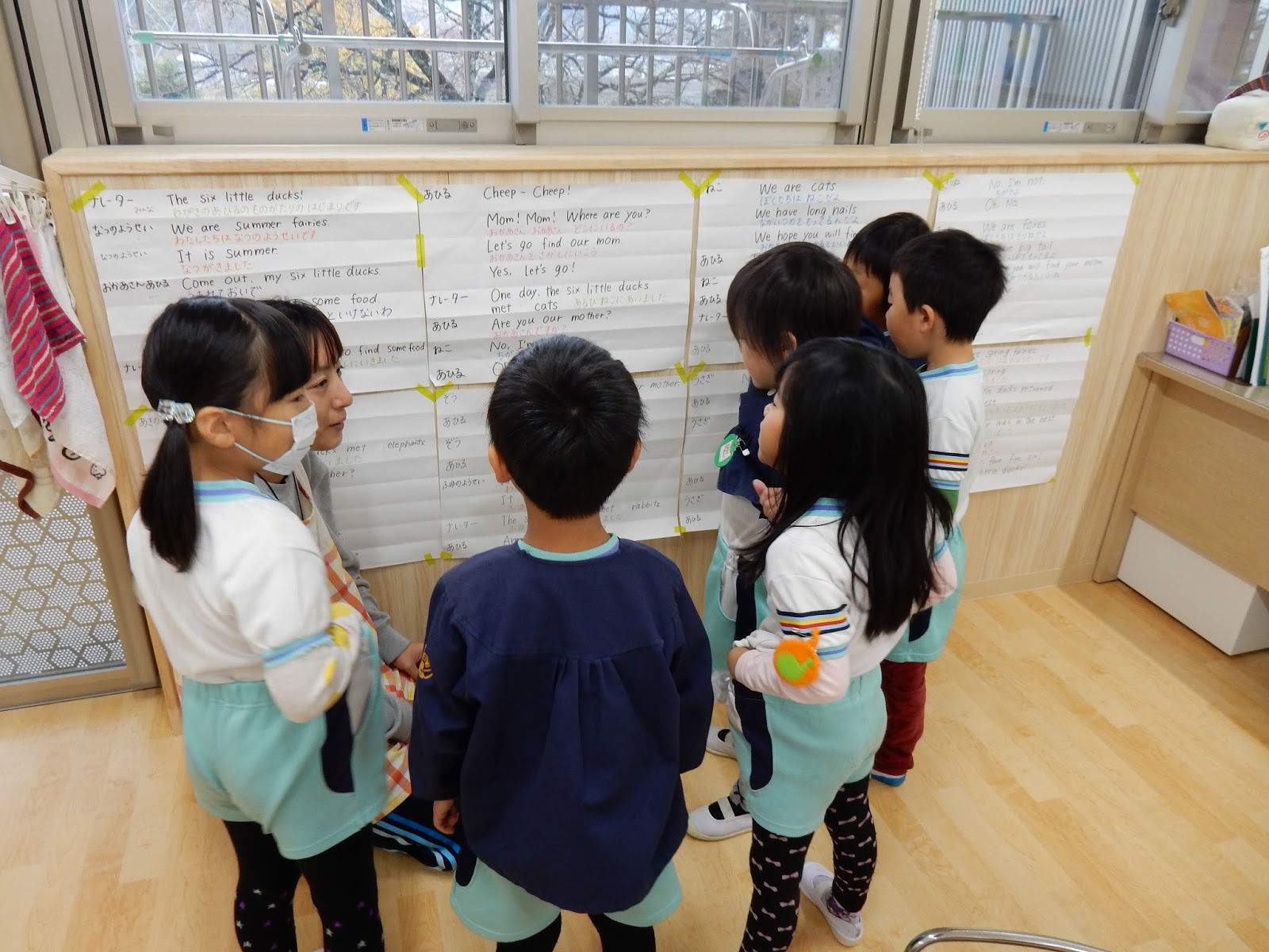 ひまわりさんの英語も、お部屋にシナリオを貼り、先生から発音を教わります。最初は全然わからない!!!!という感じで、1つ1つの単語をバラバラに話していますが、子ども達の記憶力…うらやましいです(笑)あっという間に覚えてしまいます!毎日の積み重ねで、舞台で堂々とお話できるようになってくれるといいなぁ!