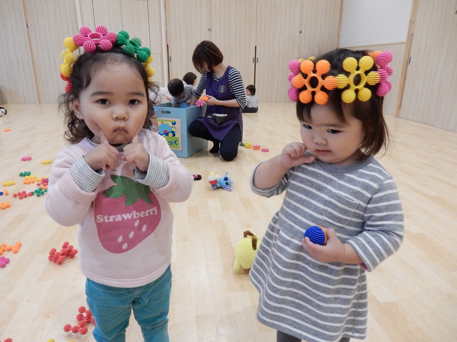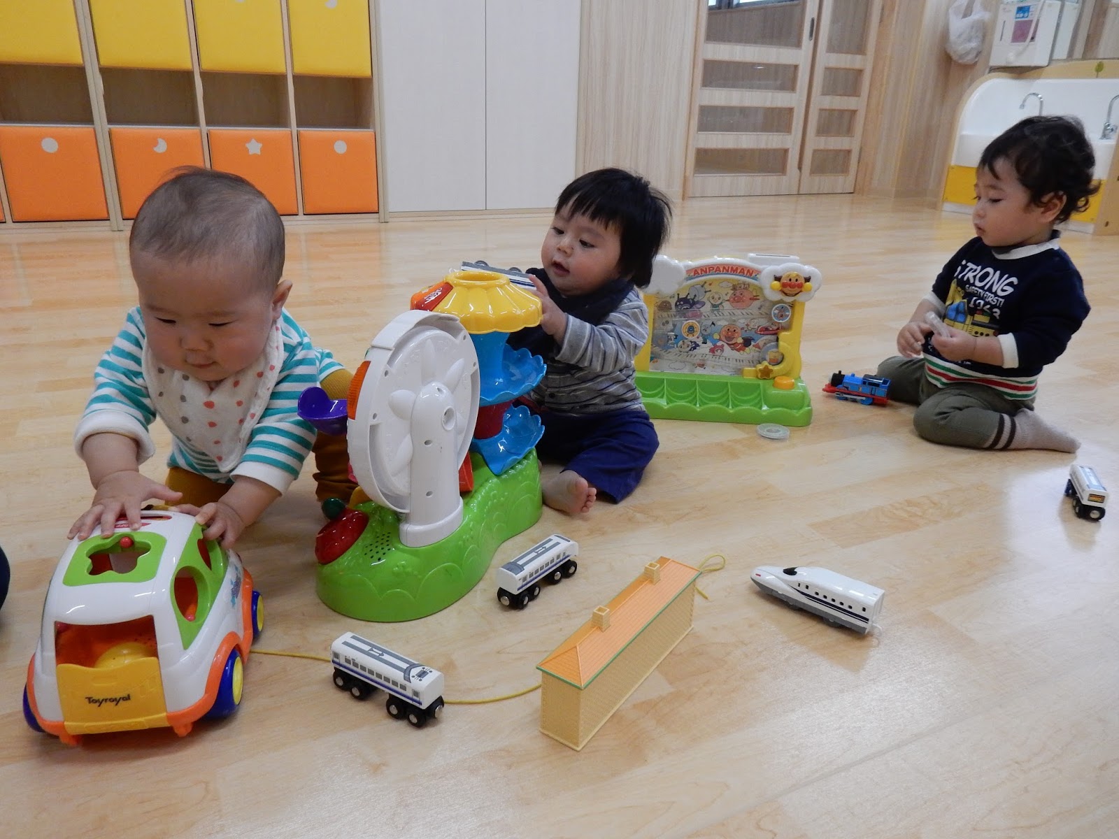 お部屋にはないおもちゃで遊ぶのも気分が変わっていいですね♪大きい子がホールへお出かけしている間、0歳児のちびっこチームはひよこさんのお部屋でのんびり、ゆったり先生と過ごします。成長に合わせて空間を分けることで、お互いに十分遊ぶ事ができ、満足感へとつながりますね!
