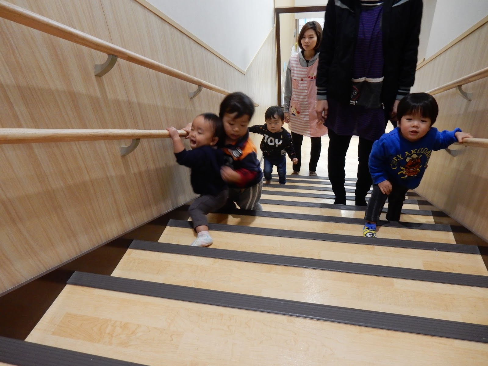 階段を一生懸命登ってひよこさんがホールへ遊びに行きます。階段を上るのもよい運動!!ひよこさんにとっては楽しいお出かけです♪