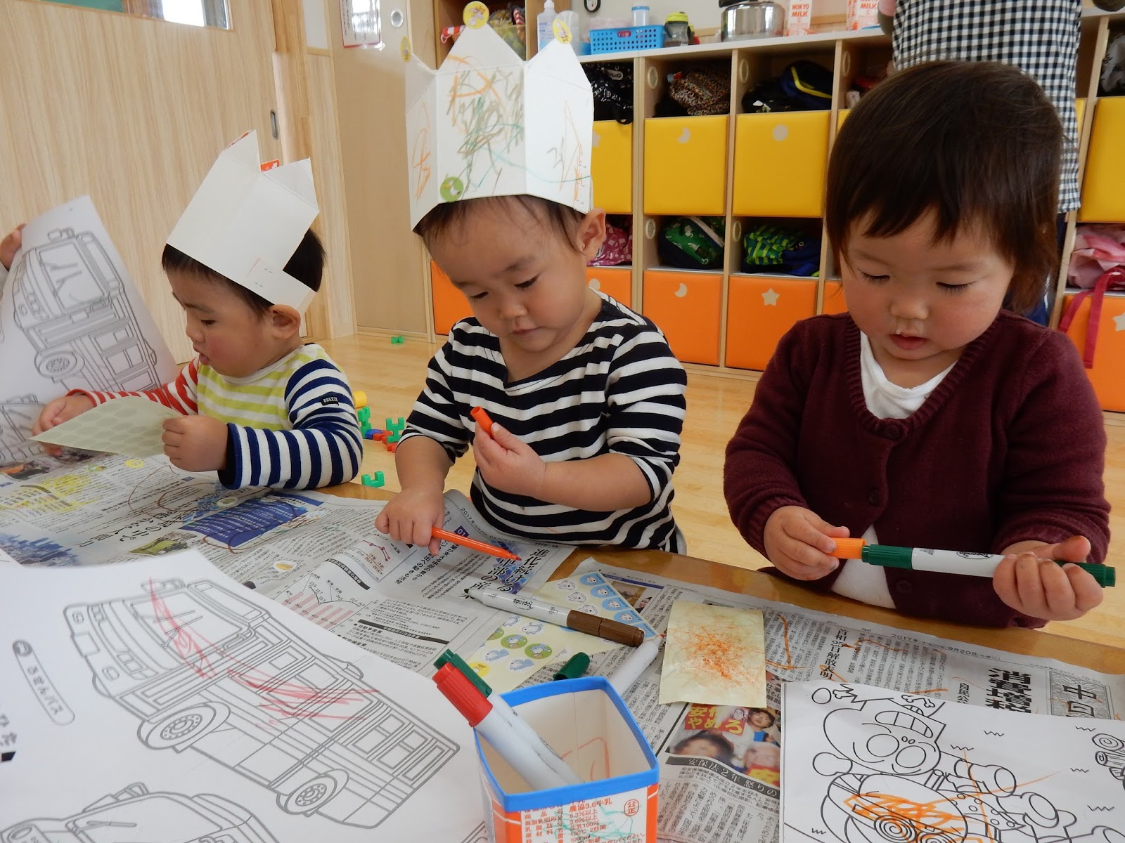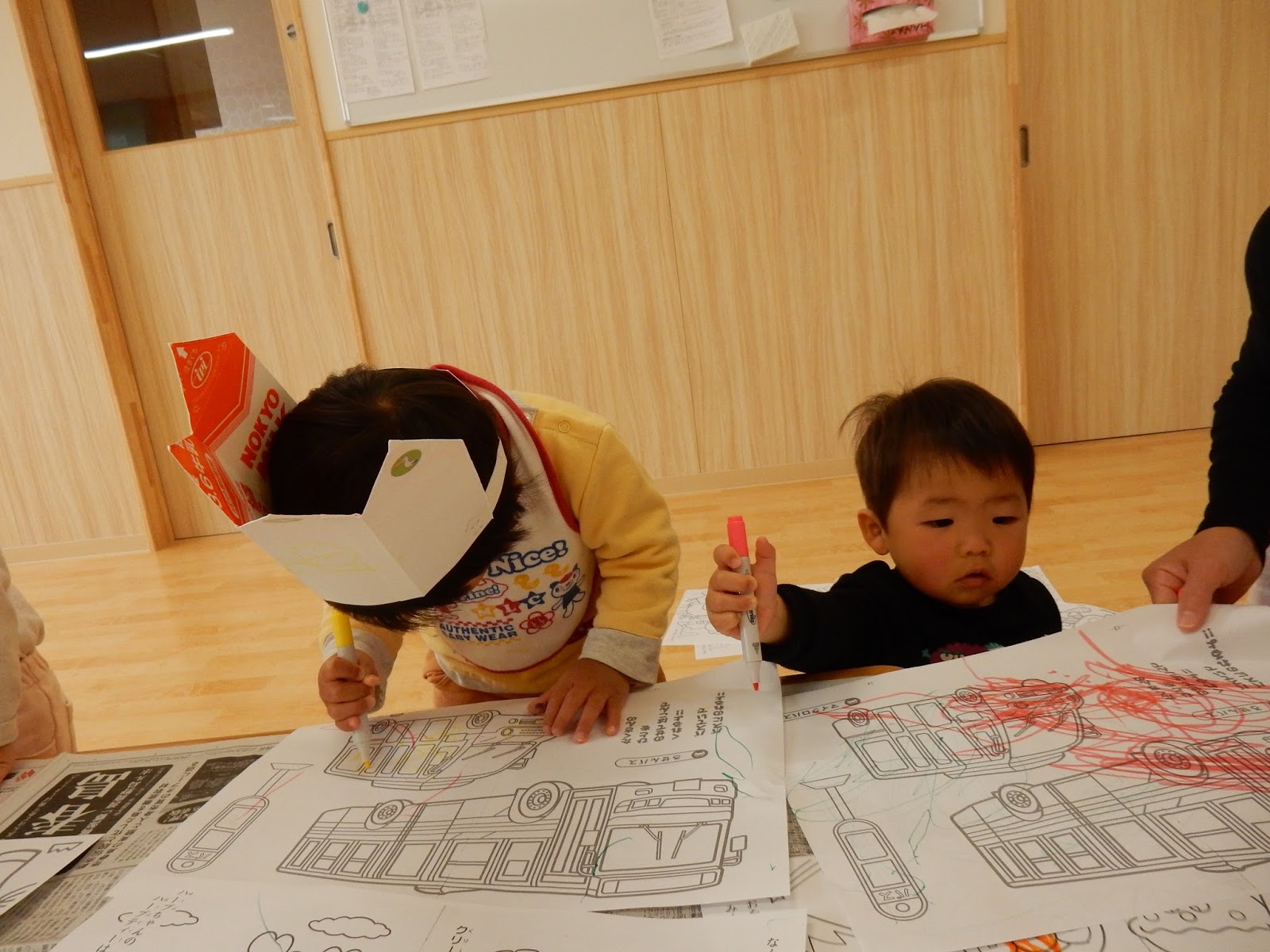 待っているお友達にも楽しみが♪牛乳パックで作ってもらった冠にお絵描きしたり、シールを貼ってみました!アンパンマンや、バスの描いたぬり絵を届けると、予想以上に良い反応を見せてくれましたよ!