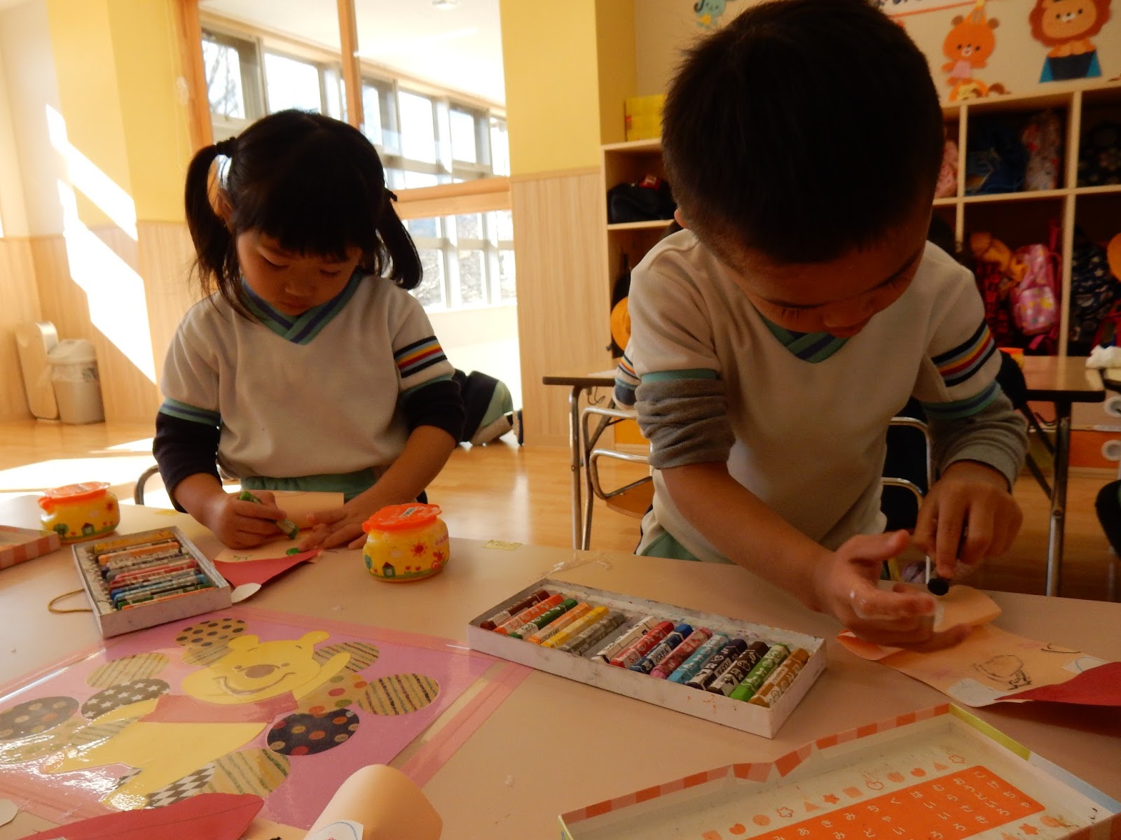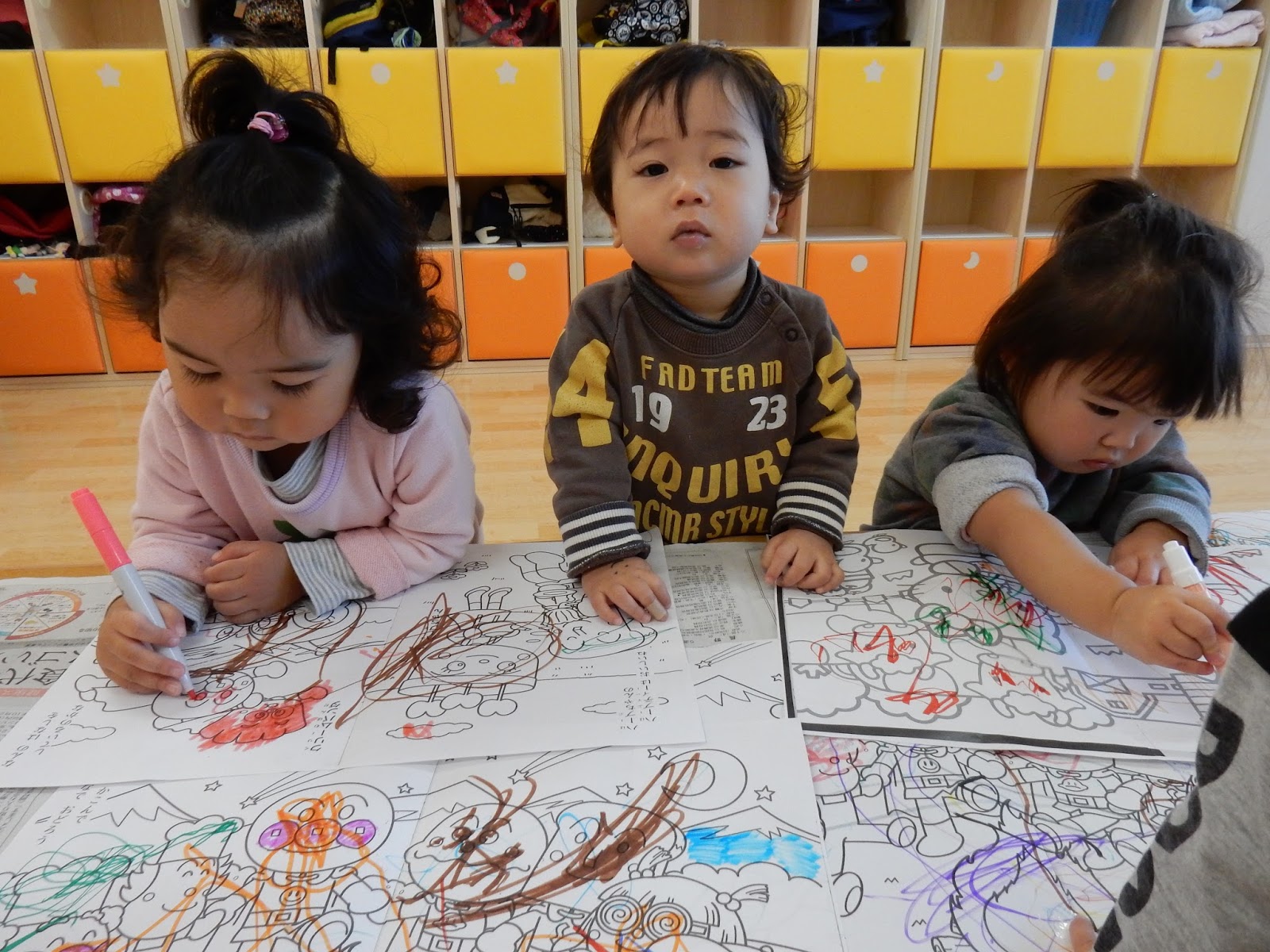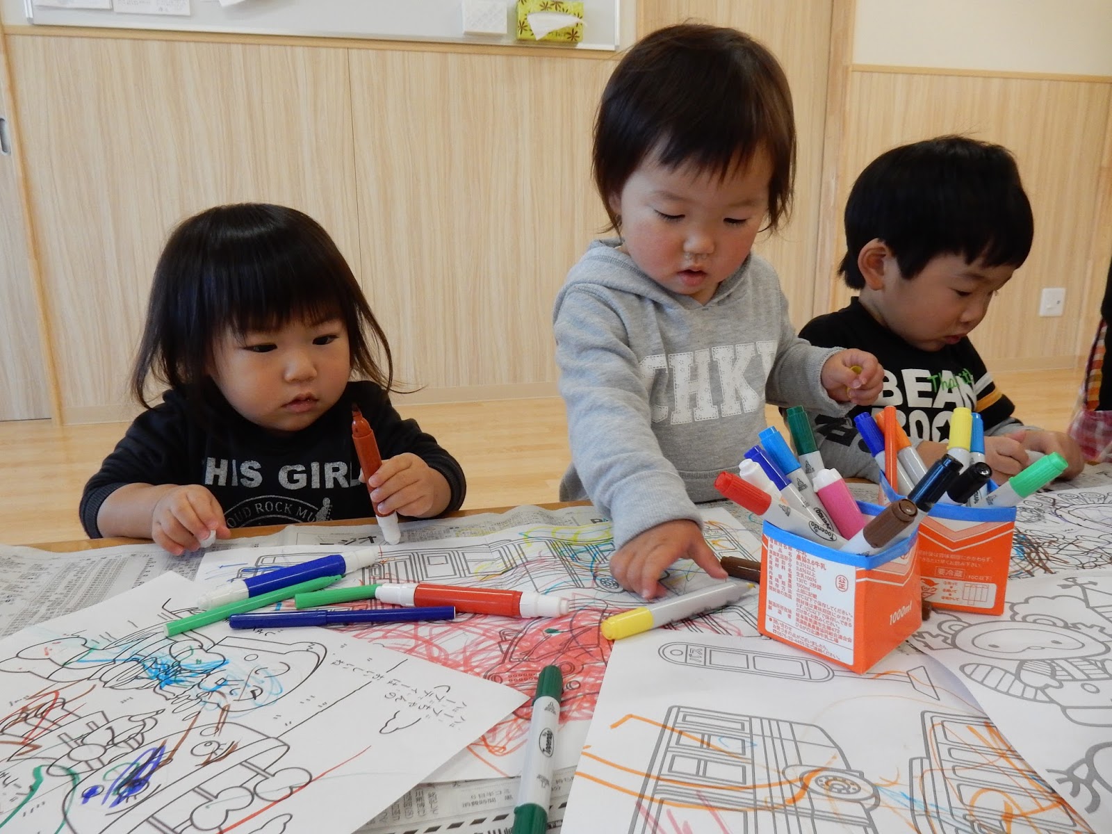 色んなパーツにボンドを付けてペタペタ貼っていきます。だんだんリースに飾りが一杯ついて行くと、とっても嬉しそうにしていました♪待っているお友達も、お絵描きを楽しんでいましたよ!ペンもたくさん!自分で色を選んで好きなように塗っていくのも楽しいね!