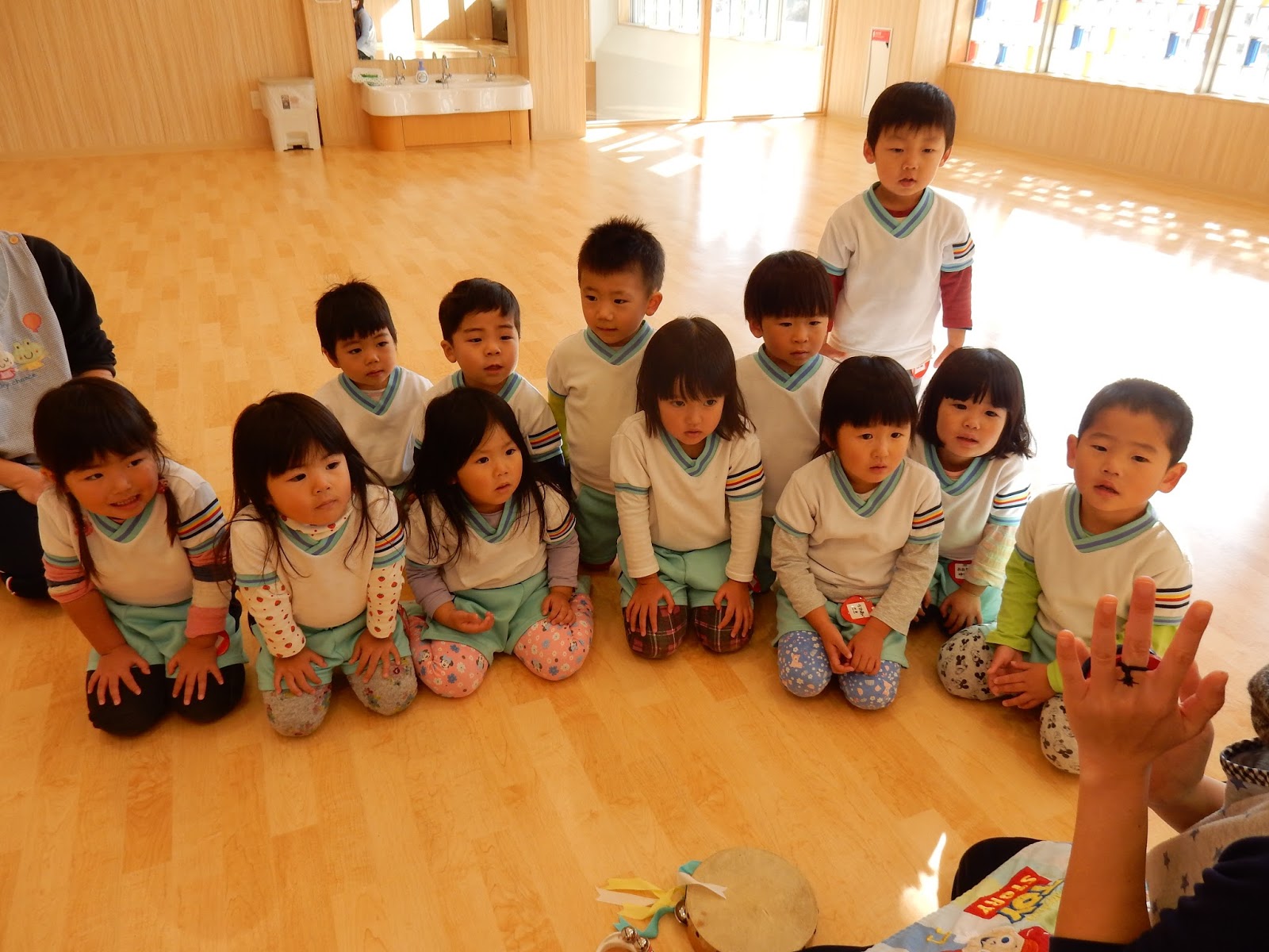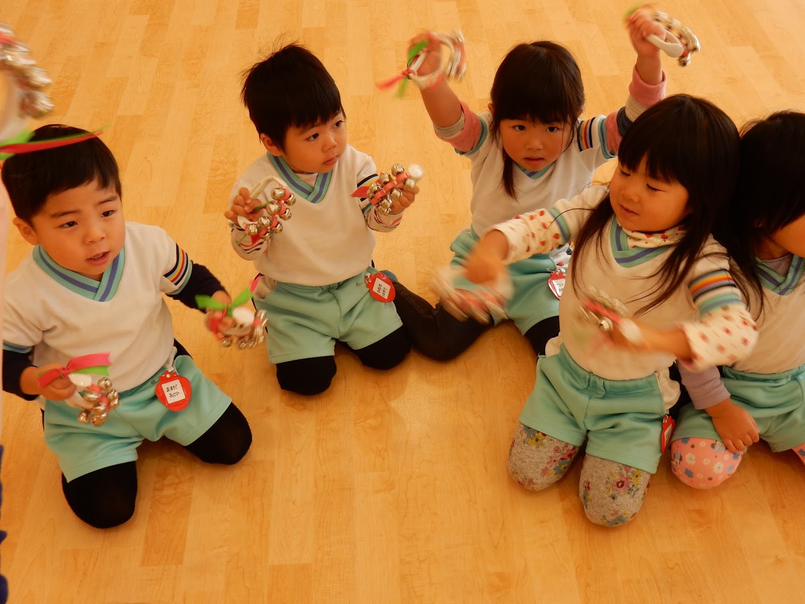 お部屋での活動は、すみれさんは楽器あそび。初めての楽器に興味津々!タンバリン、鈴、カスタネットを順番に触ってみましたよ~。手でたたいたり、上からシャラシャラ~♪と動かしたり。きれいな音に大満足♪これで発表会はひよこさんと一緒に合奏をするんだよ!