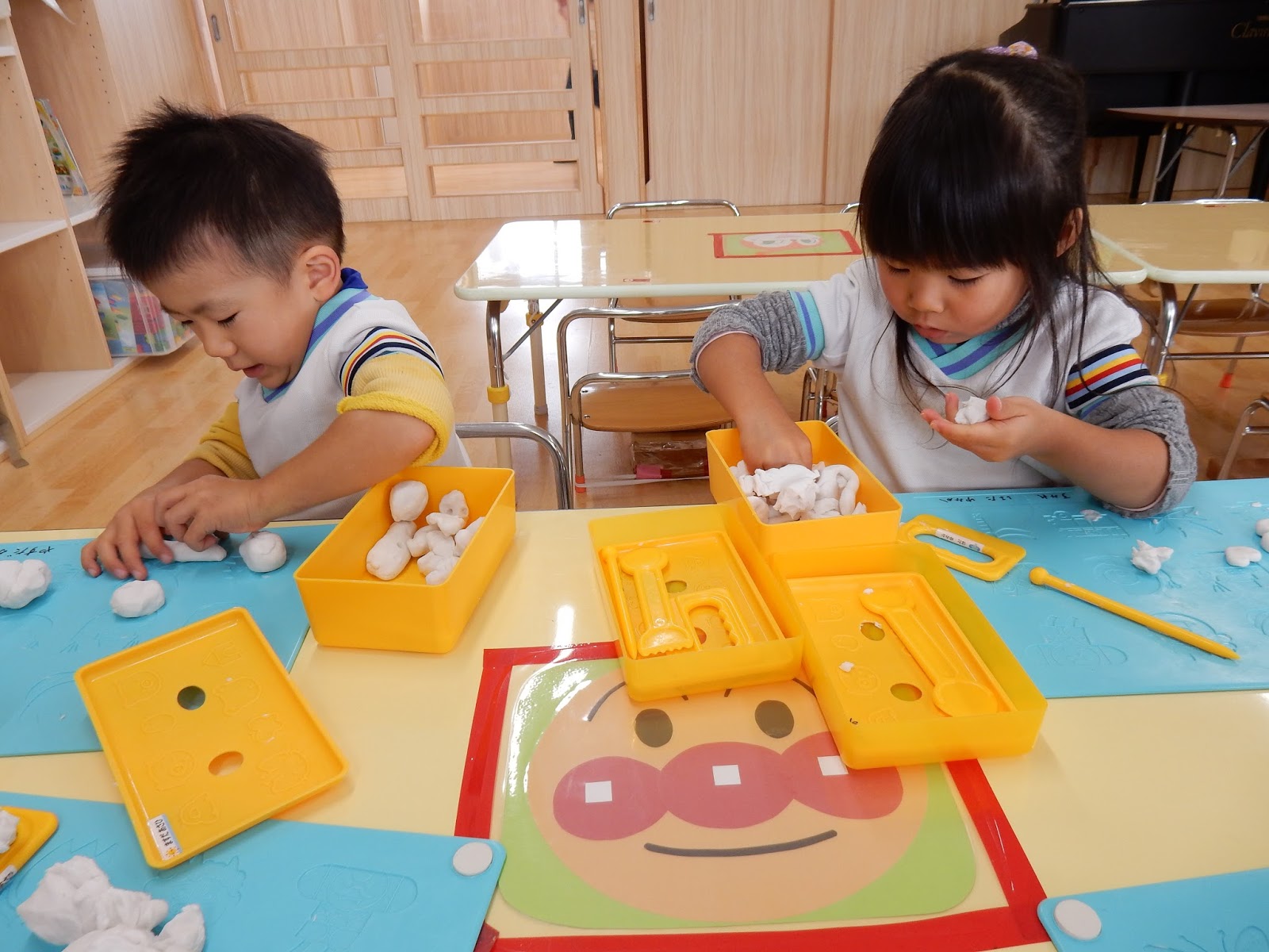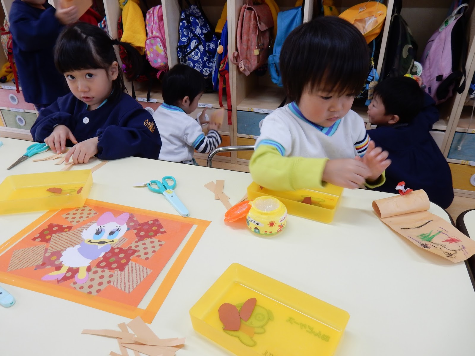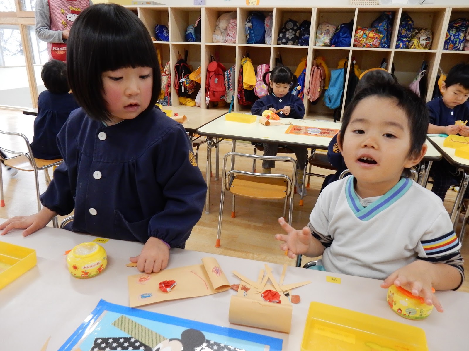 集中して製作ができるすみれさん。作り終わった後もまだまだ時間はたくさんあります!粘土や、おままどと。好きなあそびを見つけてじっくり楽しみます。そんな中でも、お友達と一緒に遊んでみたり、お喋りを楽しんでみたり。この時期の子ども達のやりとりが、かわいらしいですね♪